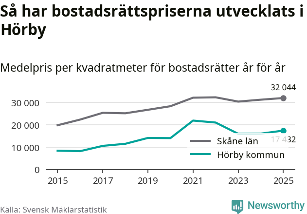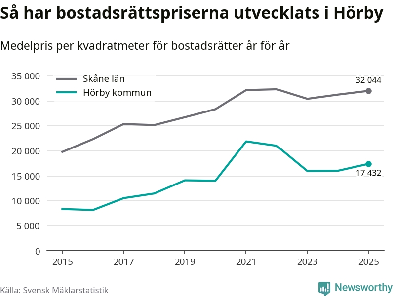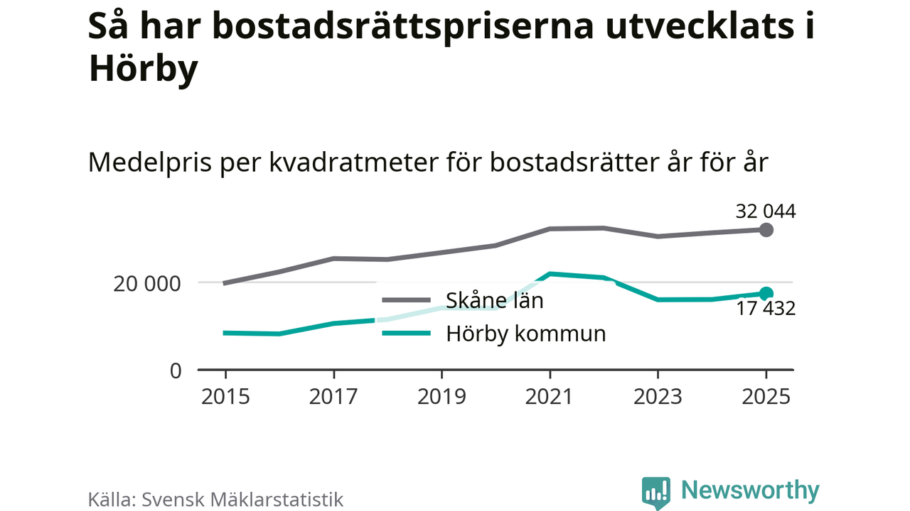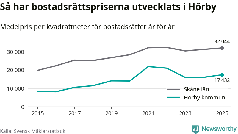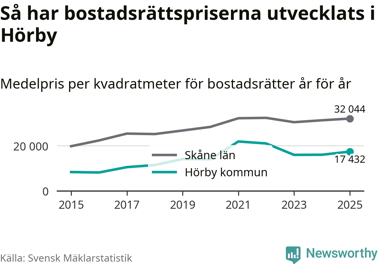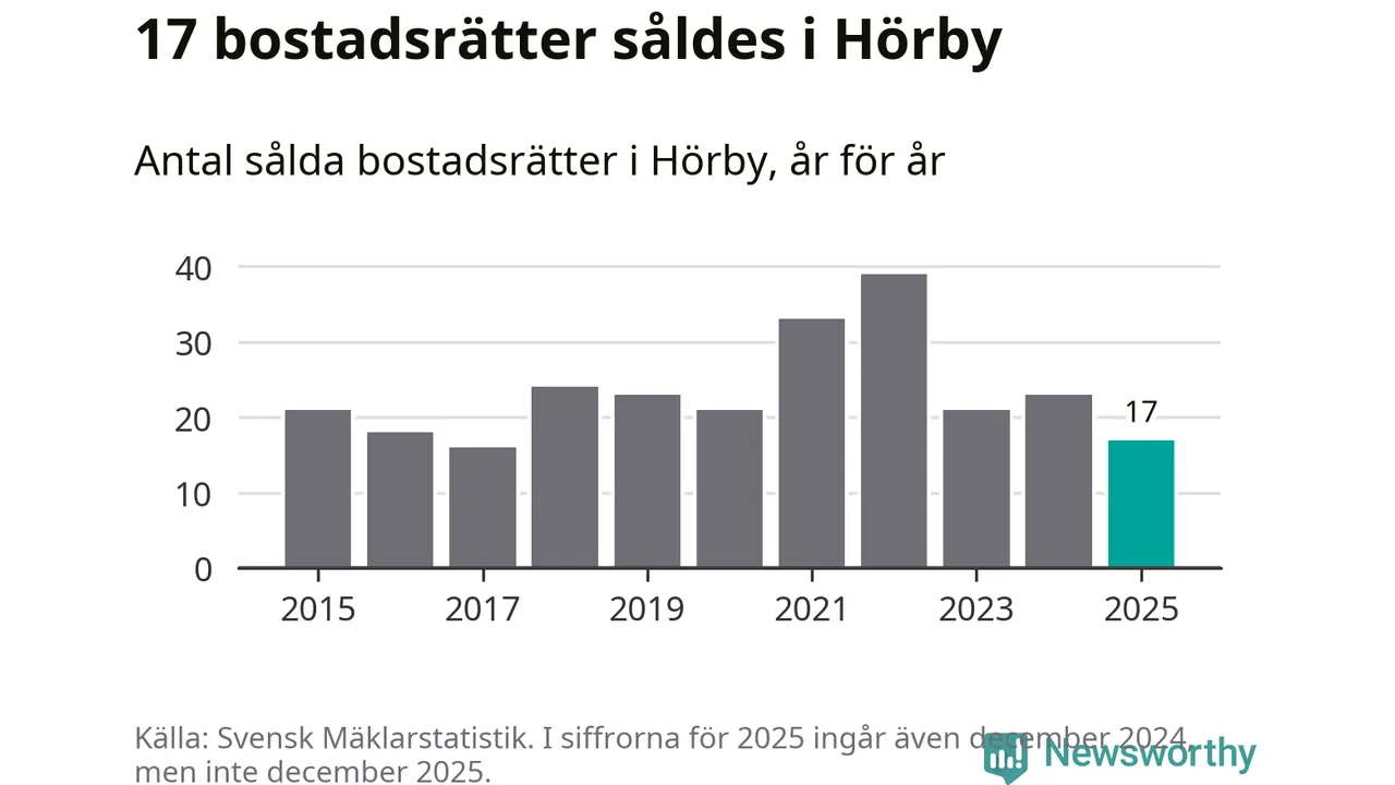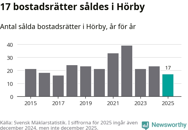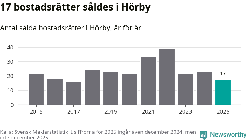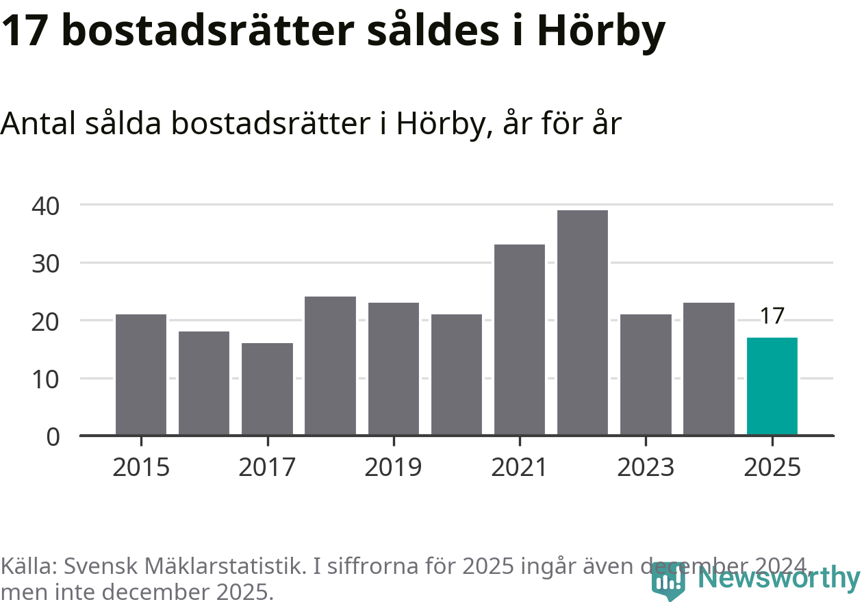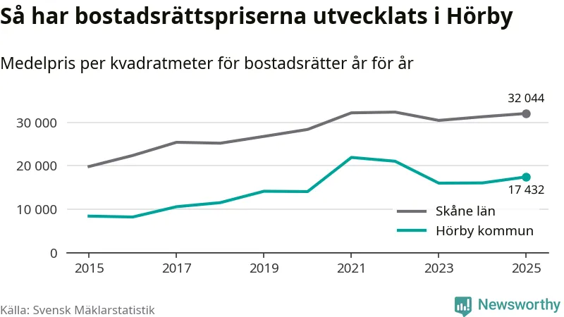 När det gäller bostadsrätter i Hörby kommun såldes 17 under året. Snittet per kvadratmeter landade på omkring 17 400 kronor. Det är en ökning jämfört med förra året.