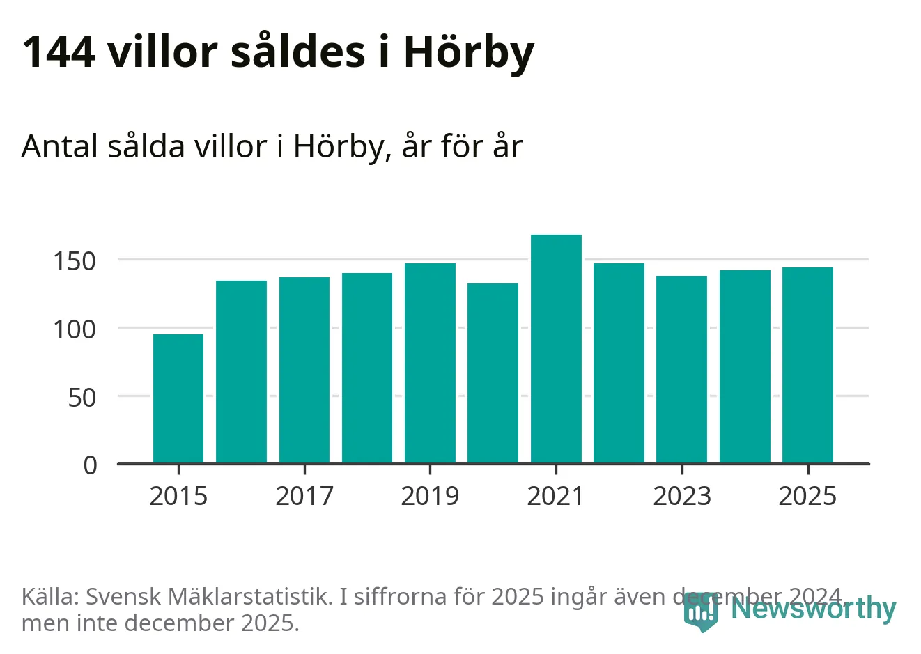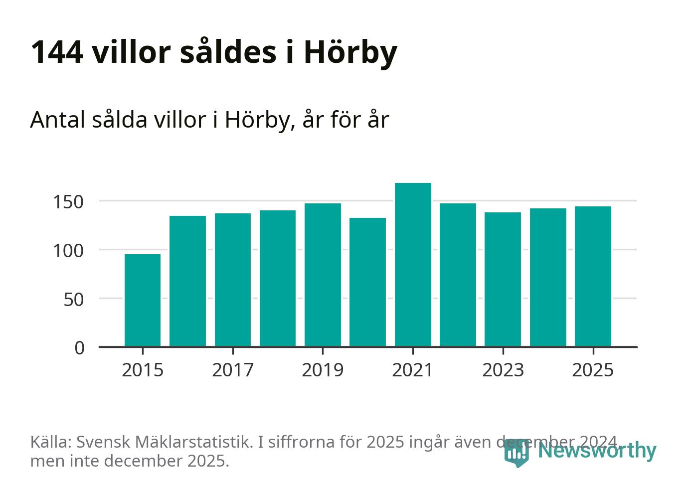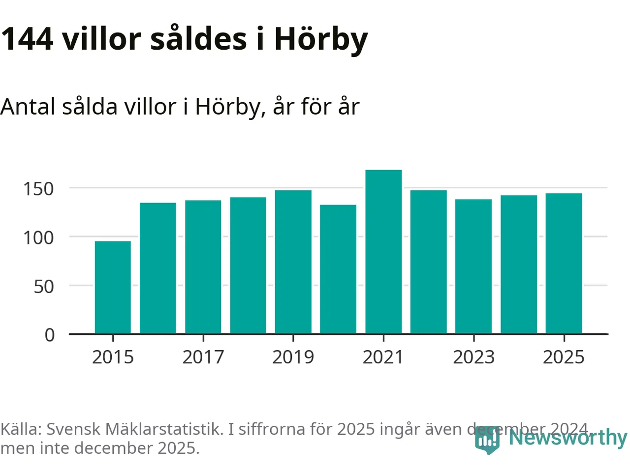 Däremot ökade antalet sålda villor något. Totalt såldes 144 villor, att jämföra med 142 under 2024. Det är andra året i rad som antalet sålda villor ökar i kommunen.