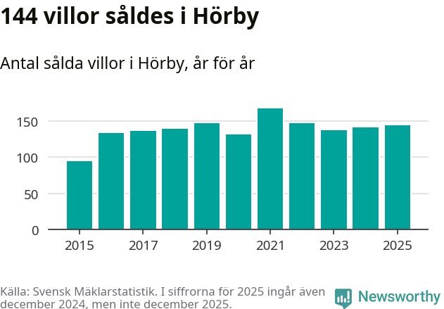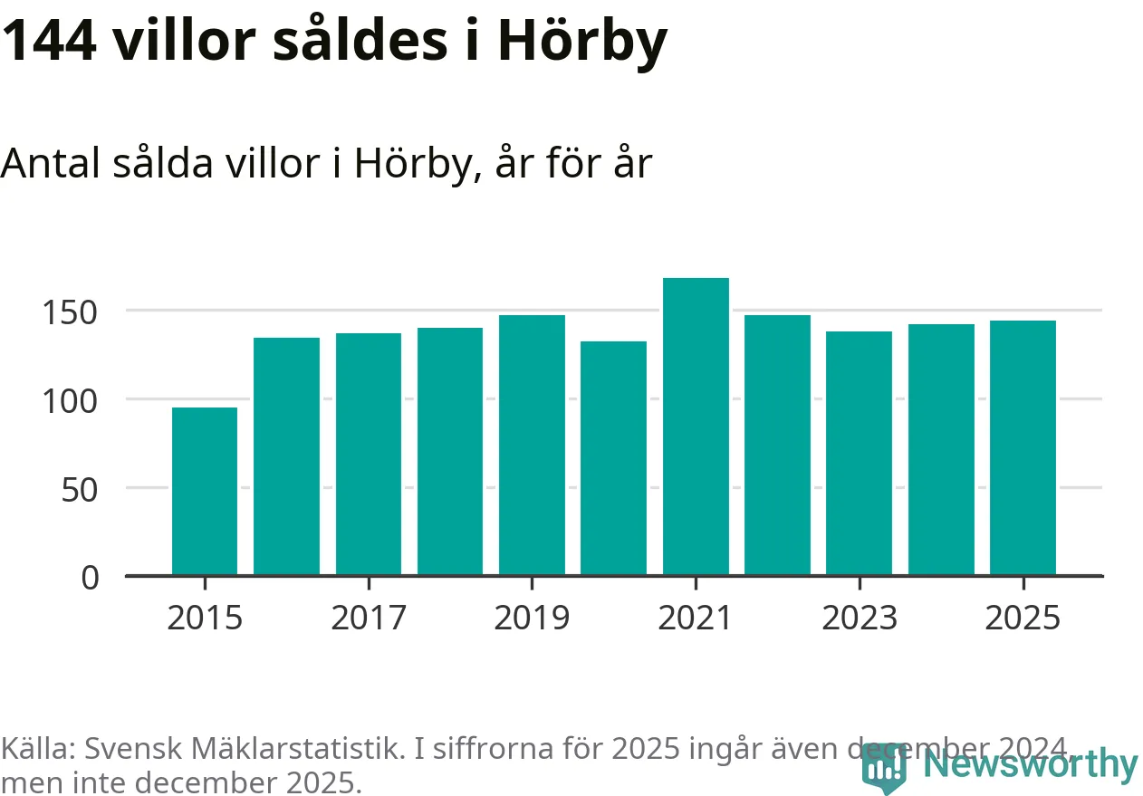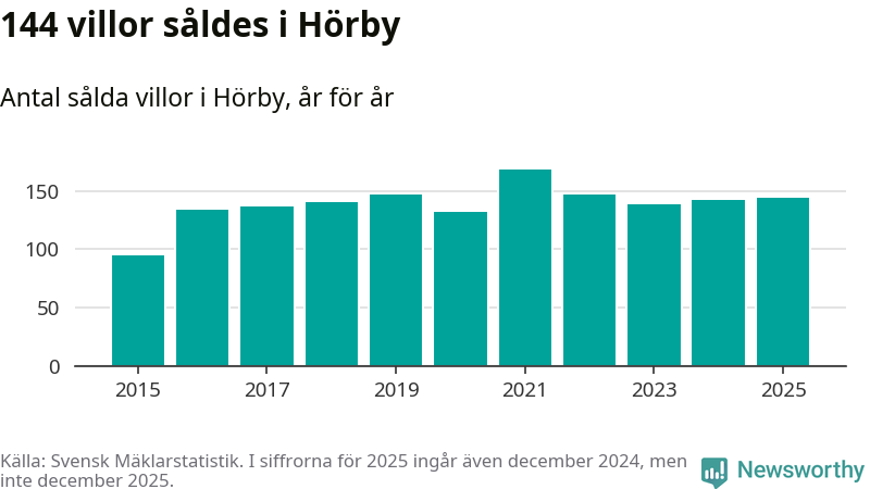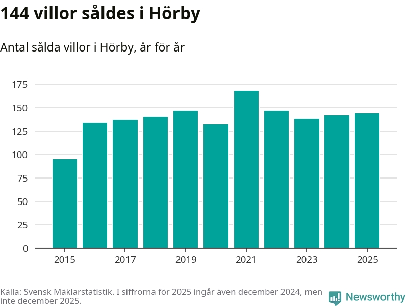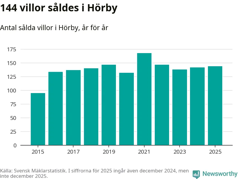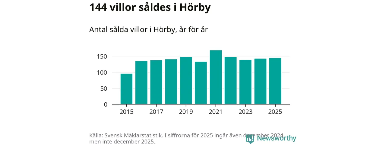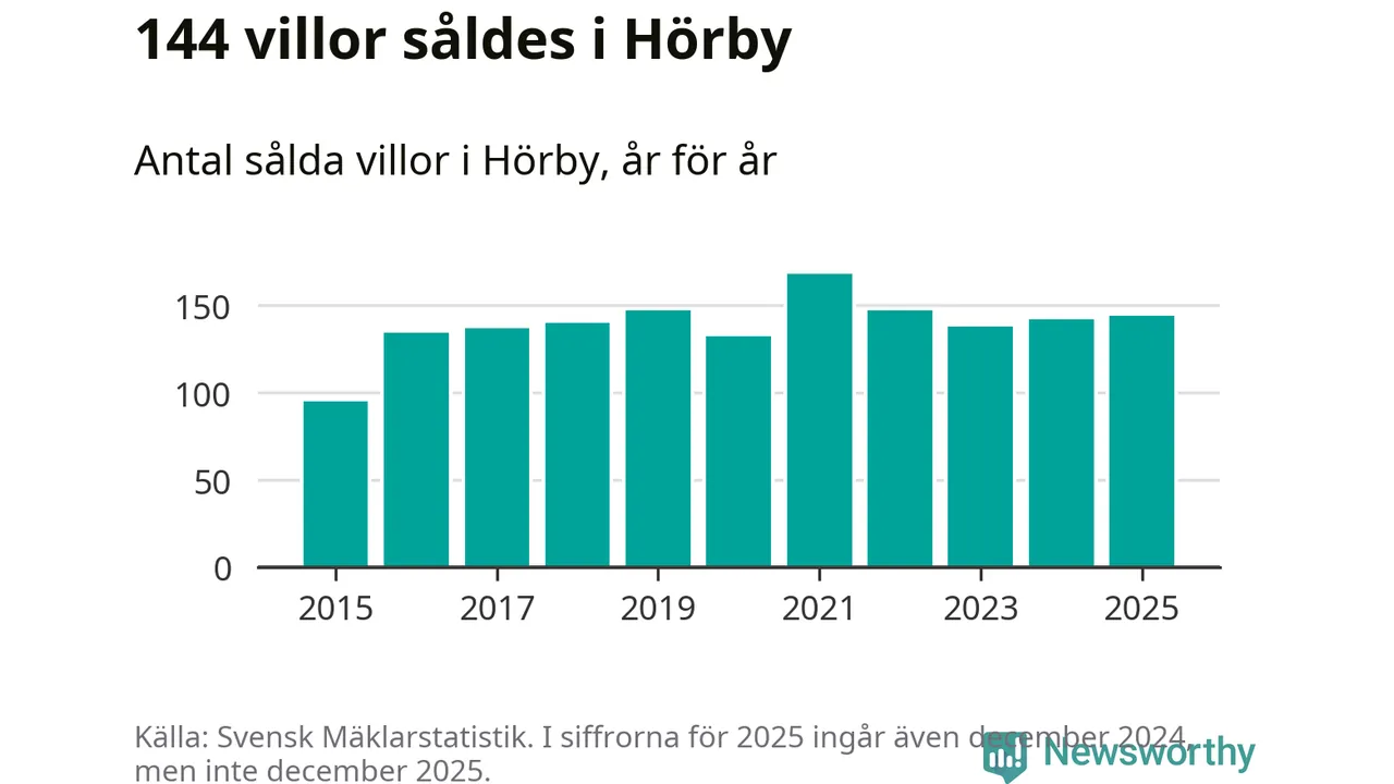 Däremot ökade antalet sålda villor något. Totalt såldes 144 villor, att jämföra med 142 under 2024. Det är andra året i rad som antalet sålda villor ökar i kommunen.