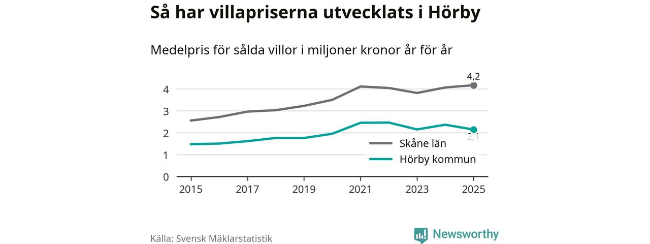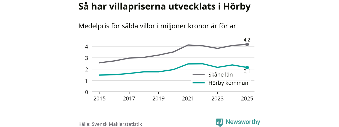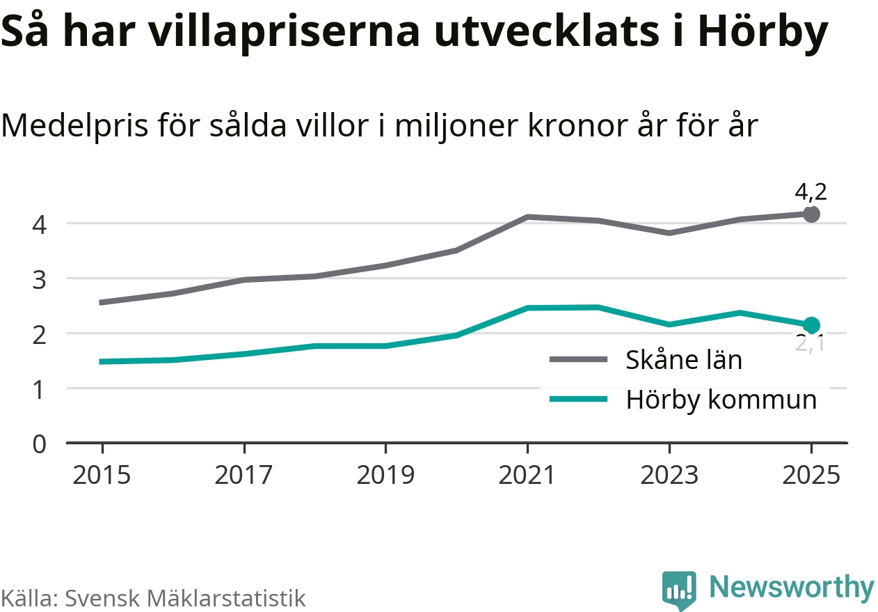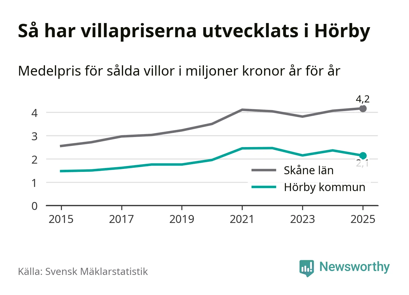 2,1 miljoner kronor är medelpriset för de villor som såldes i Hörby kommun under året, eller 19 005 kronor per kvadratmeter. Det innebär en prisminskning med nio procent på ett år.