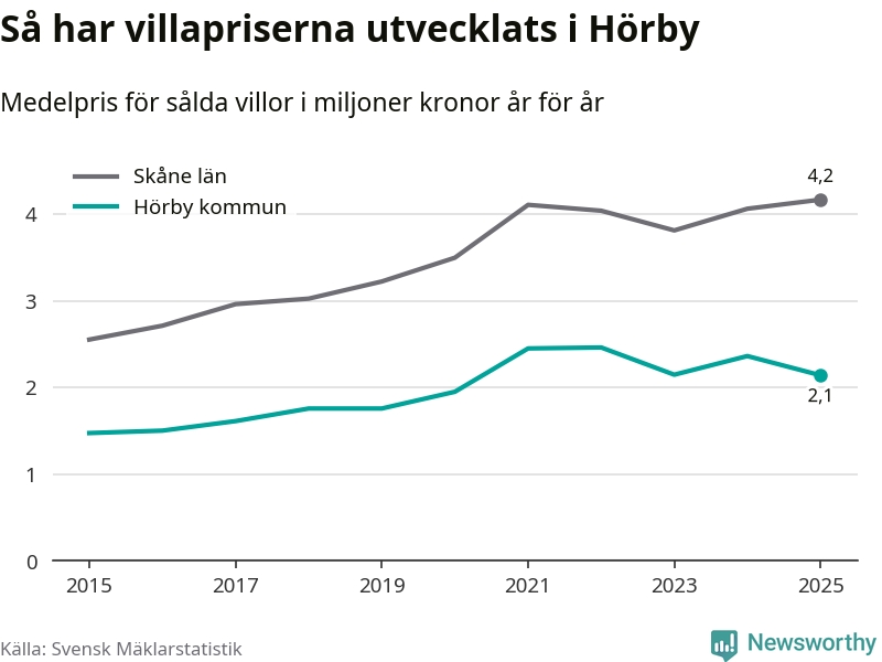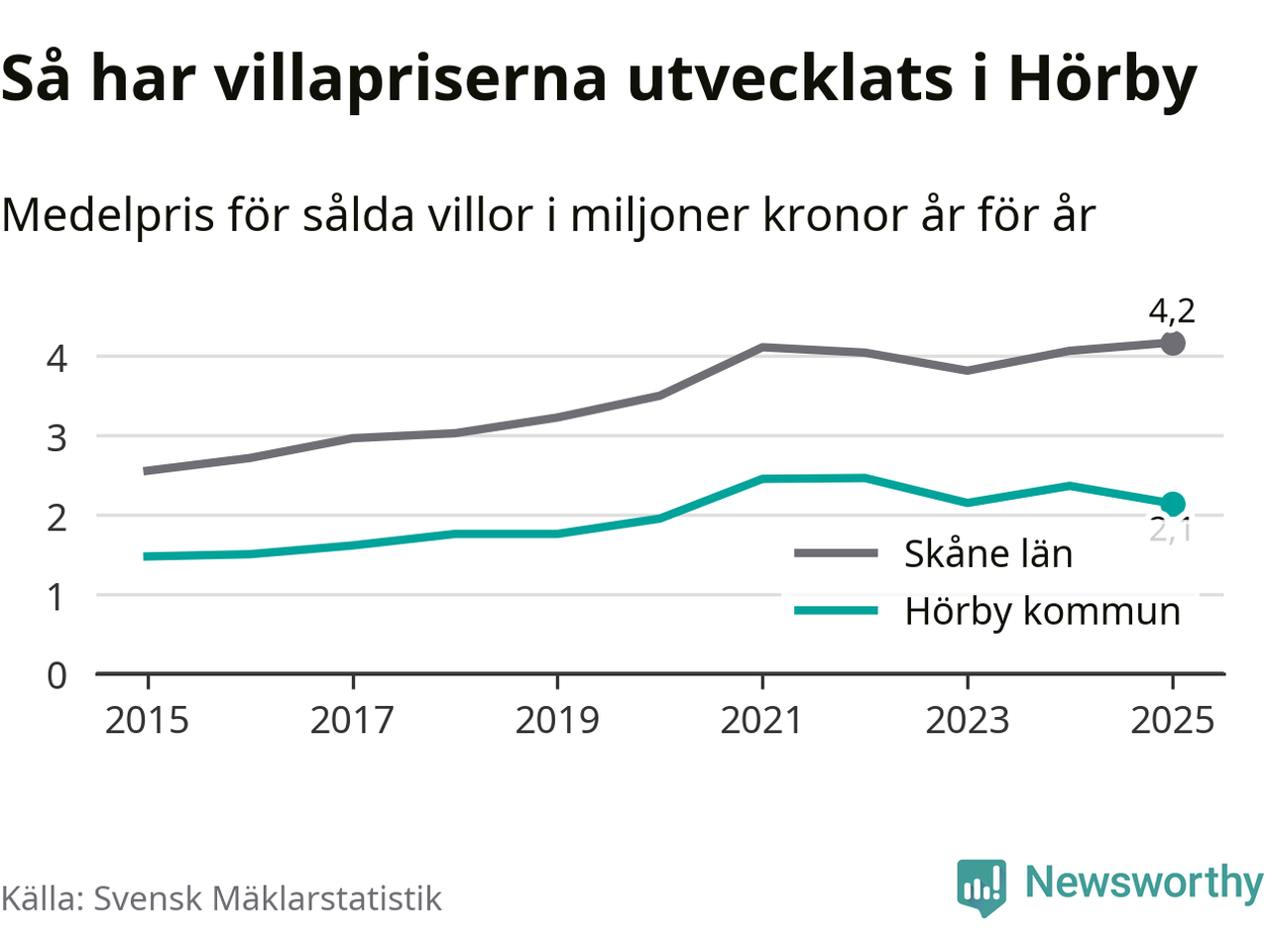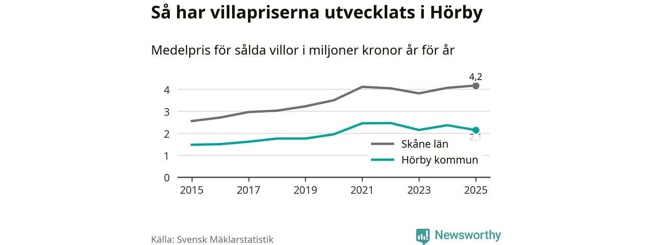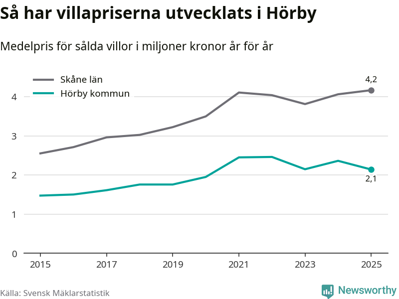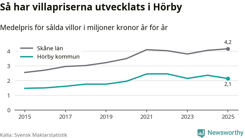 2,1 miljoner kronor är medelpriset för de villor som såldes i Hörby kommun under året, eller 19 005 kronor per kvadratmeter. Det innebär en prisminskning med nio procent på ett år.