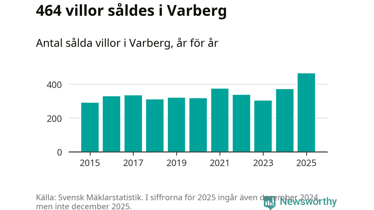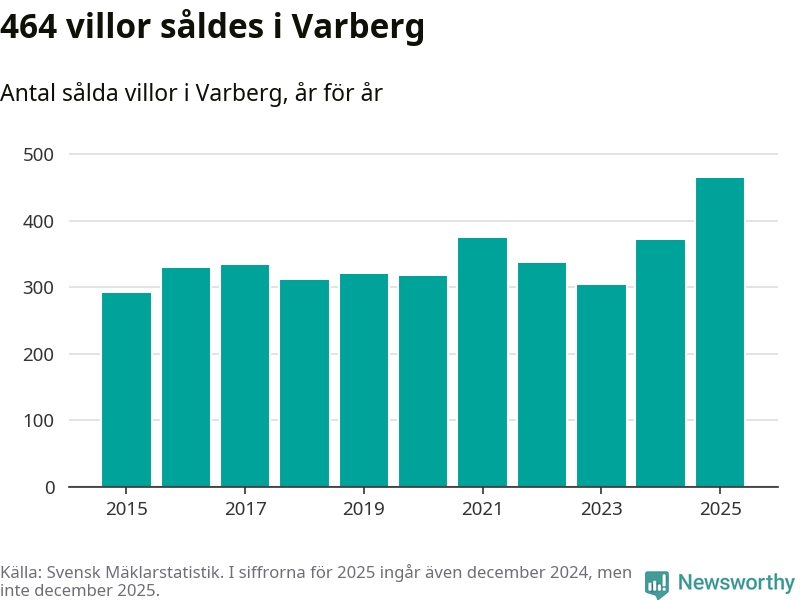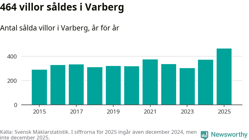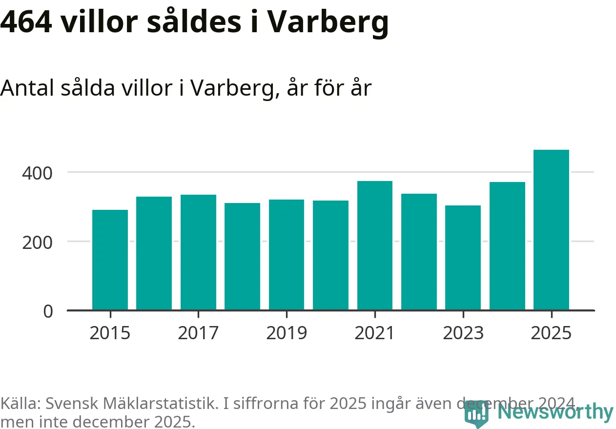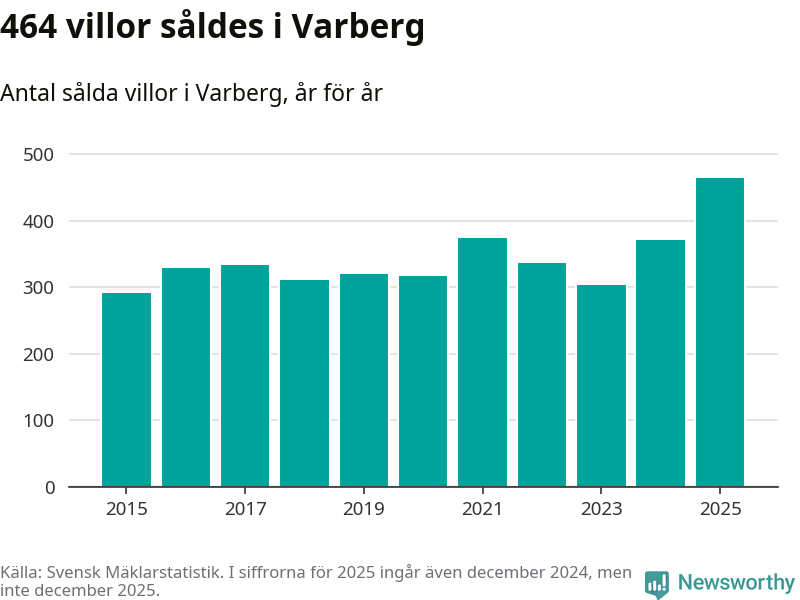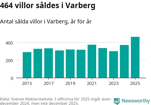 Antalet sålda villor ökade också. Totalt såldes 464 villor, att jämföra med 371 under 2024. Det är fler än något annat år sedan 2015.