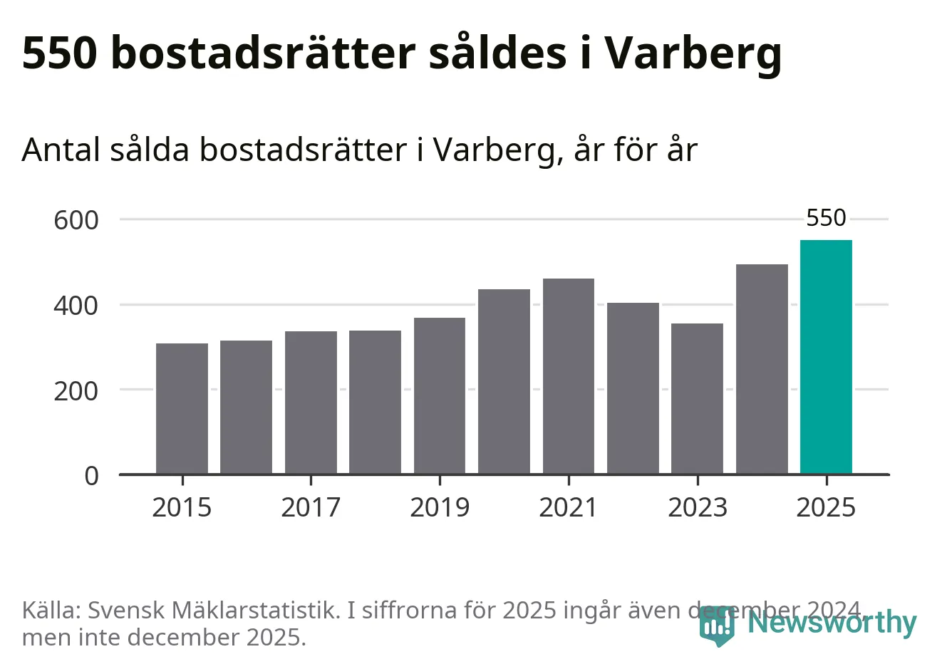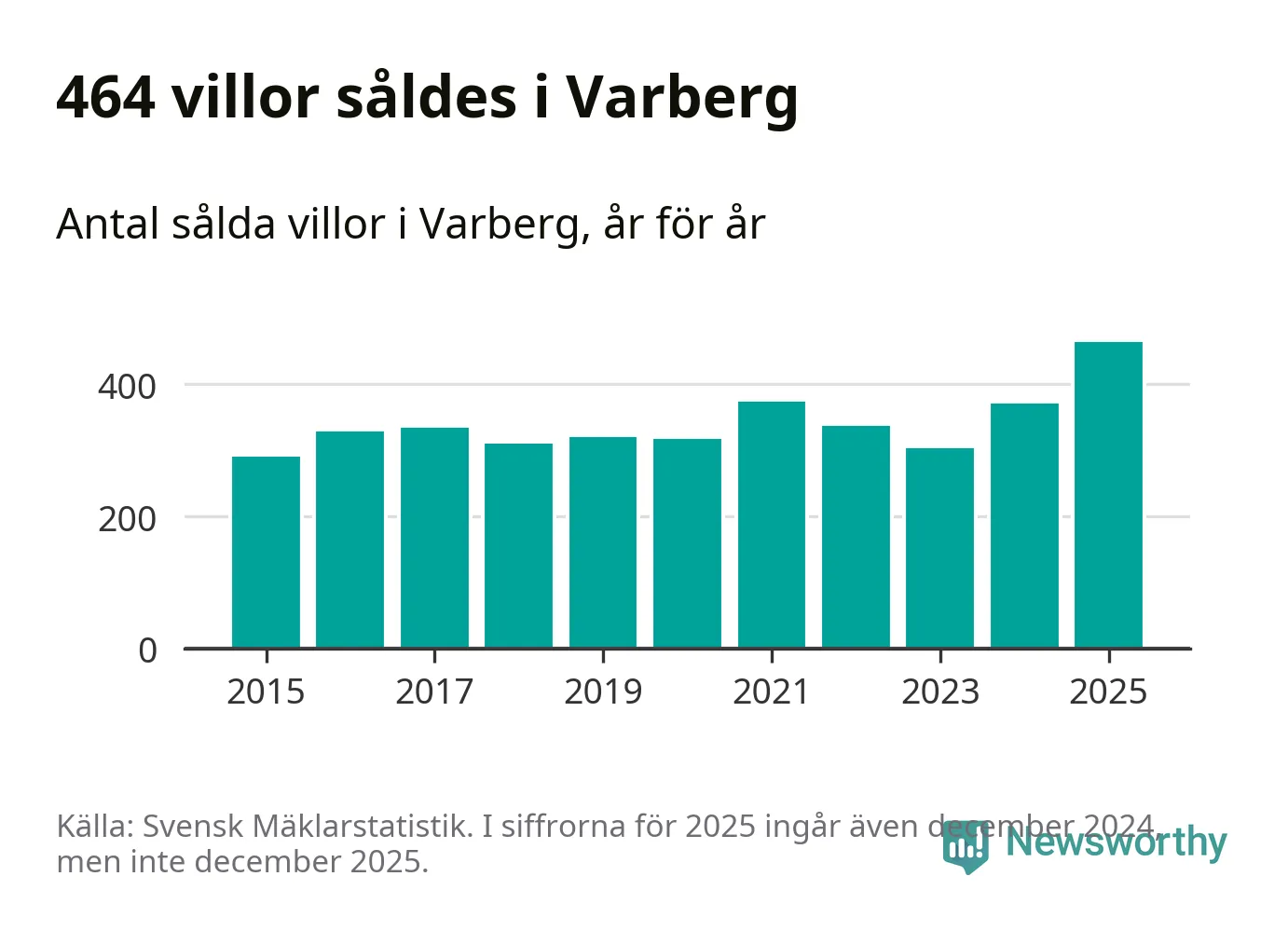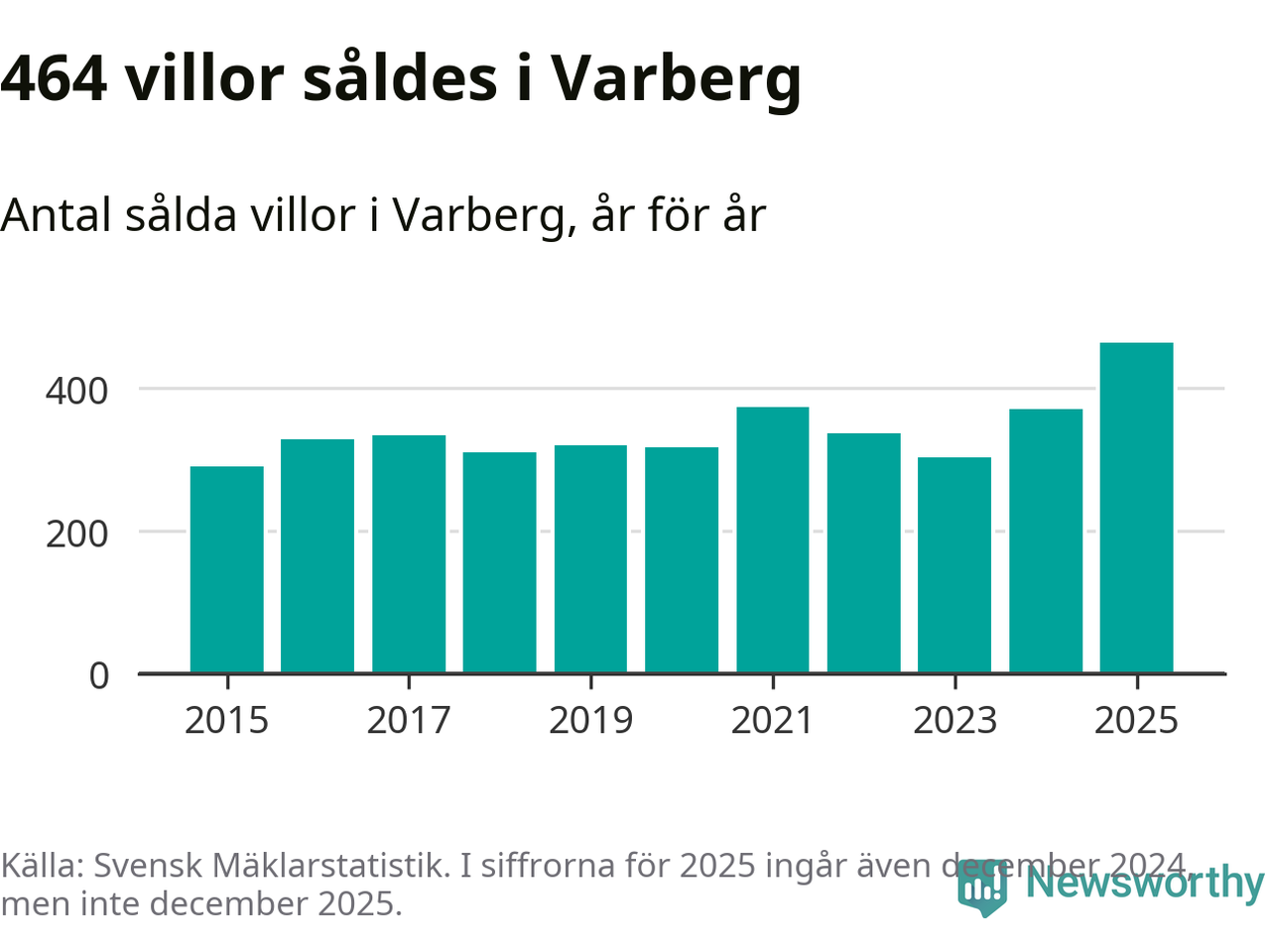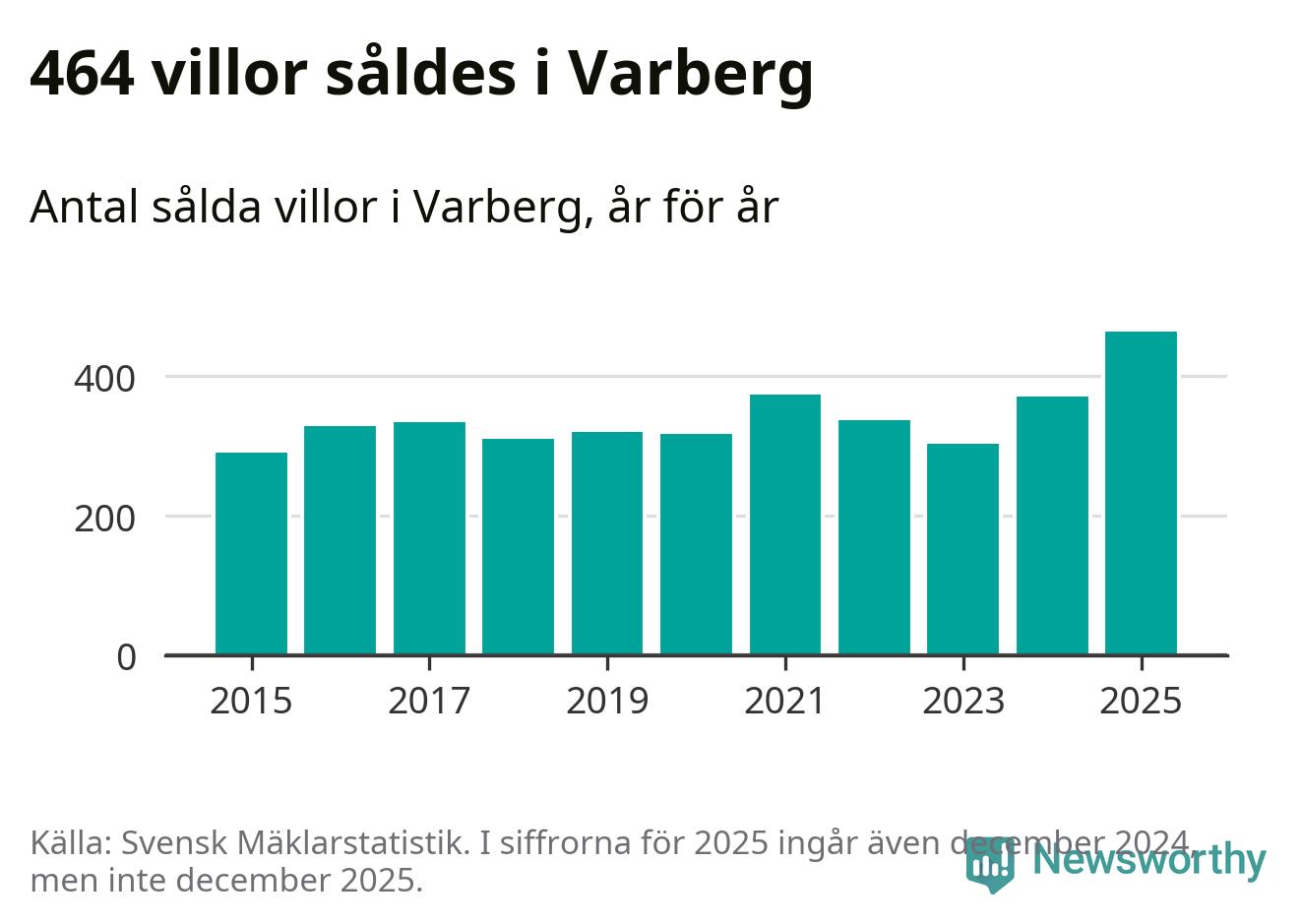 Antalet sålda villor ökade också. Totalt såldes 464 villor, att jämföra med 371 under 2024. Det är fler än något annat år sedan 2015.