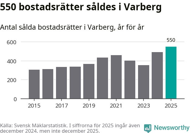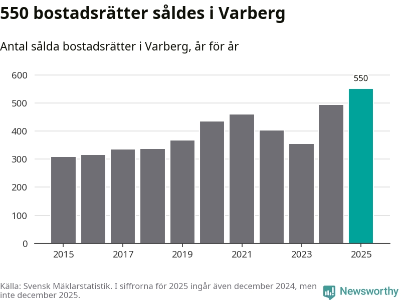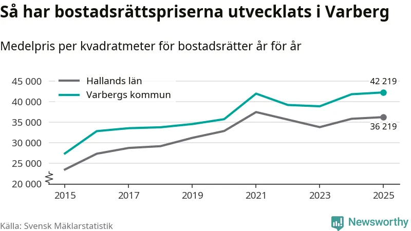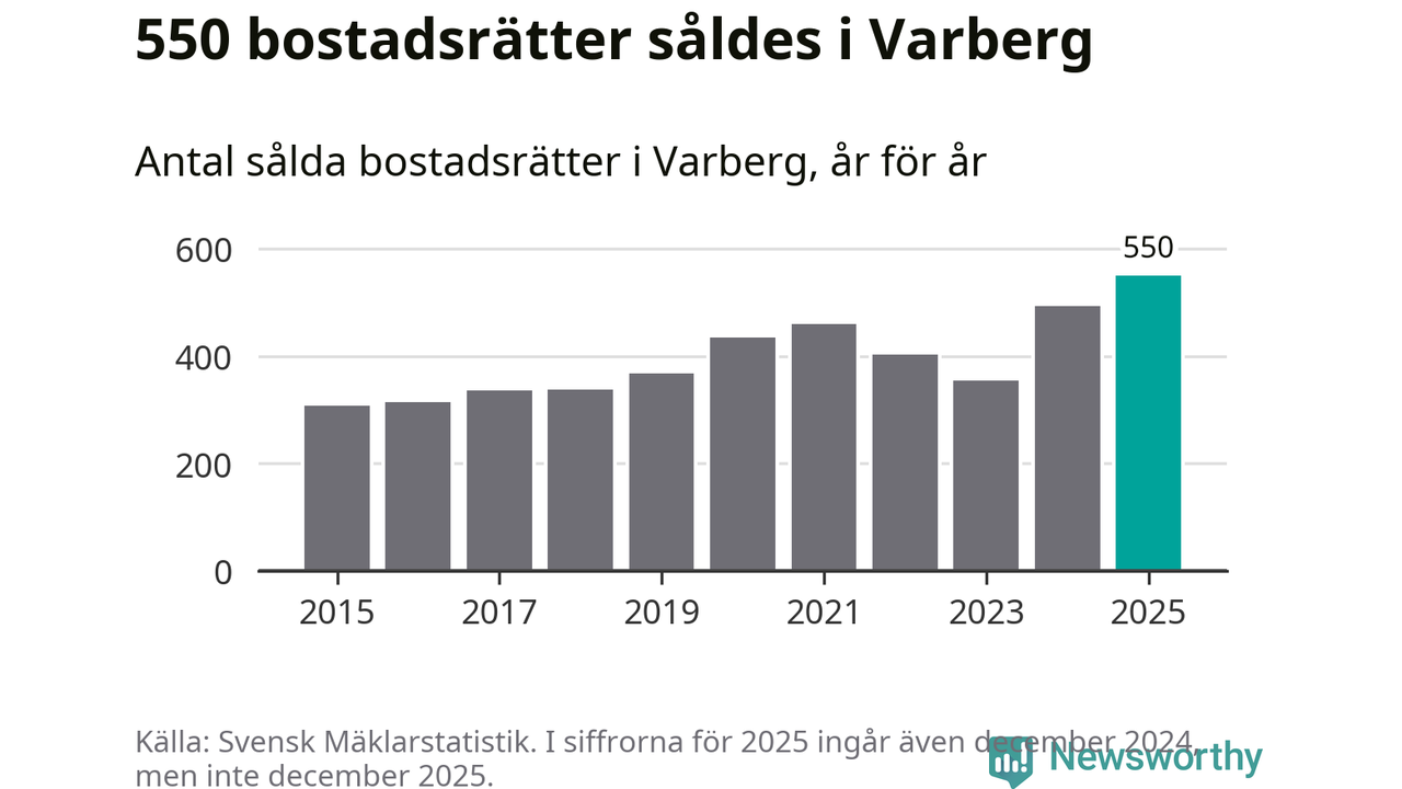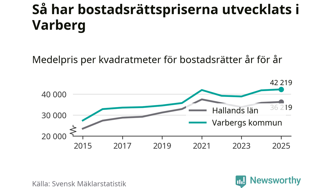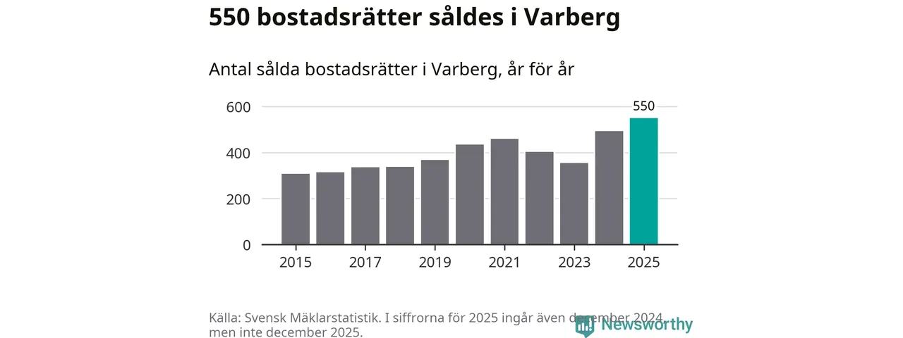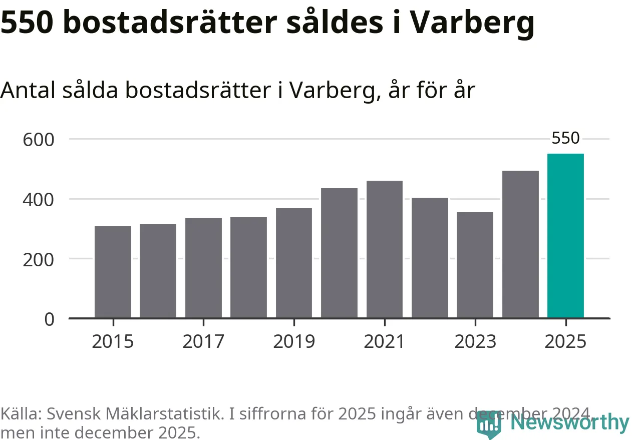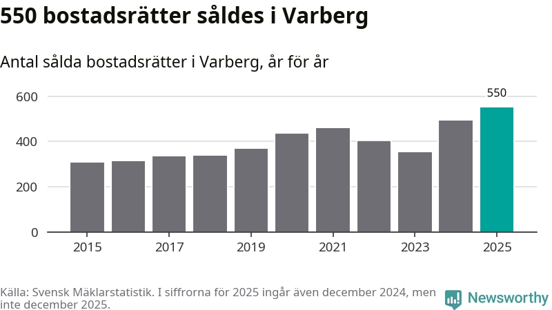 Det såldes totalt 550 bostadsrätter i Varbergs kommun under året. Det är fler än något annat år sedan 2015. Genomsnittspriset per kvadratmeter landade på 42 219 kronor. Det är en ökning med en procent i kommunen på ett år och den högsta årsnivån på över ett decennium. Bryter man upp siffrorna per kvartal har dock ännu högre bostadsrättspriser noterats i Varberg vintern 2024/25.