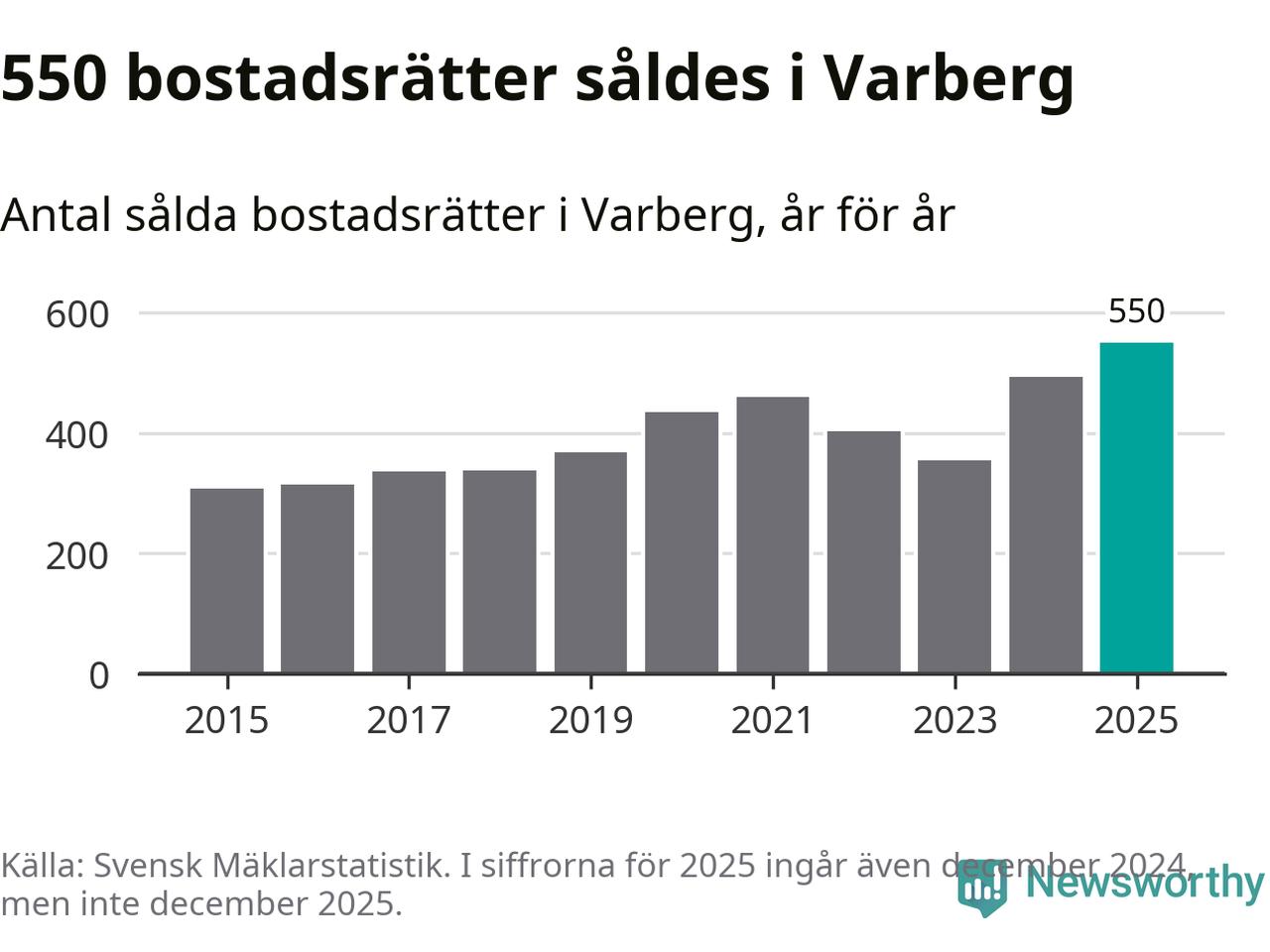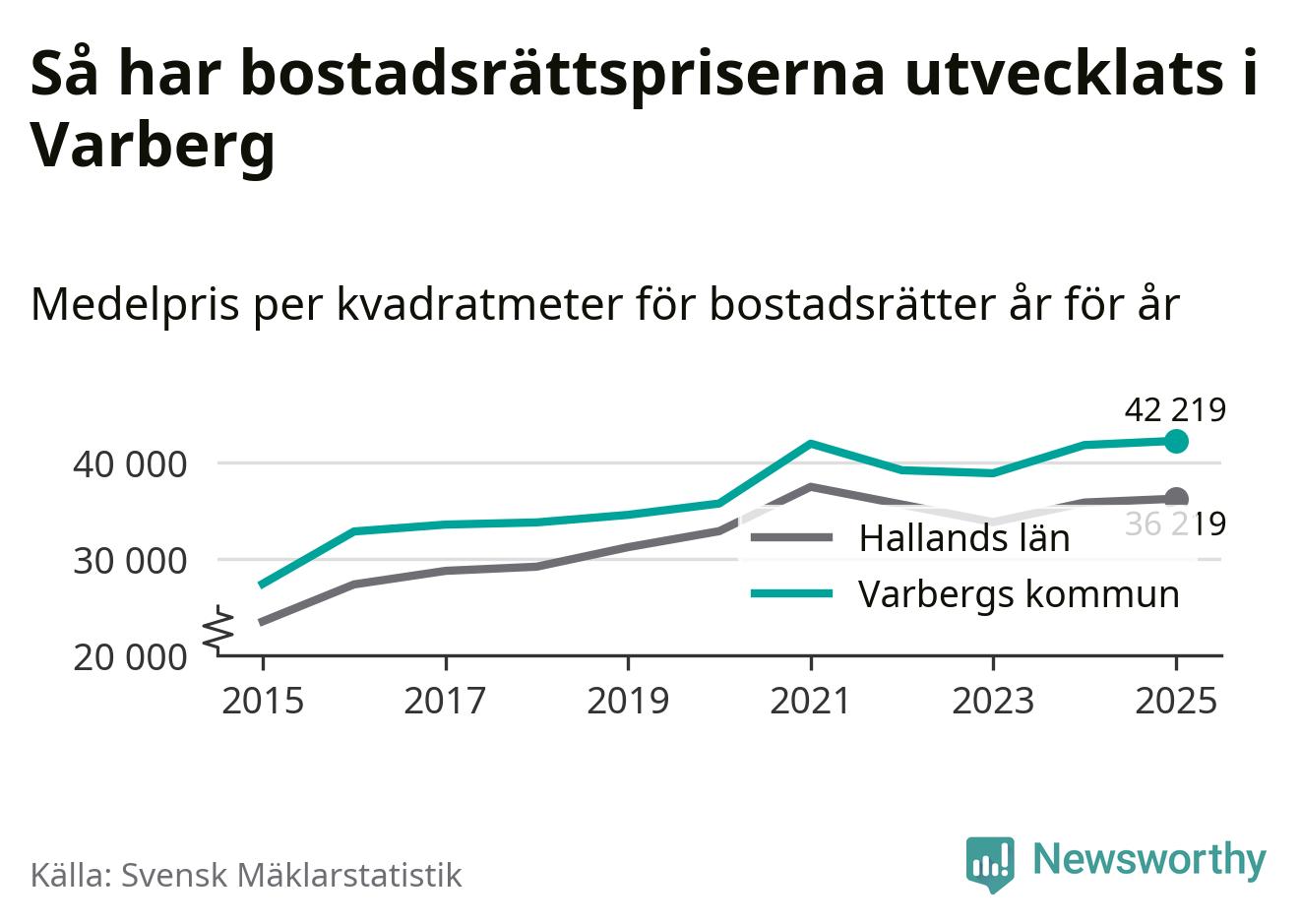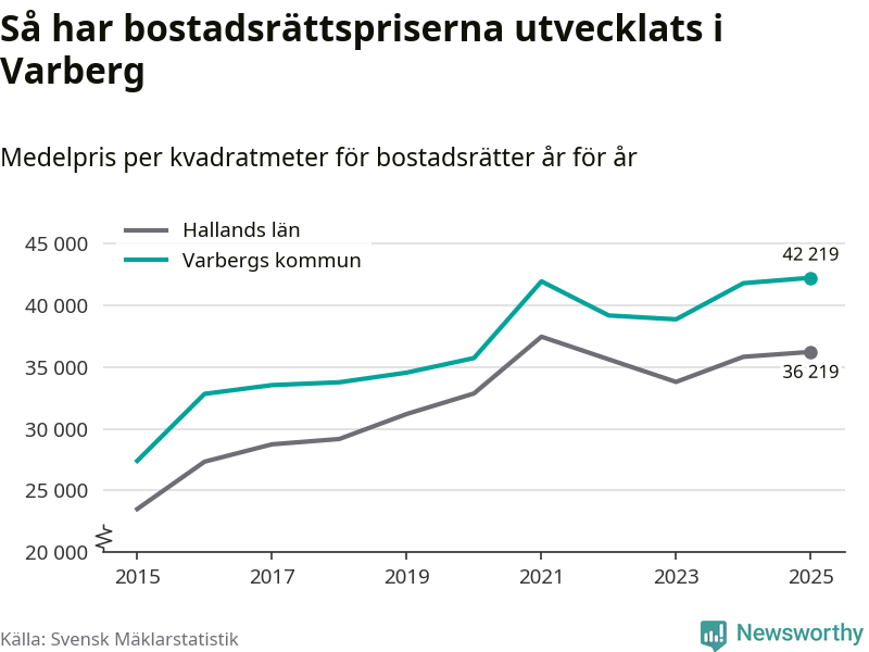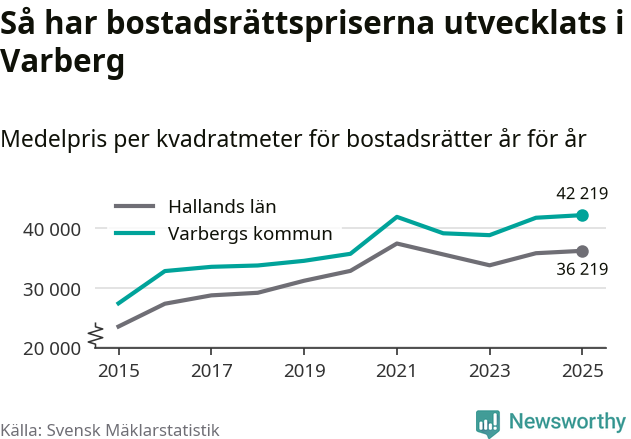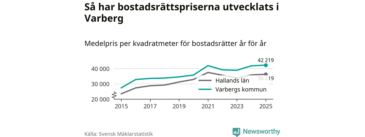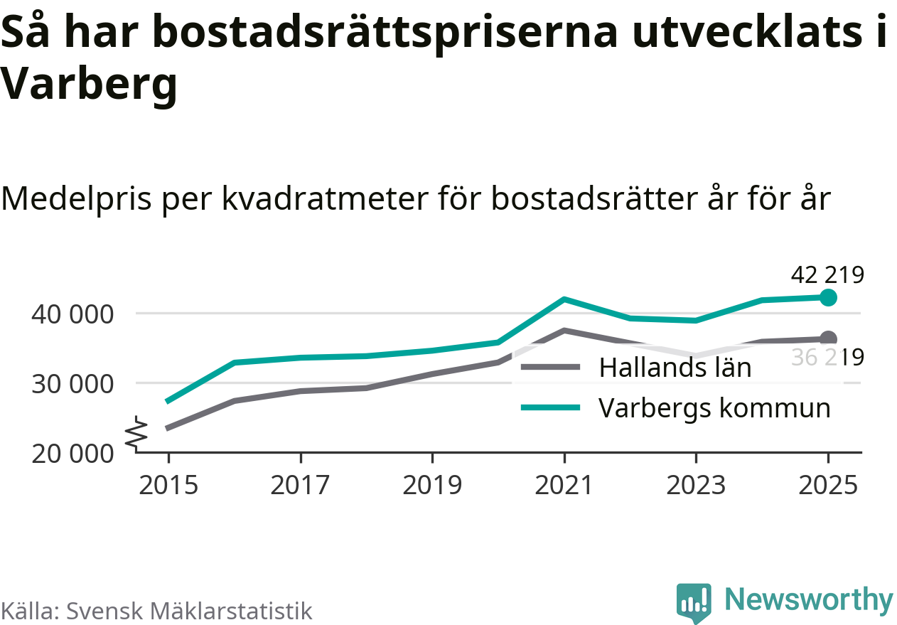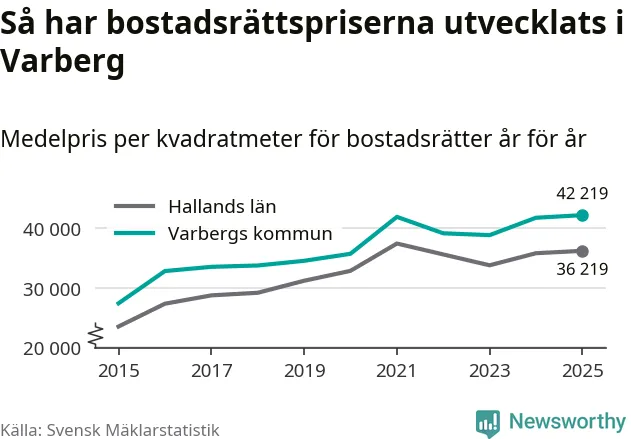 Det såldes totalt 550 bostadsrätter i Varbergs kommun under året. Det är fler än något annat år sedan 2015. Genomsnittspriset per kvadratmeter landade på 42 219 kronor. Det är en ökning med en procent i kommunen på ett år och den högsta årsnivån på över ett decennium. Bryter man upp siffrorna per kvartal har dock ännu högre bostadsrättspriser noterats i Varberg vintern 2024/25.