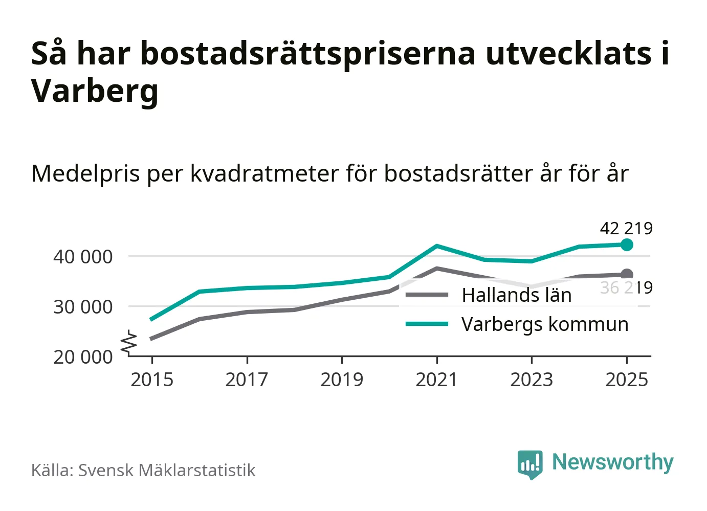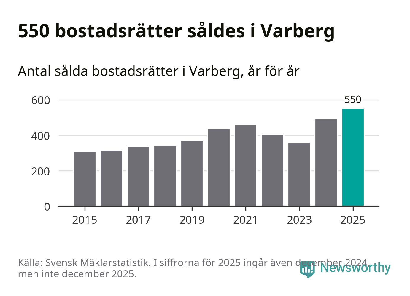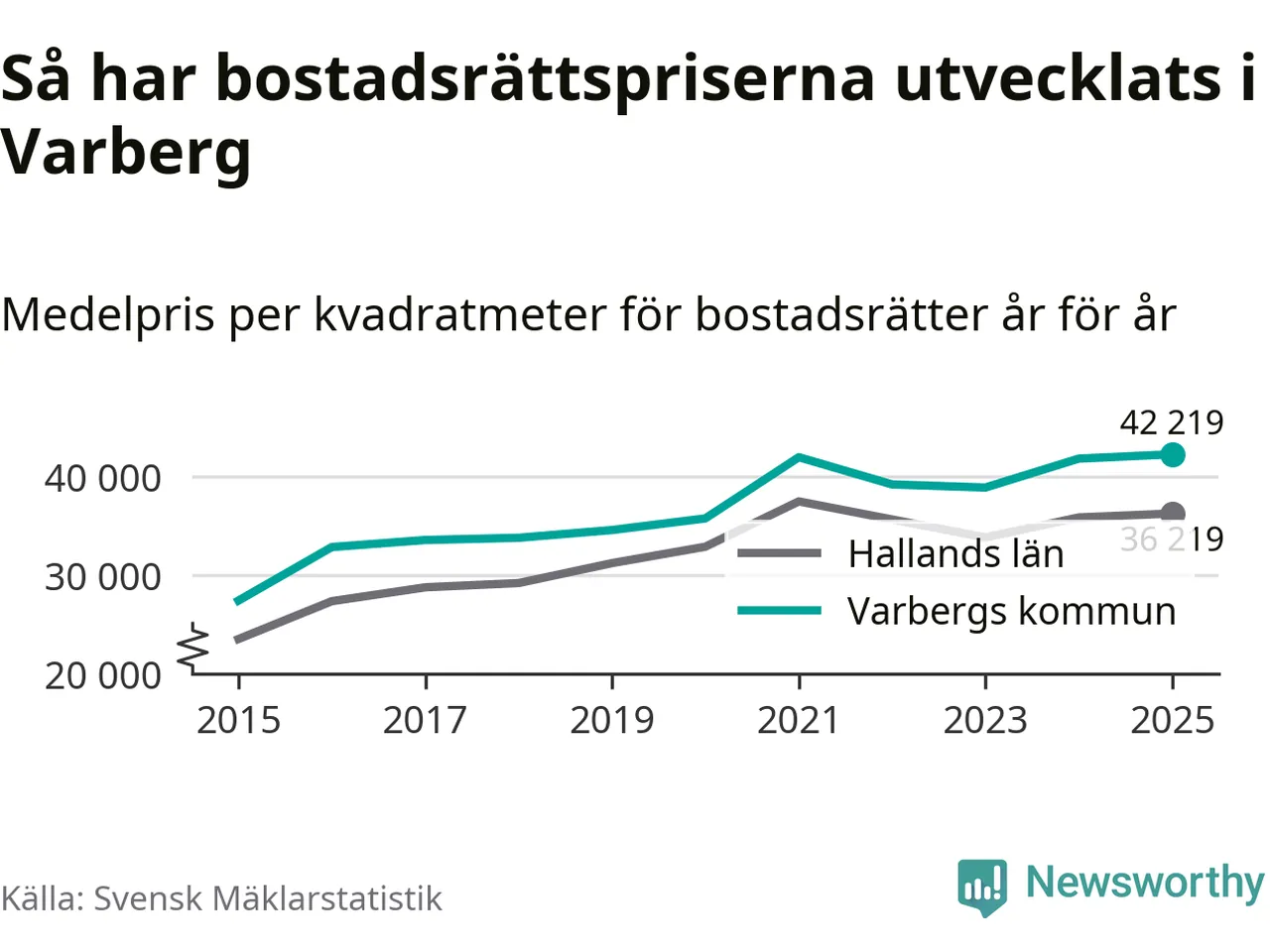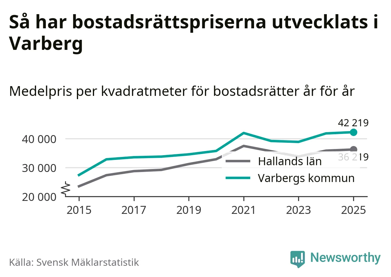 Det såldes totalt 550 bostadsrätter i Varbergs kommun under året. Det är fler än något annat år sedan 2015. Genomsnittspriset per kvadratmeter landade på 42 219 kronor. Det är en ökning med en procent i kommunen på ett år och den högsta årsnivån på över ett decennium. Bryter man upp siffrorna per kvartal har dock ännu högre bostadsrättspriser noterats i Varberg vintern 2024/25.