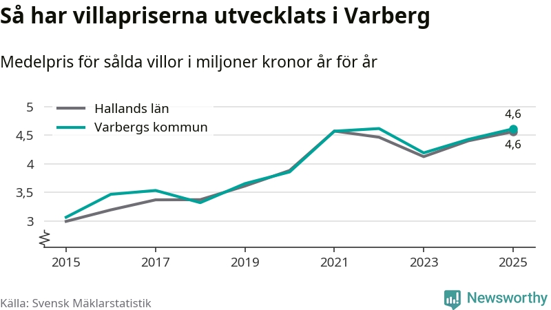 Priserna på villor i Hallands län som helhet har ökat med fyra procent sedan förra året. Dock har de inte nått samma nivåer som toppåret i länet 2021.