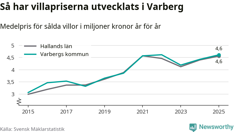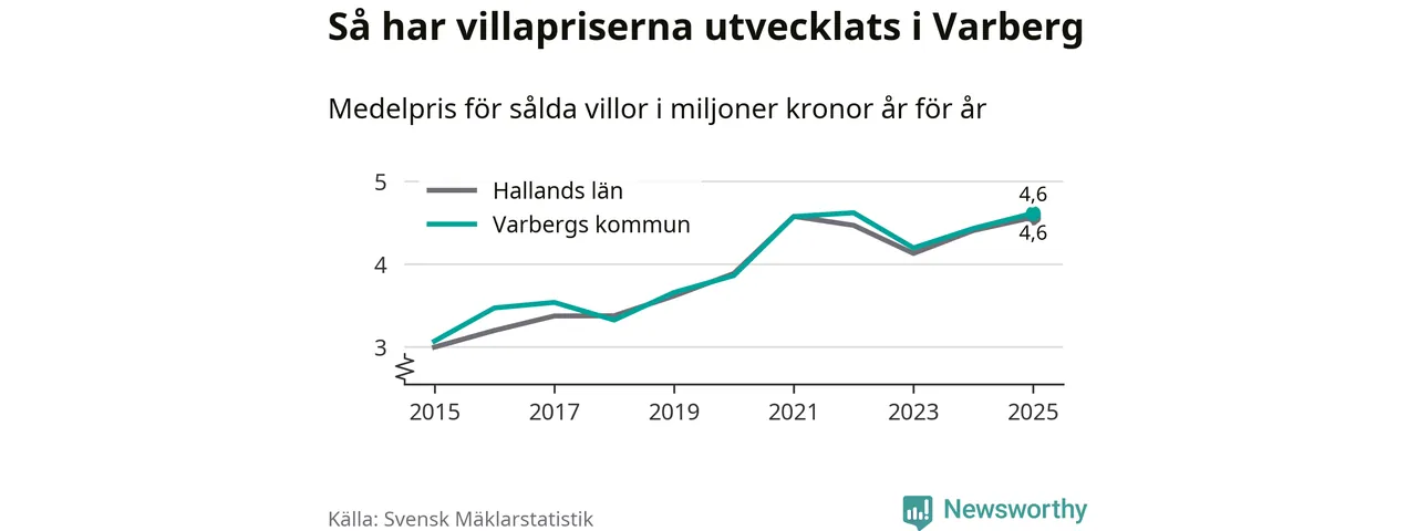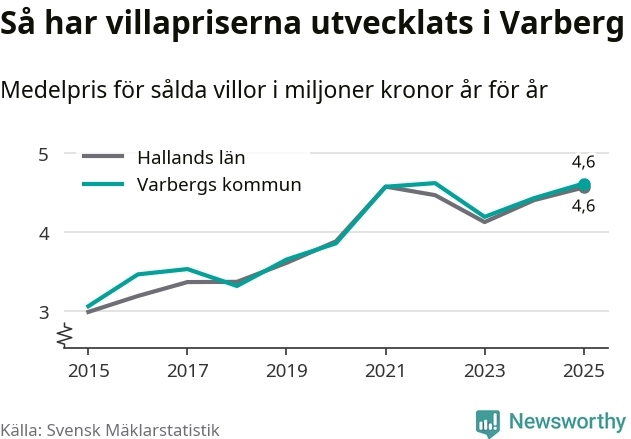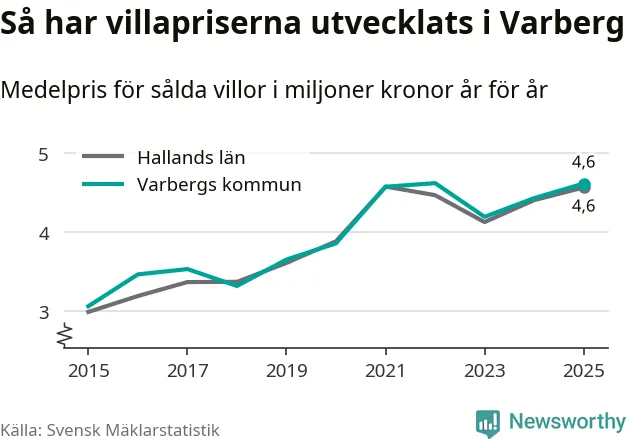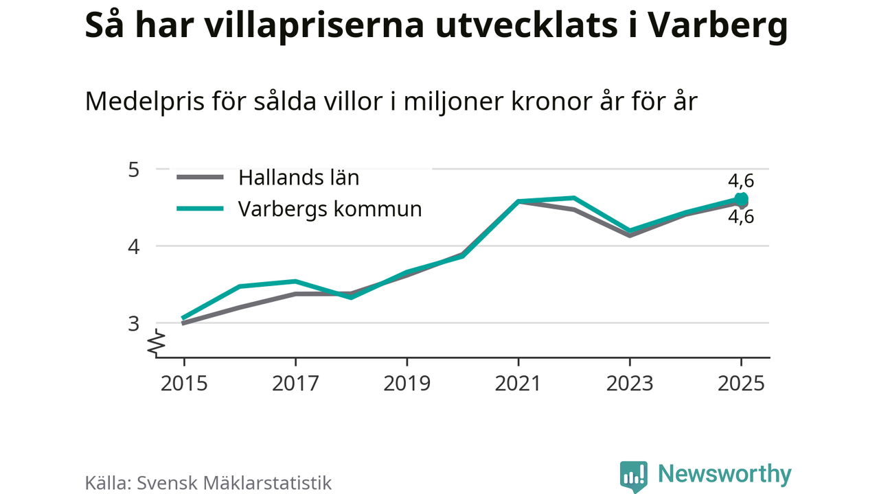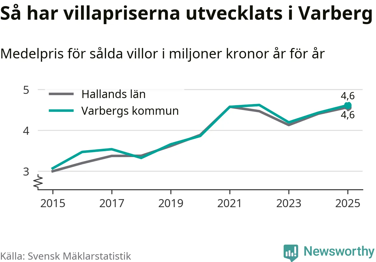 4,6 miljoner kronor är medelpriset för de villor som såldes i Varbergs kommun under året, eller 36 453 kronor per kvadratmeter. Det innebär en prisökning med fyra procent på ett år och är andra året i rad som priserna ökar i kommunen.