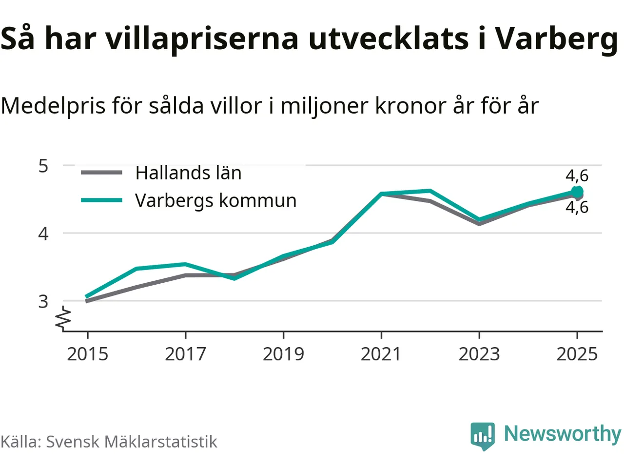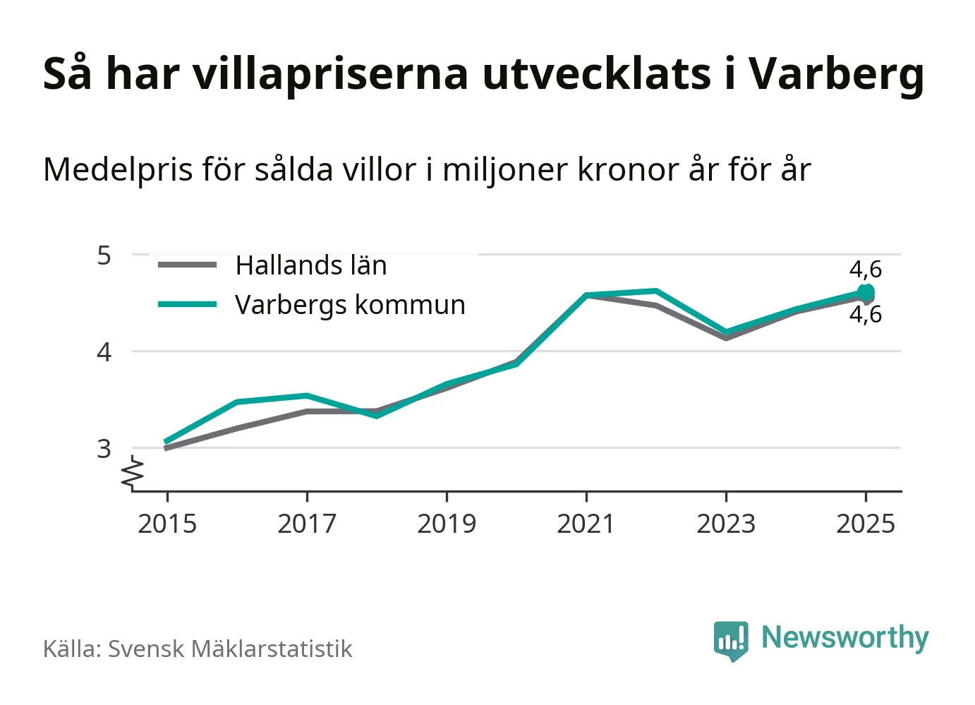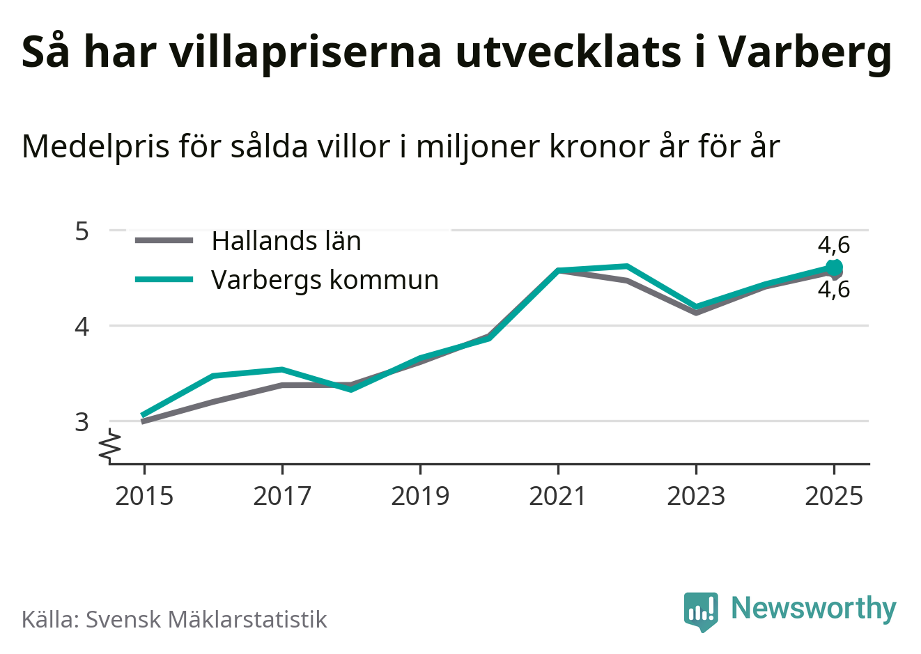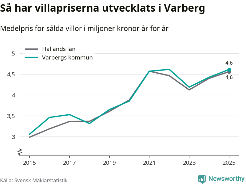 4,6 miljoner kronor är medelpriset för de villor som såldes i Varbergs kommun under året, eller 36 453 kronor per kvadratmeter. Det innebär en prisökning med fyra procent på ett år och är andra året i rad som priserna ökar i kommunen.
