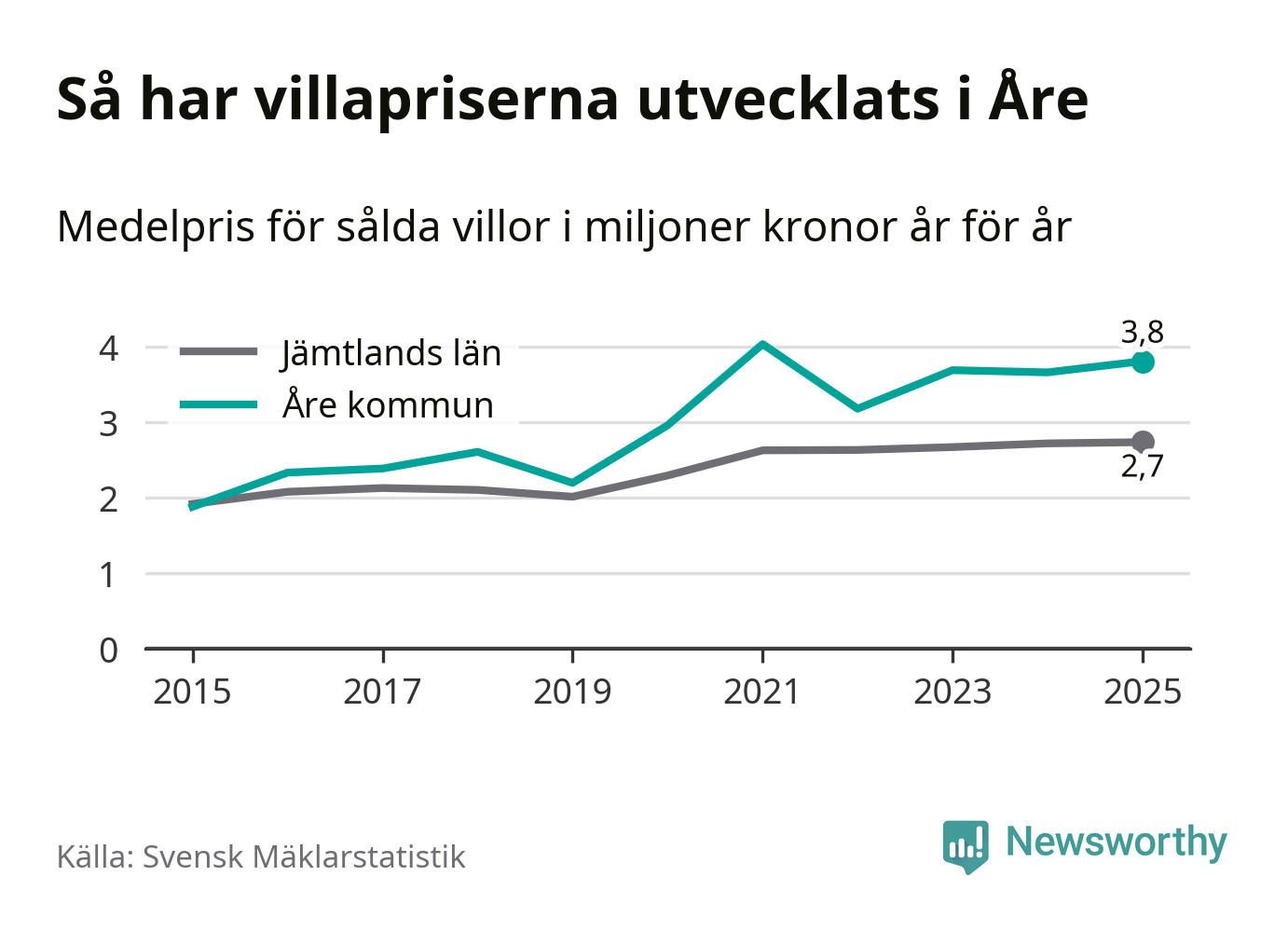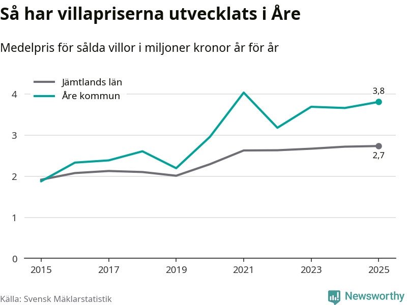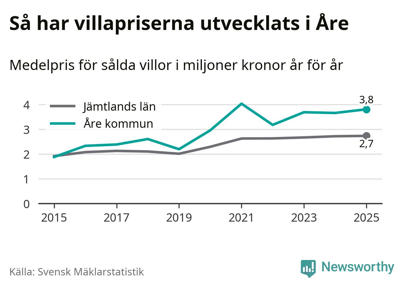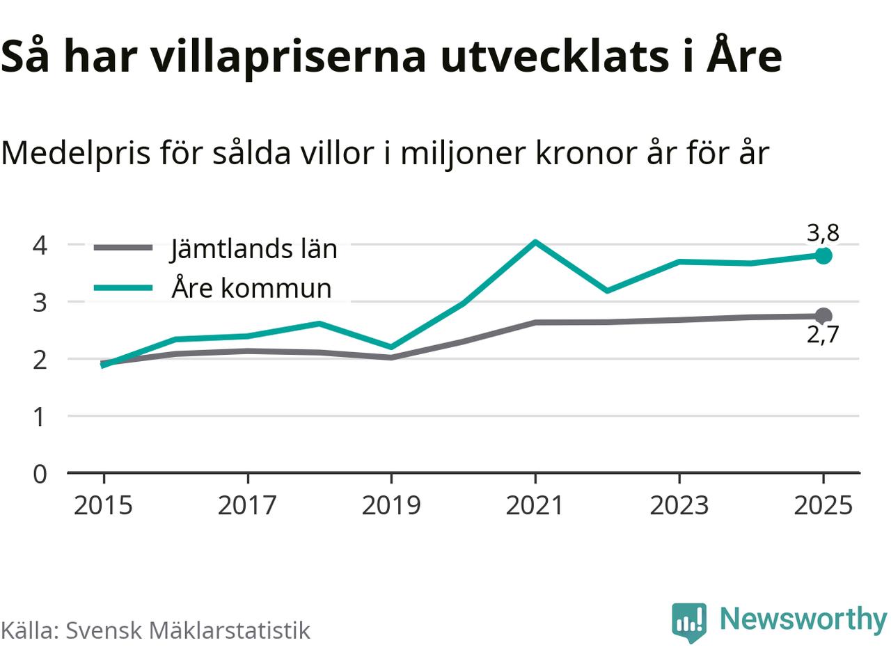3,8 miljoner kronor är medelpriset för de villor som såldes i Åre kommun under året, eller 34 679 kronor per kvadratmeter. Det innebär en prisökning med fyra procent på ett år.