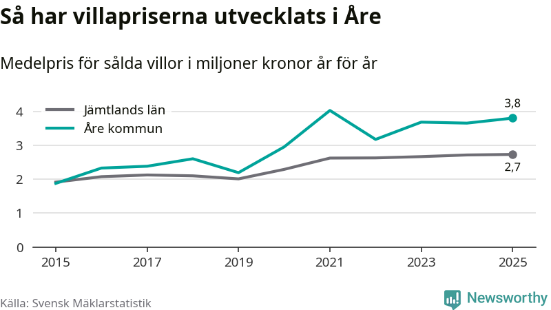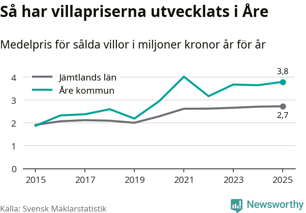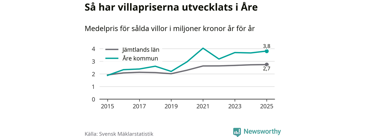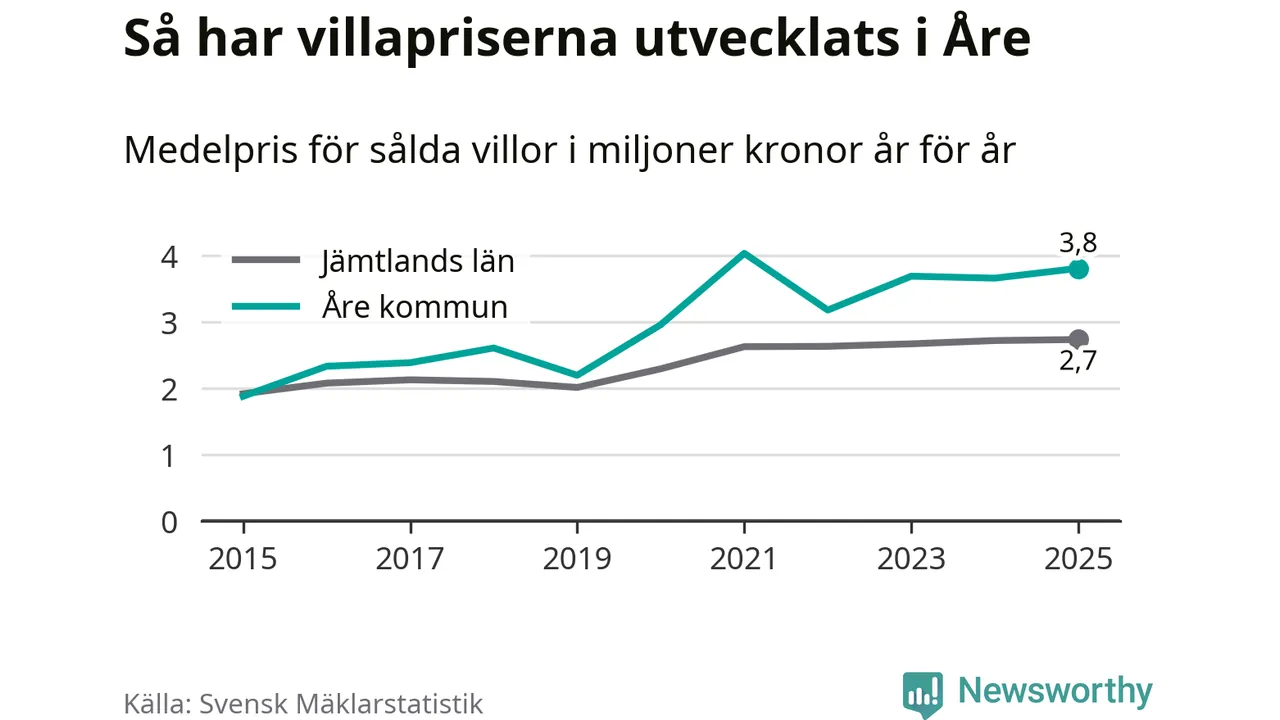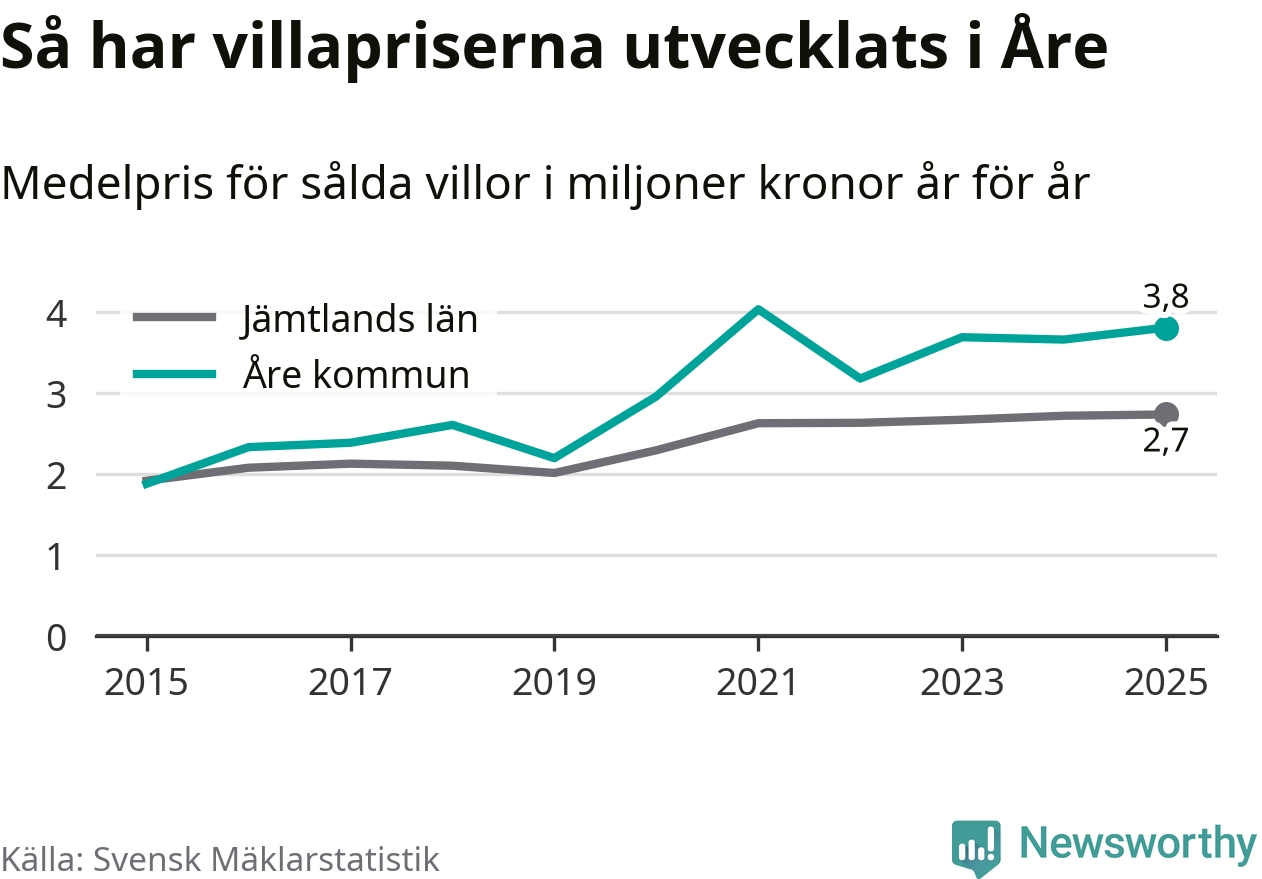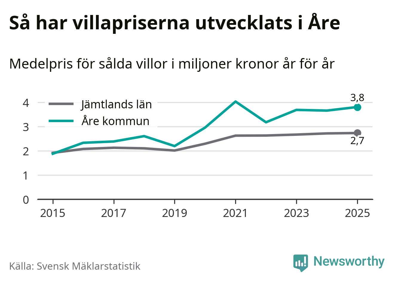 3,8 miljoner kronor är medelpriset för de villor som såldes i Åre kommun under året, eller 34 679 kronor per kvadratmeter. Det innebär en prisökning med fyra procent på ett år.