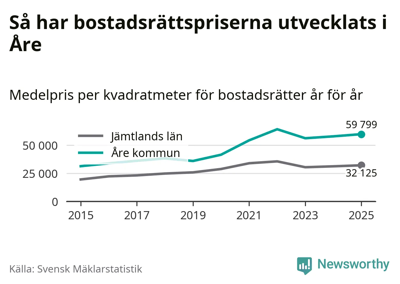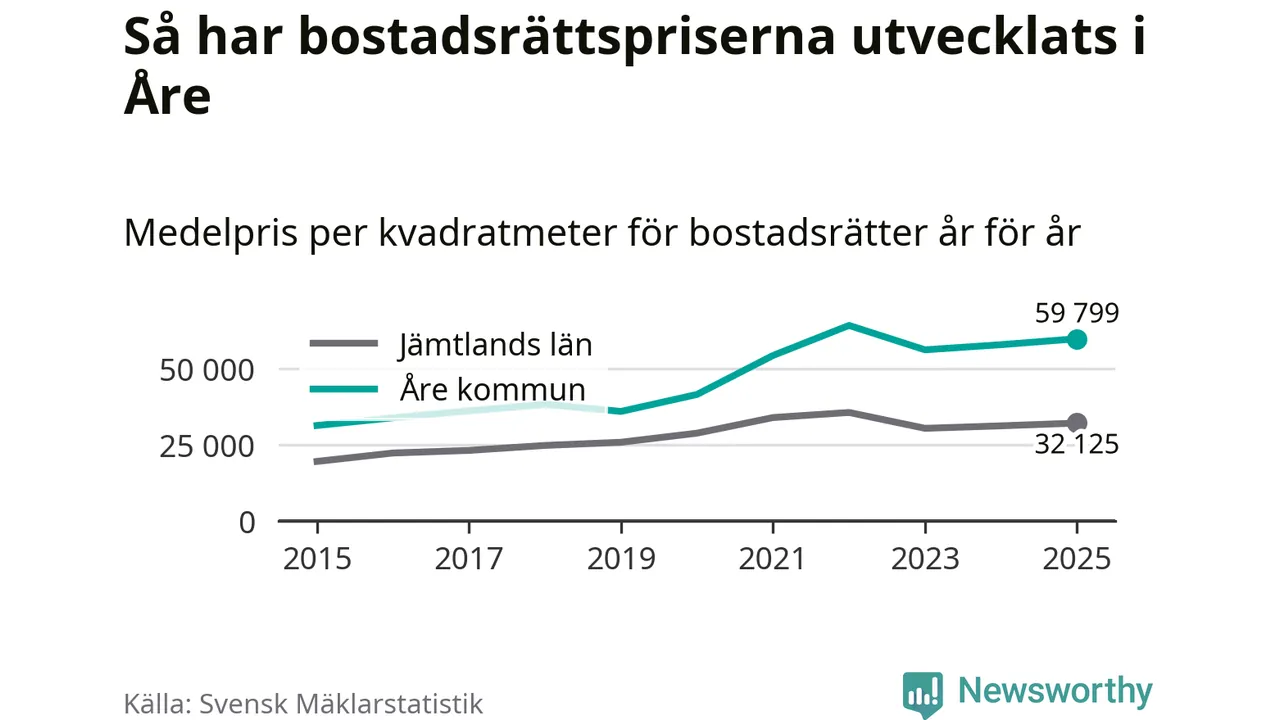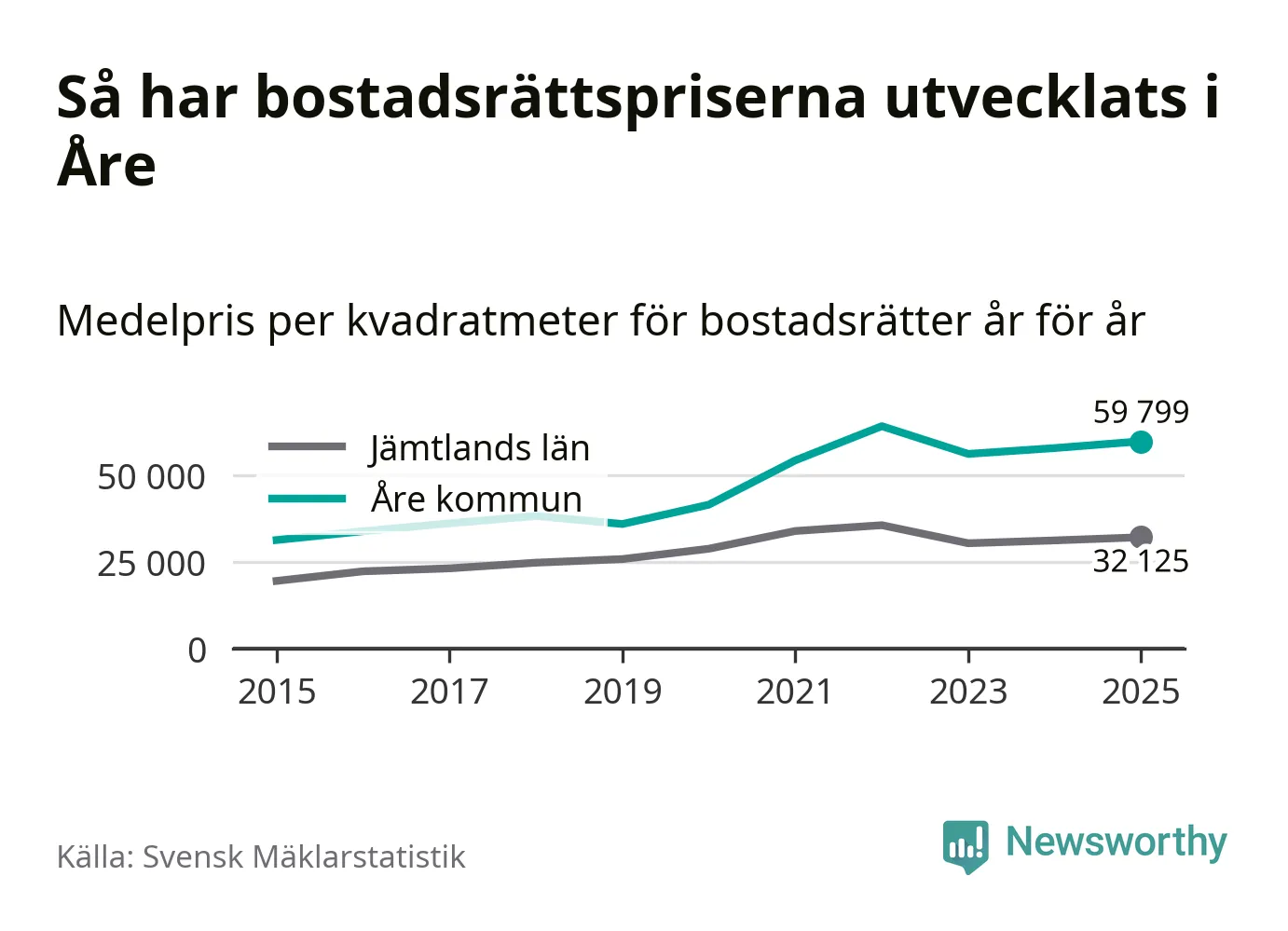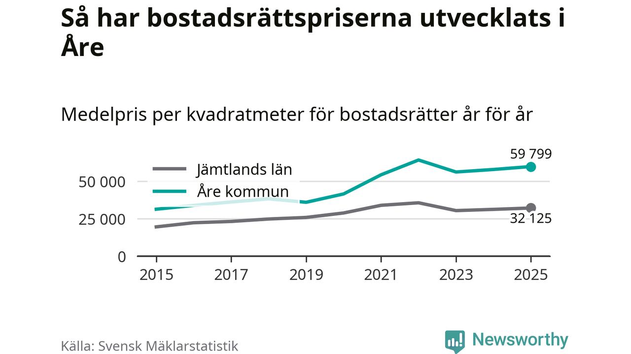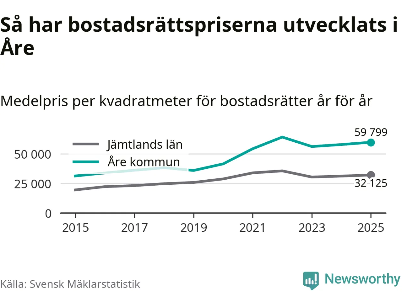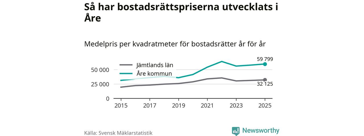 Det såldes totalt 306 bostadsrätter i Åre kommun under året. Genomsnittspriset per kvadratmeter landade på 59 799 kronor. Det är en ökning med tre procent i kommunen på ett år.