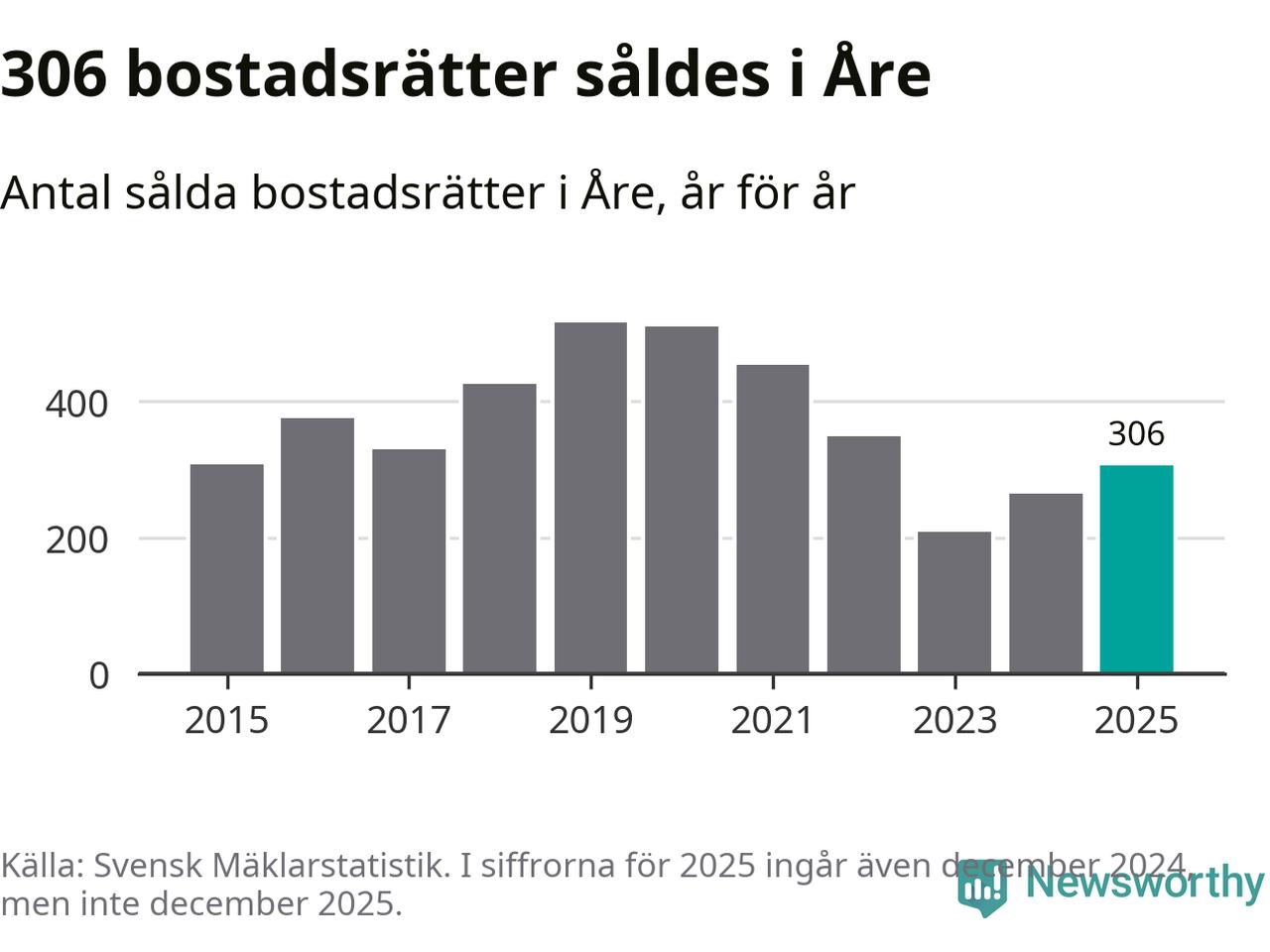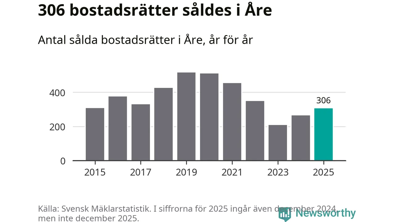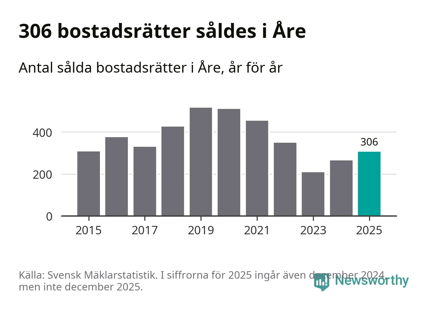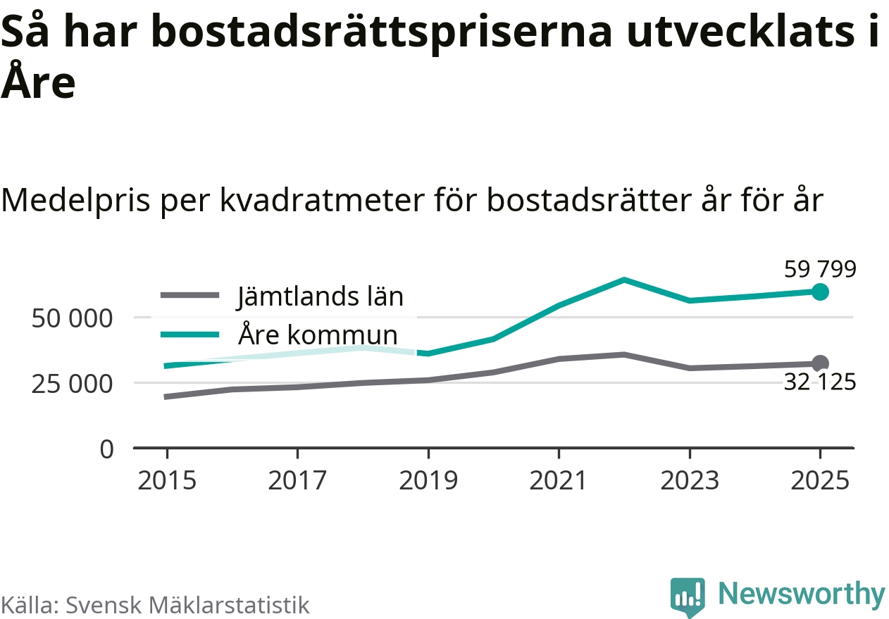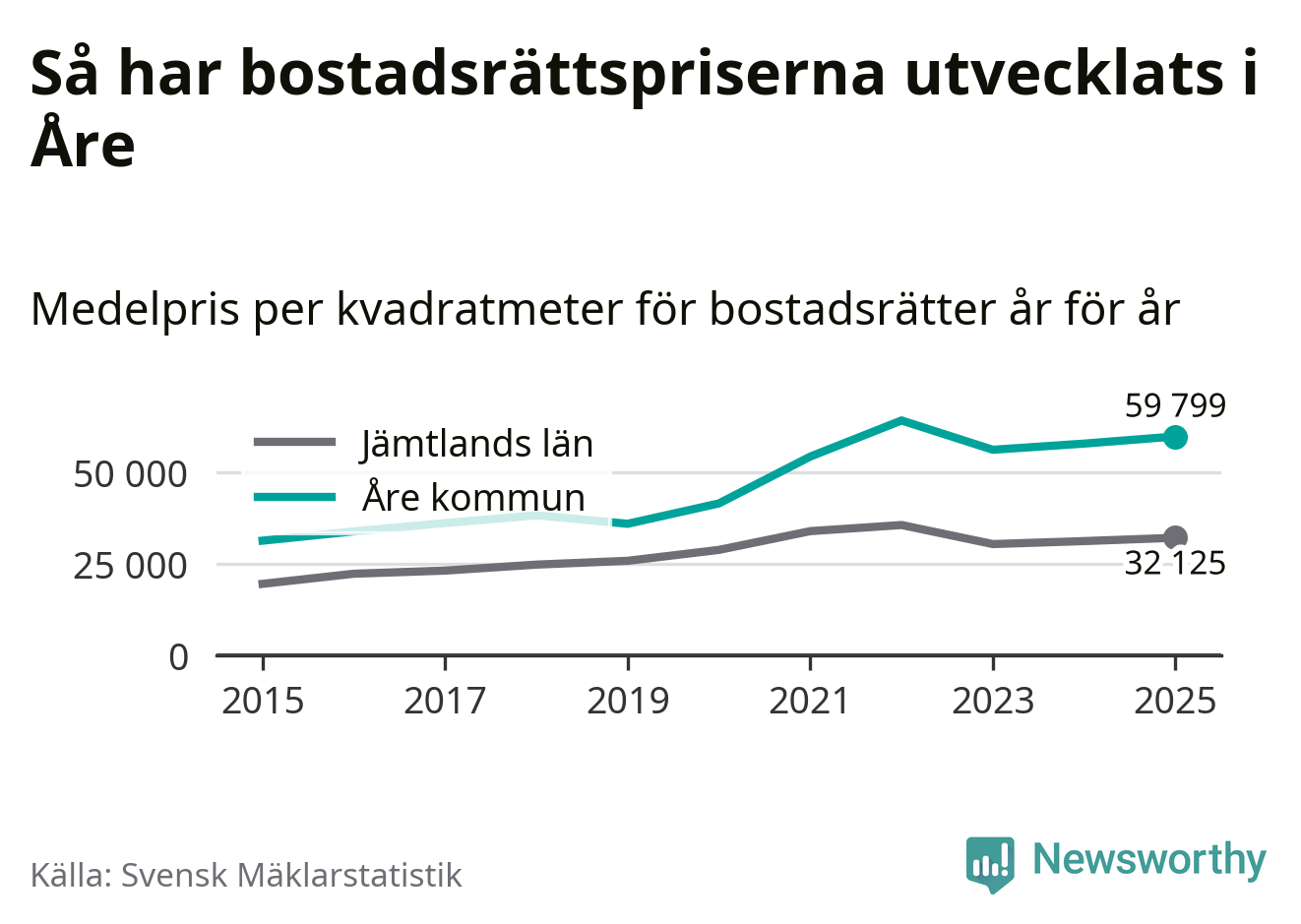 Det såldes totalt 306 bostadsrätter i Åre kommun under året. Genomsnittspriset per kvadratmeter landade på 59 799 kronor. Det är en ökning med tre procent i kommunen på ett år.