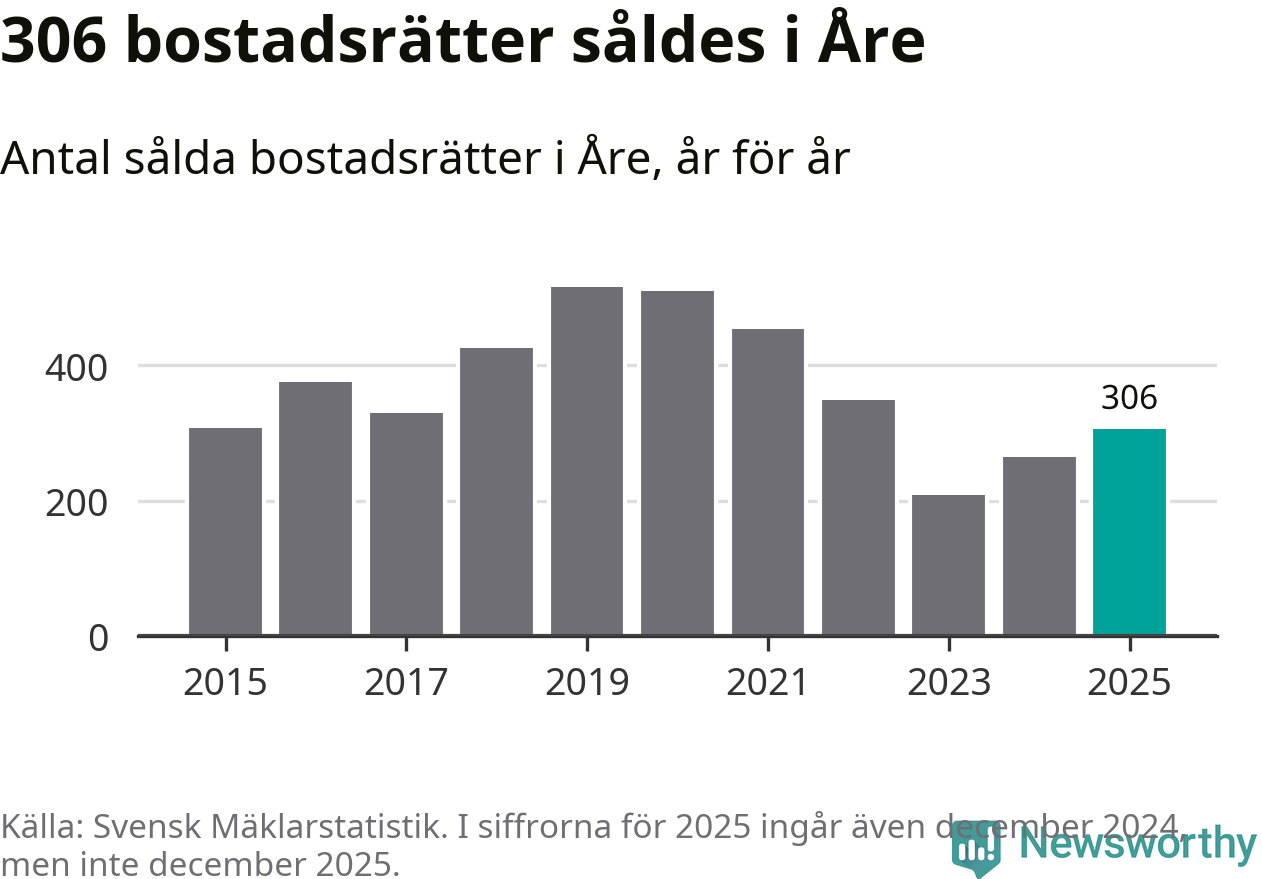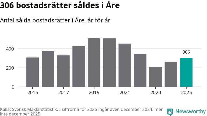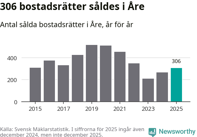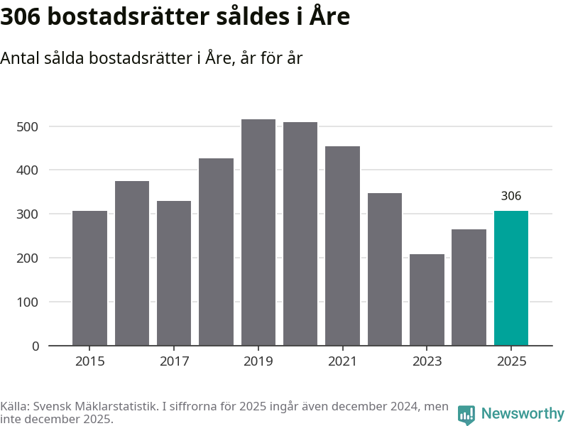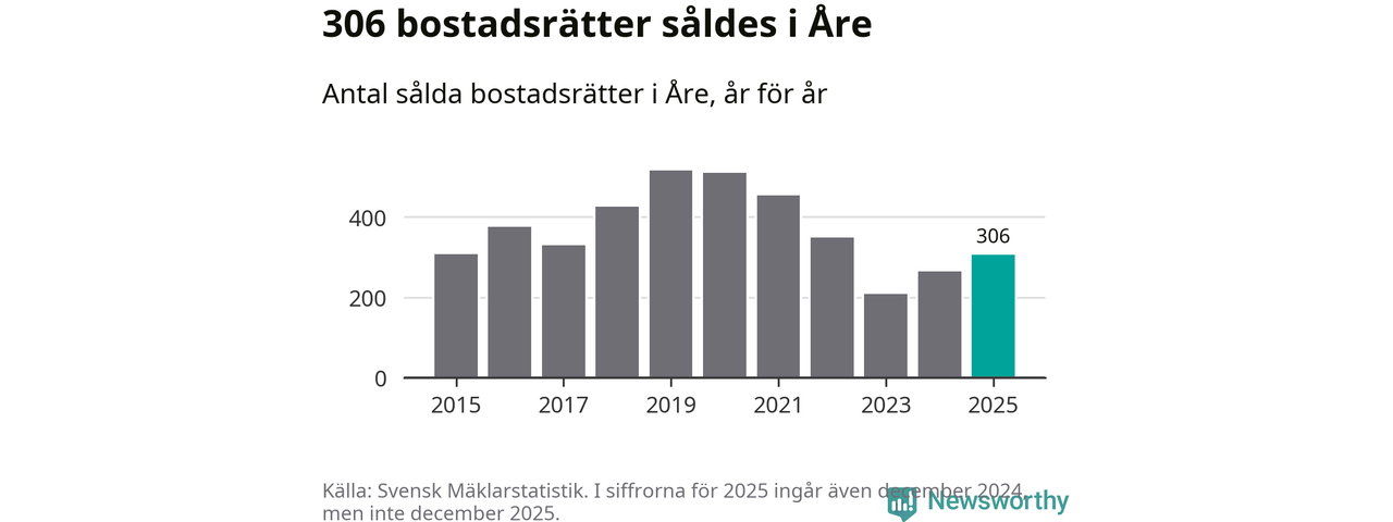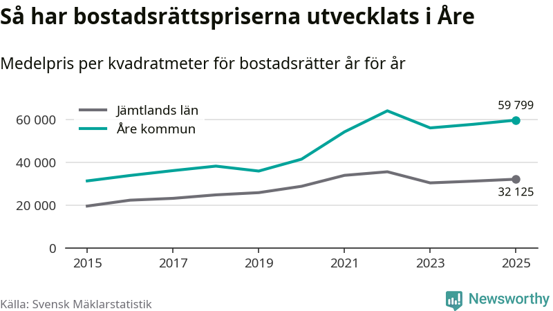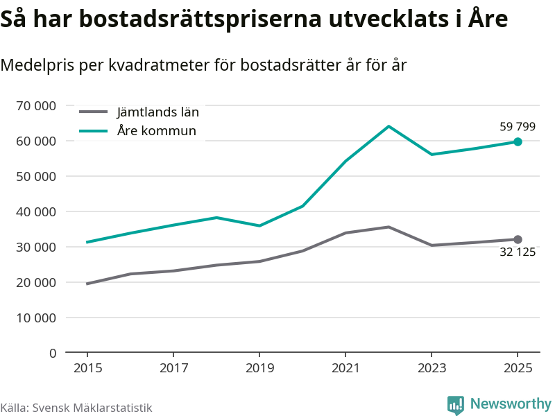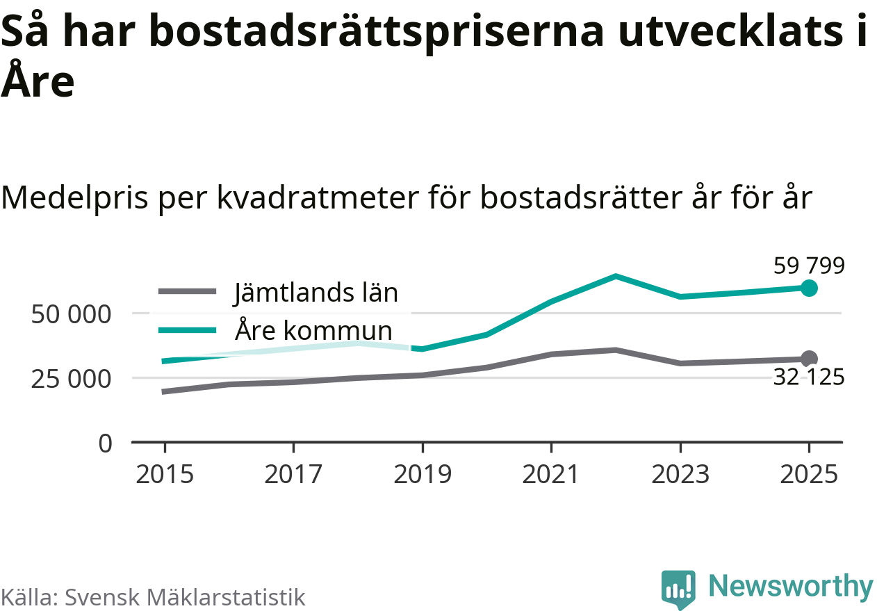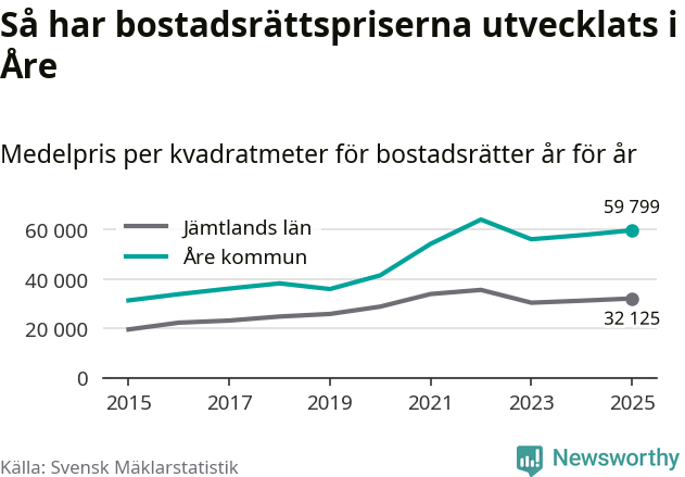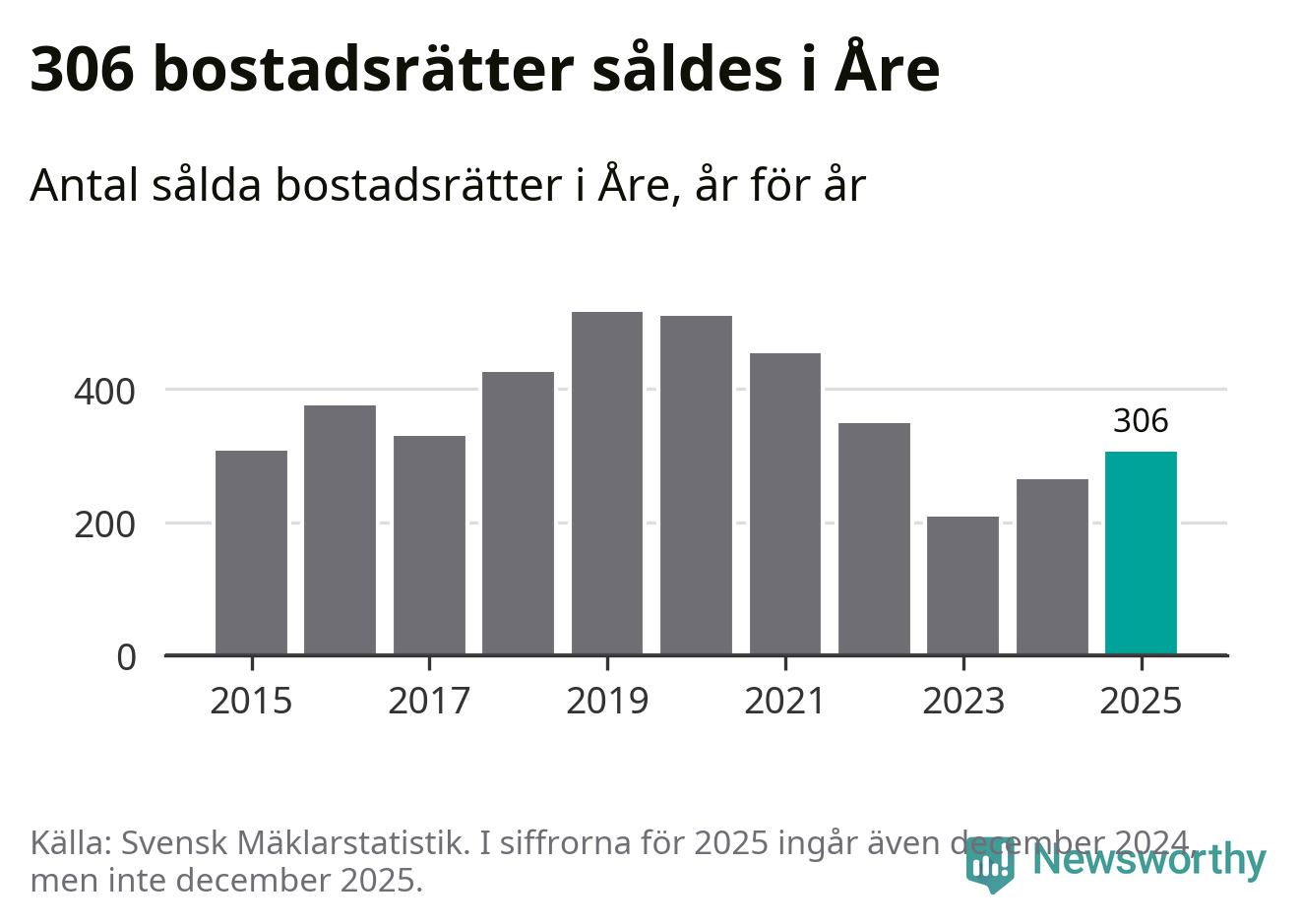 Det såldes totalt 306 bostadsrätter i Åre kommun under året. Genomsnittspriset per kvadratmeter landade på 59 799 kronor. Det är en ökning med tre procent i kommunen på ett år.