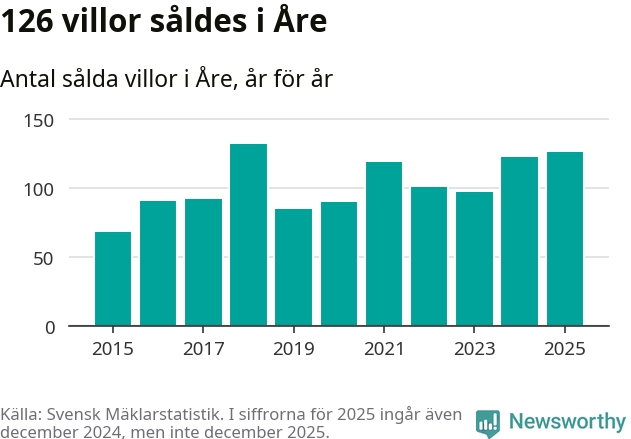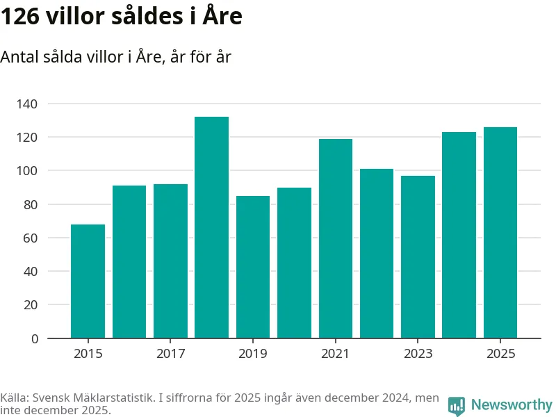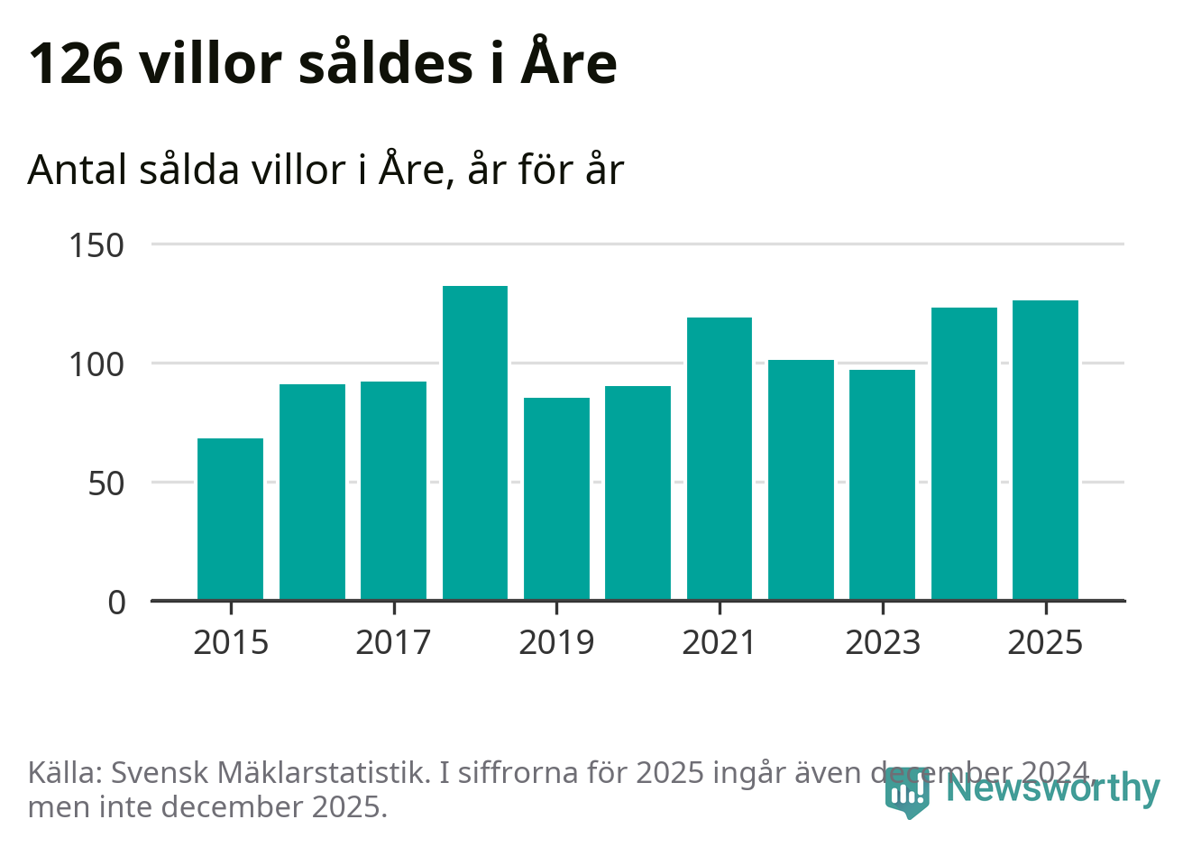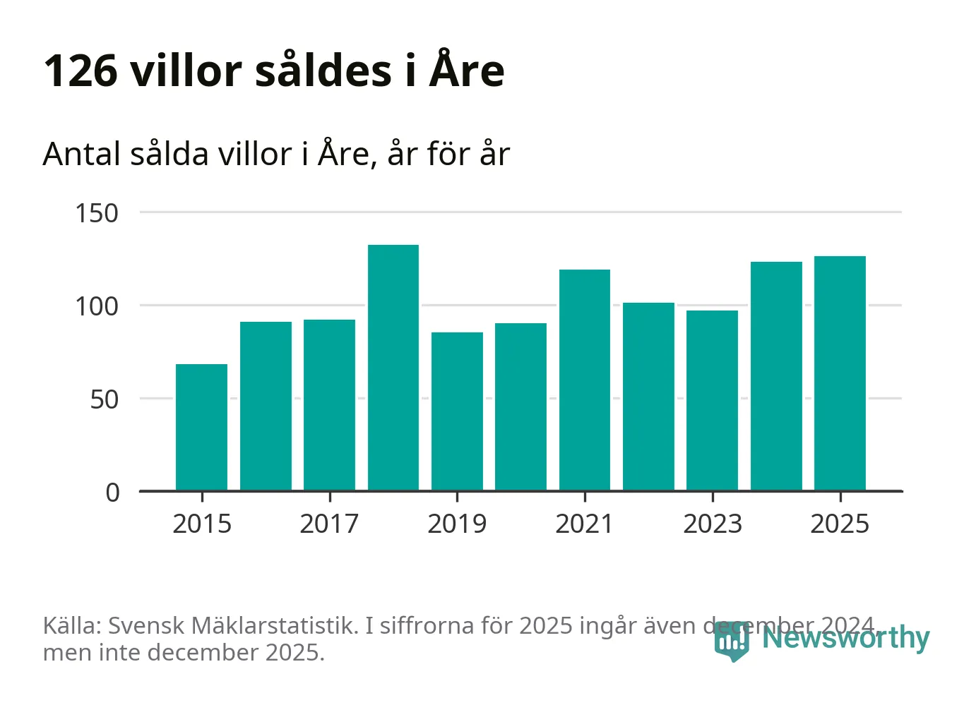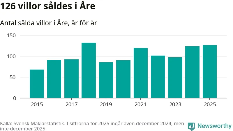 Antalet sålda villor ökade också något. Totalt såldes 126 villor, att jämföra med 123 under 2024. Det är andra året i rad som antalet sålda villor ökar i kommunen.