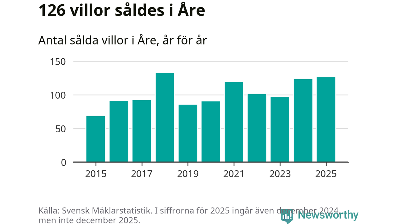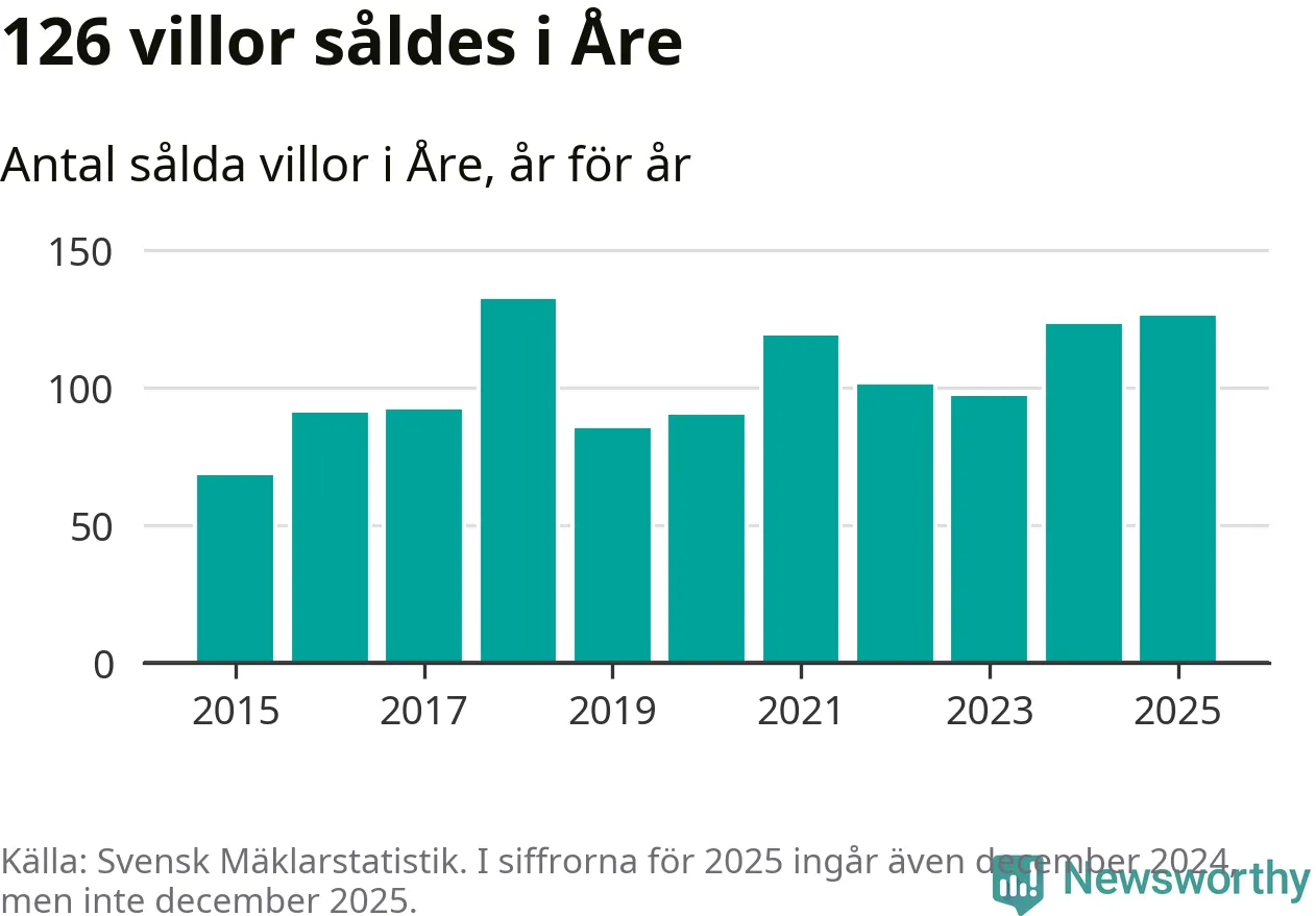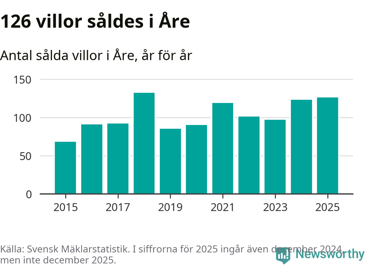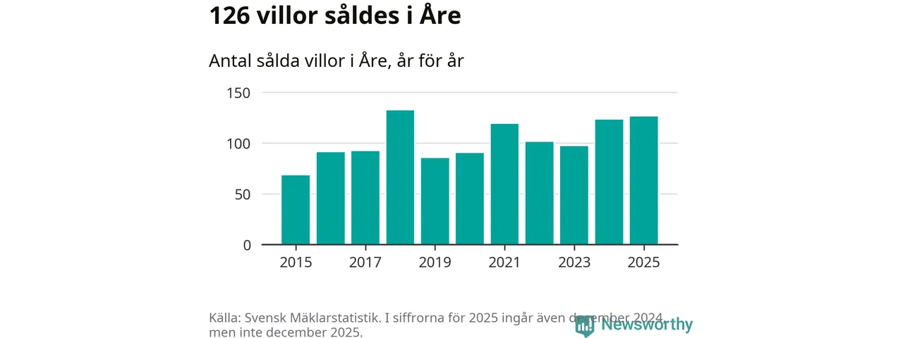 Antalet sålda villor ökade också något. Totalt såldes 126 villor, att jämföra med 123 under 2024. Det är andra året i rad som antalet sålda villor ökar i kommunen.