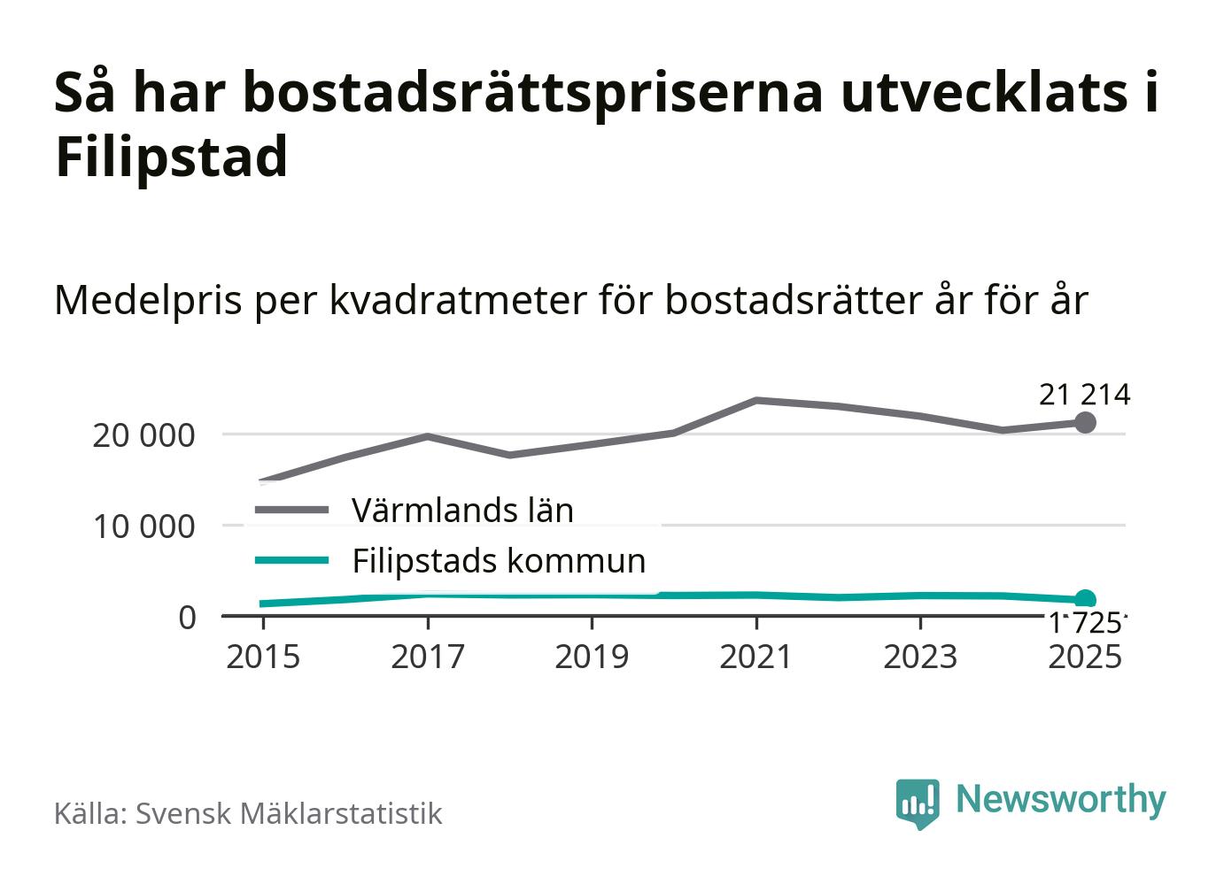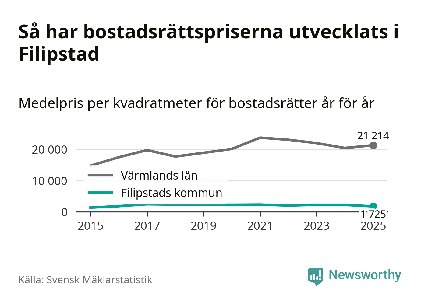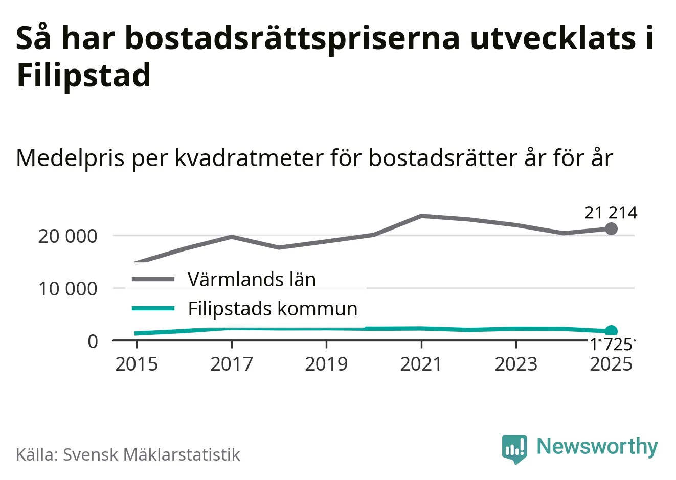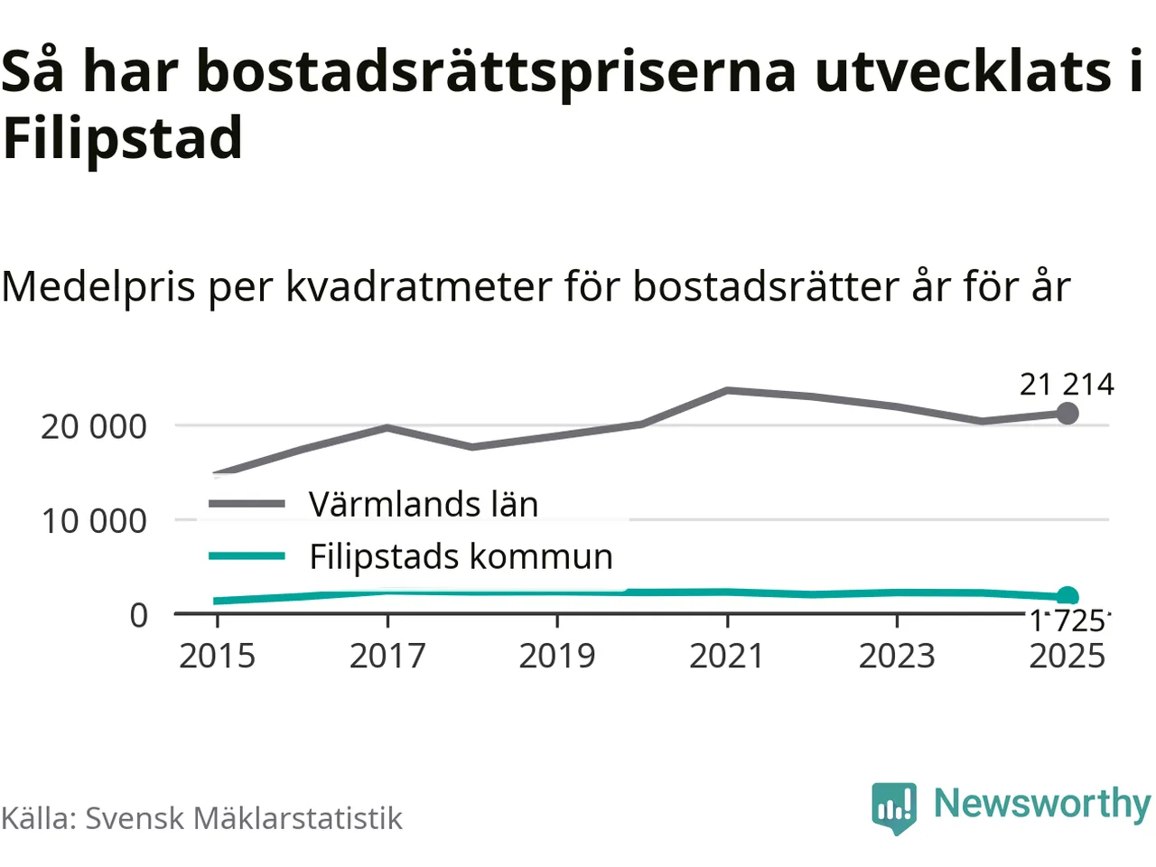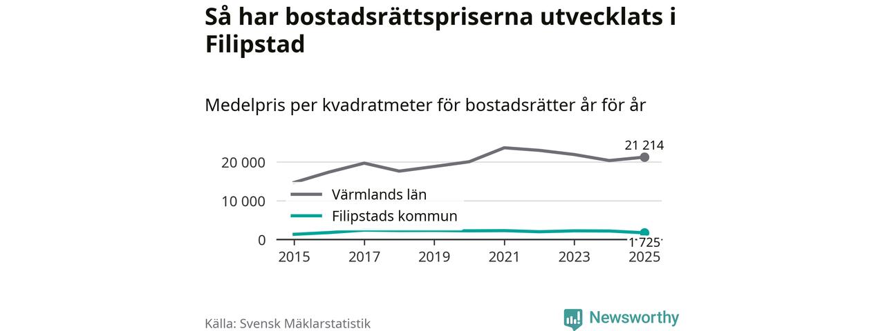 Det såldes totalt 43 bostadsrätter i Filipstads kommun under året. Genomsnittspriset per kvadratmeter landade på 1 725 kronor. Det är en minskning med 21 procent i kommunen på ett år.