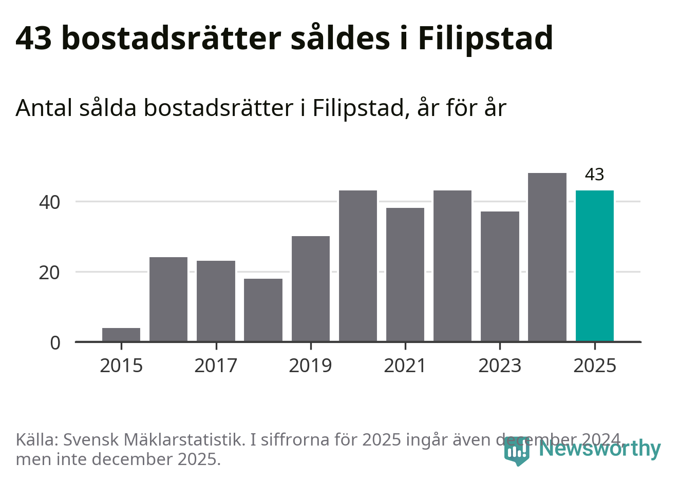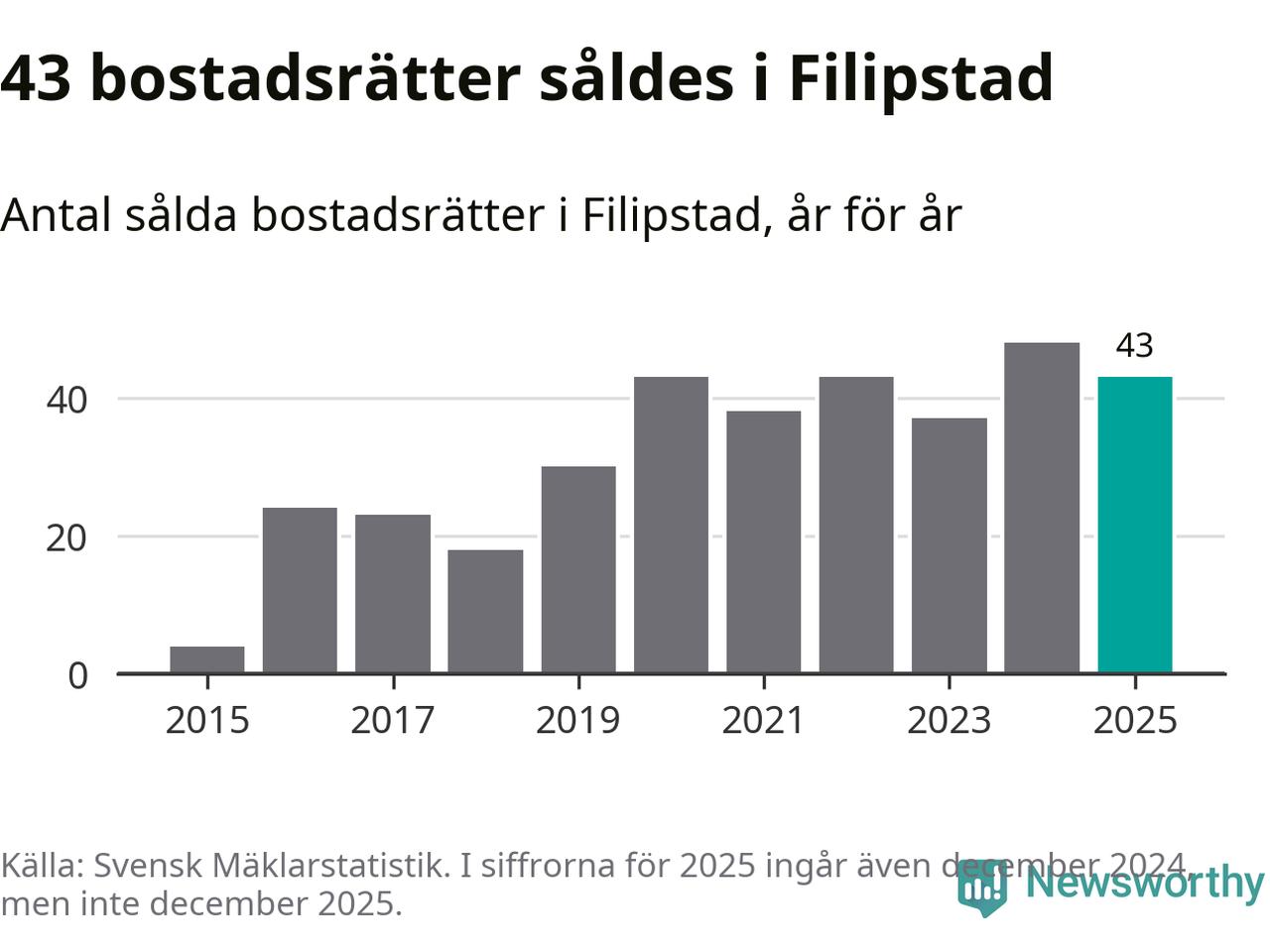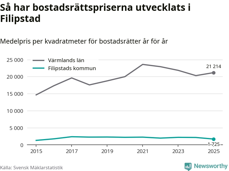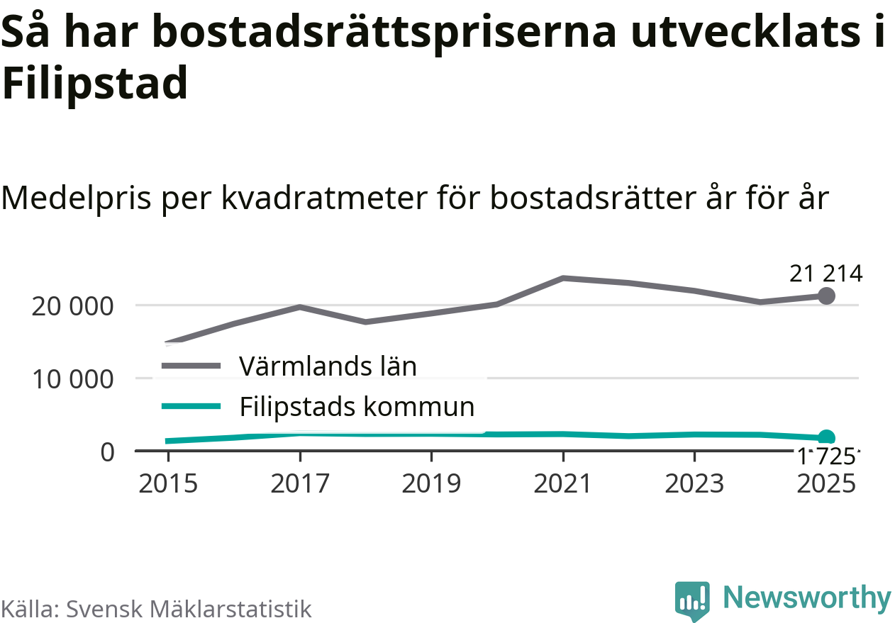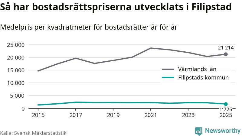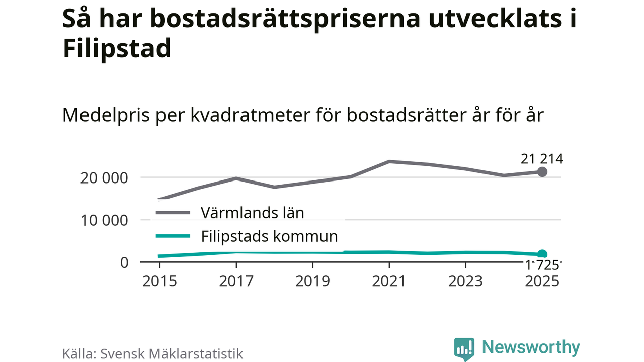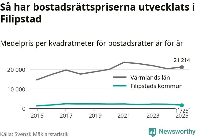 Det såldes totalt 43 bostadsrätter i Filipstads kommun under året. Genomsnittspriset per kvadratmeter landade på 1 725 kronor. Det är en minskning med 21 procent i kommunen på ett år.