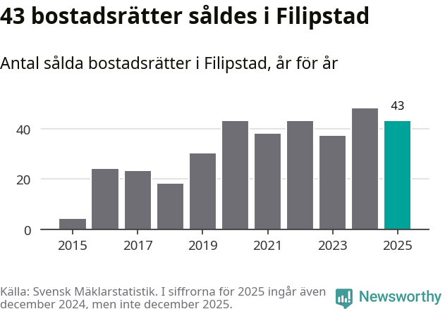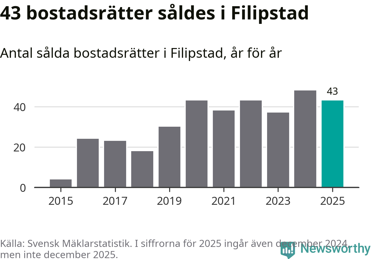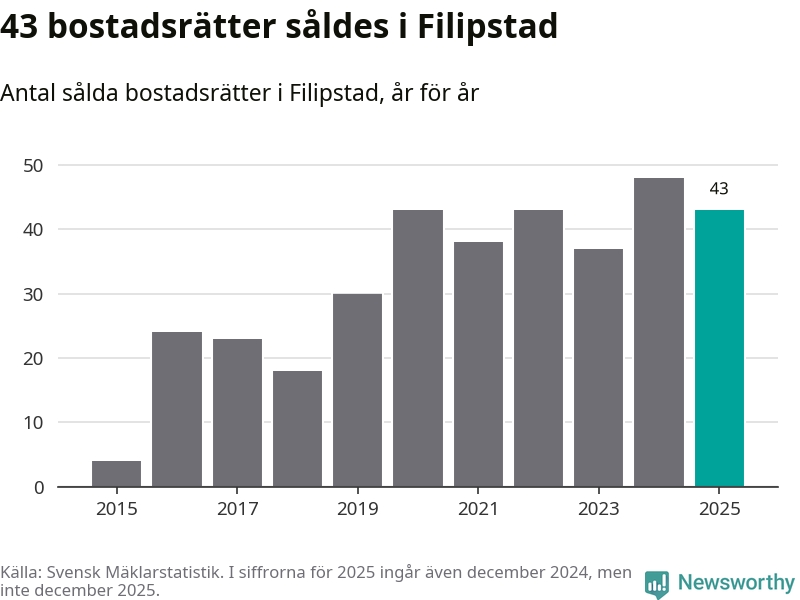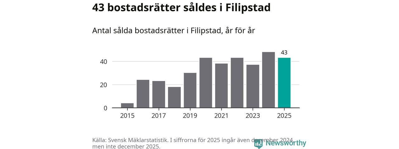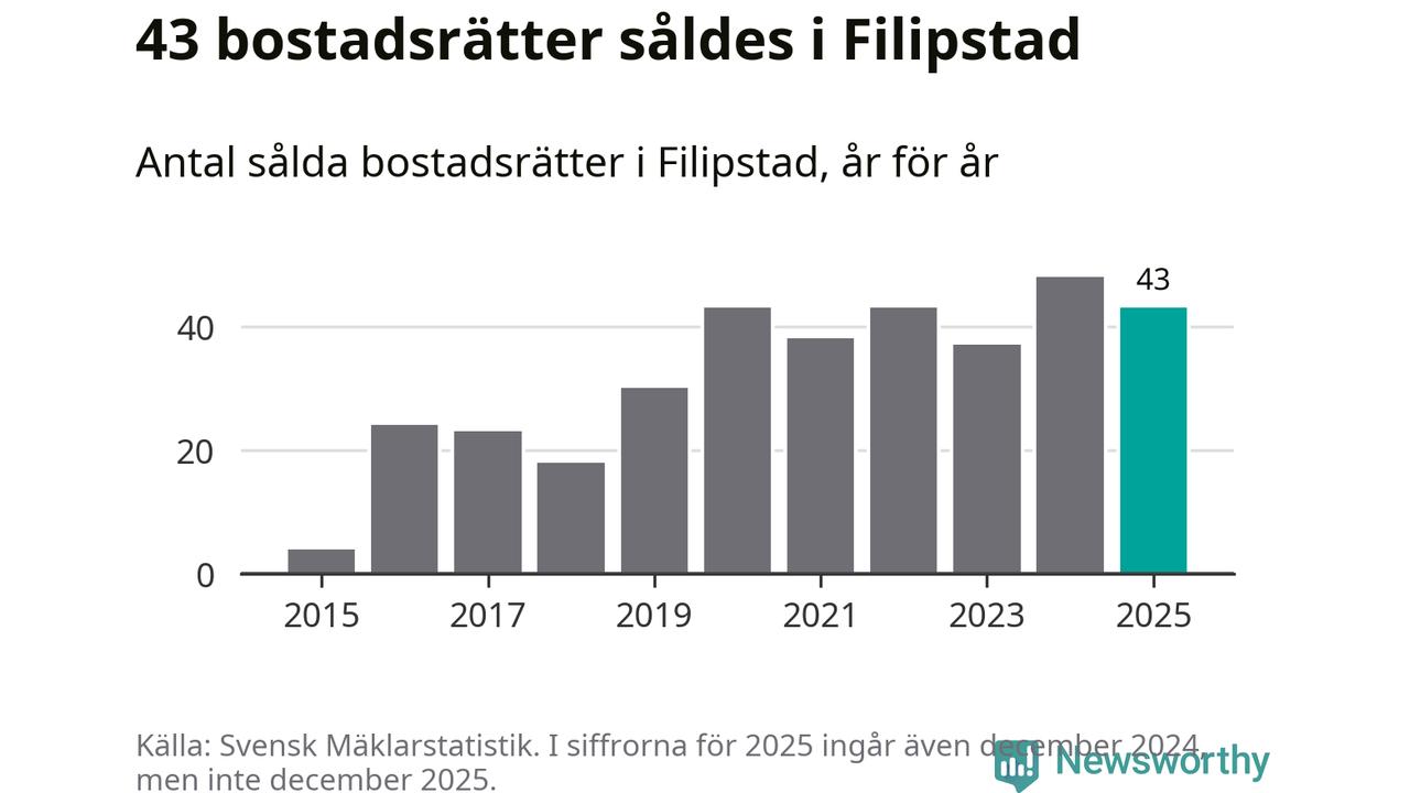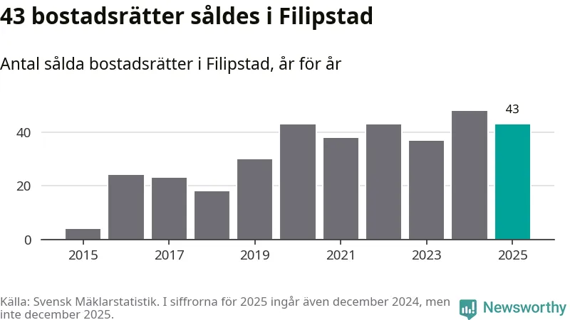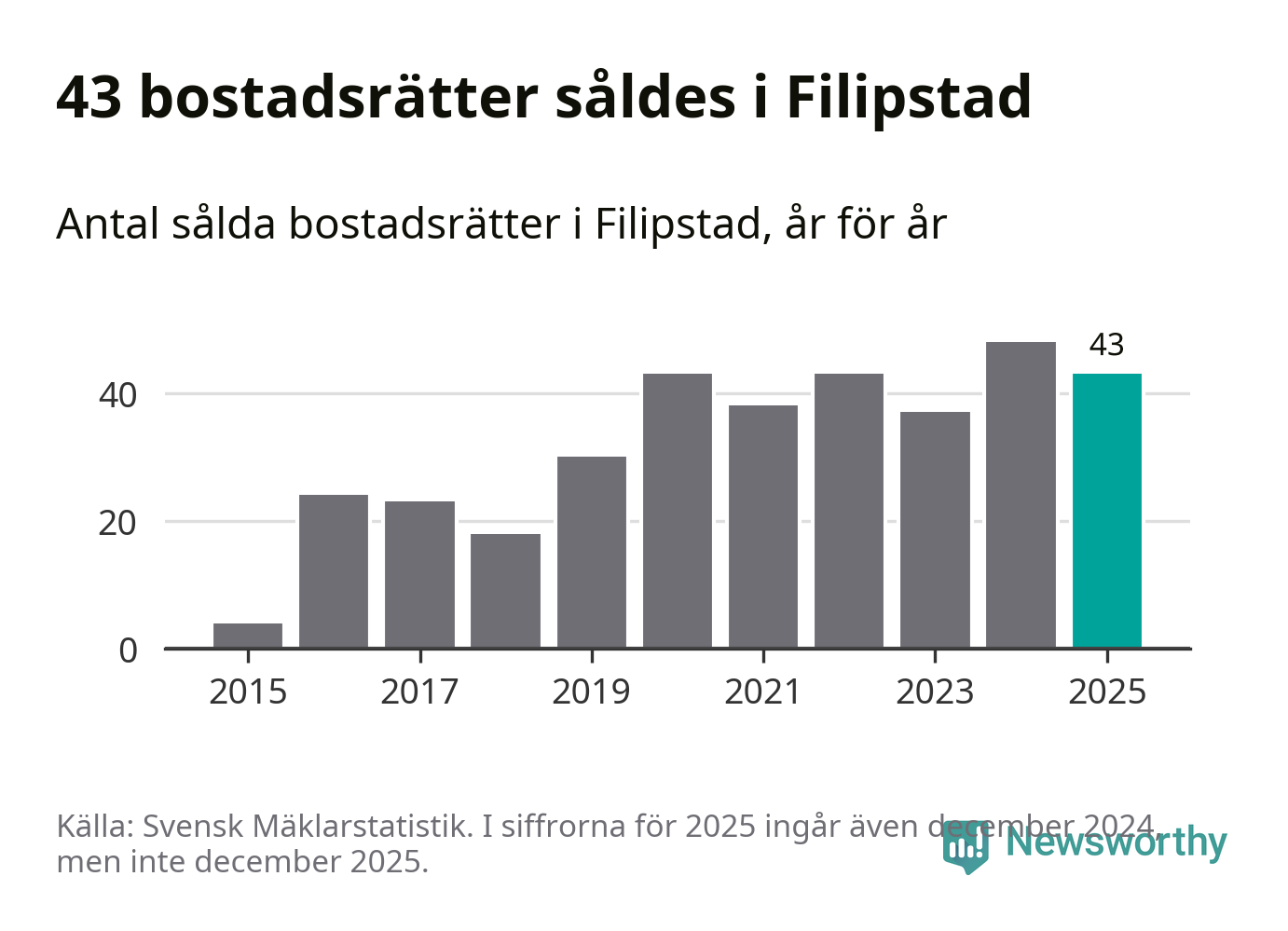 Det såldes totalt 43 bostadsrätter i Filipstads kommun under året. Genomsnittspriset per kvadratmeter landade på 1 725 kronor. Det är en minskning med 21 procent i kommunen på ett år.