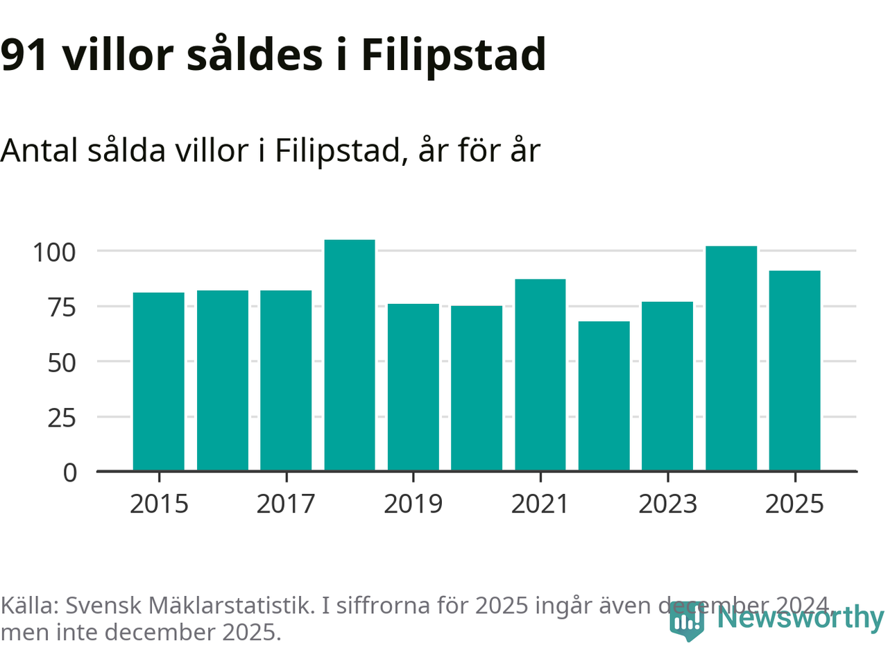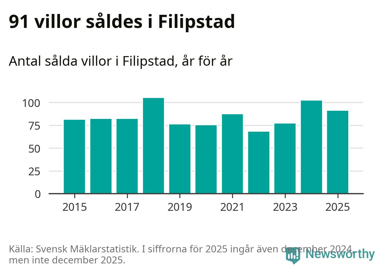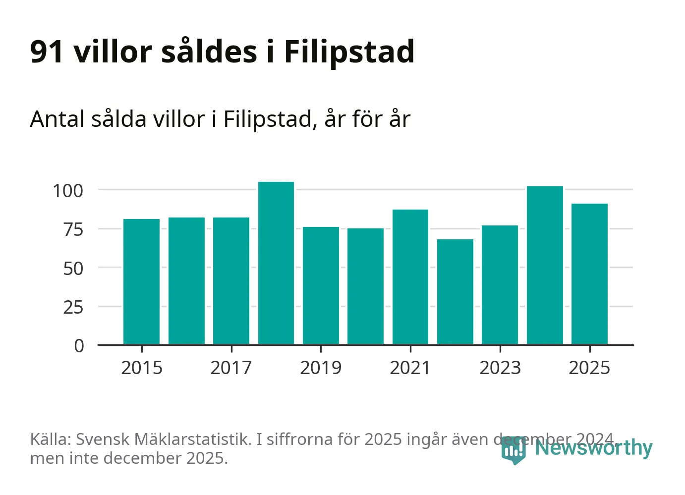 Däremot minskade antalet sålda villor. Totalt såldes 91 villor, att jämföra med 102 under 2024.