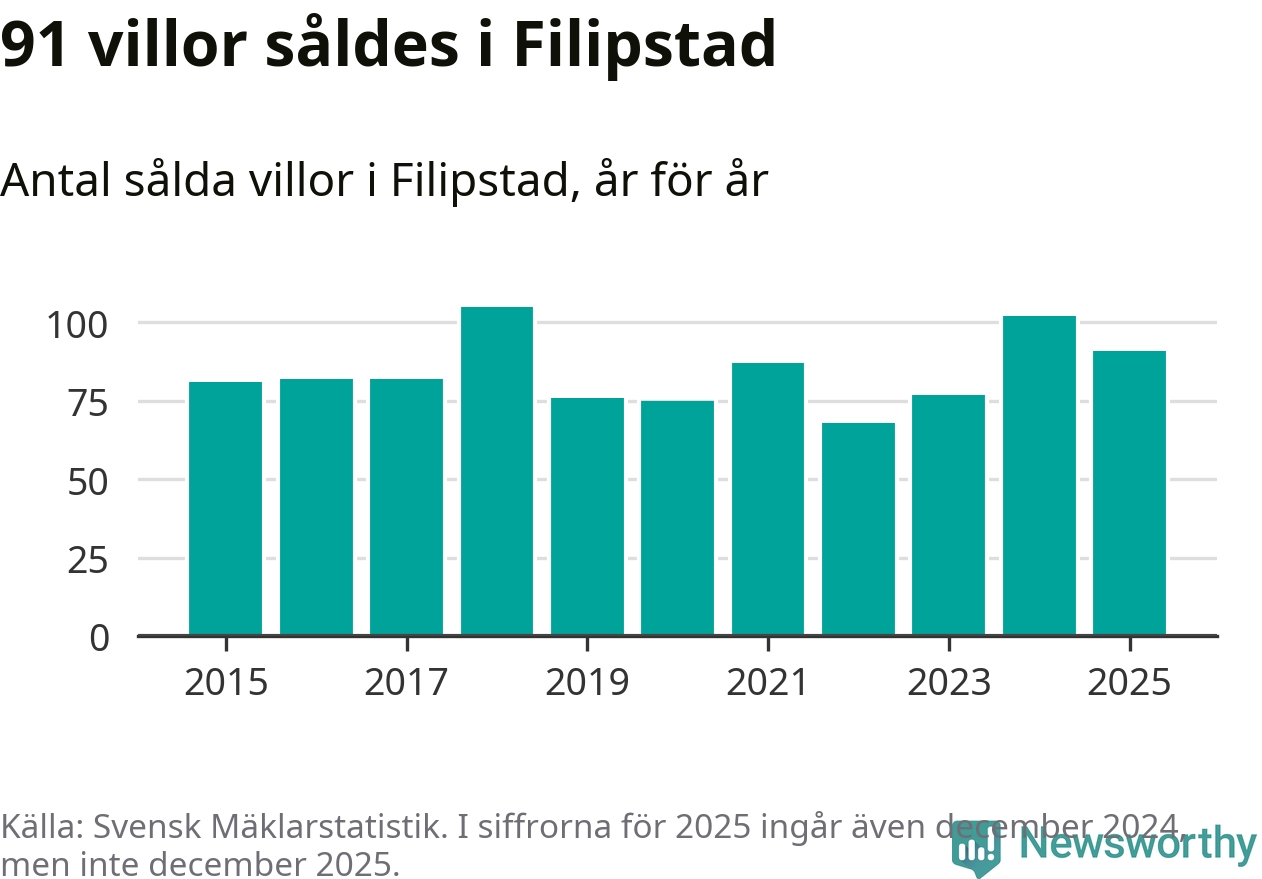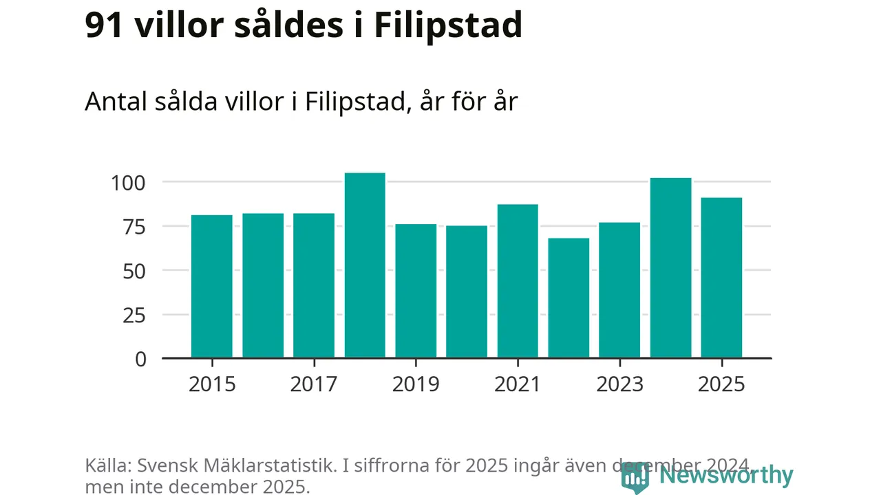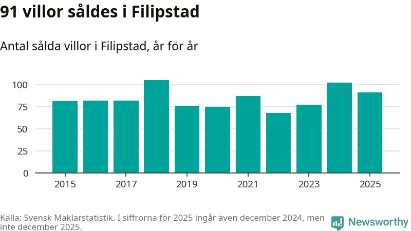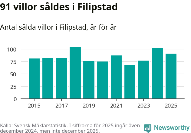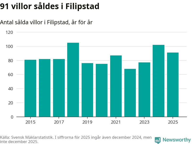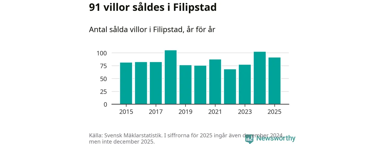 Däremot minskade antalet sålda villor. Totalt såldes 91 villor, att jämföra med 102 under 2024.