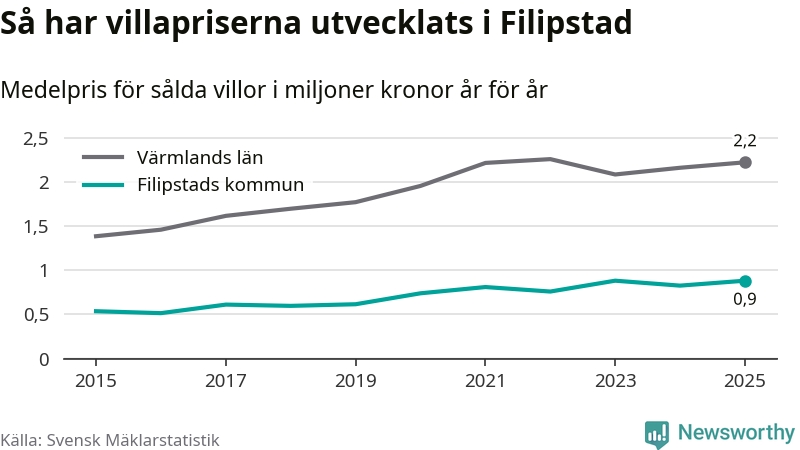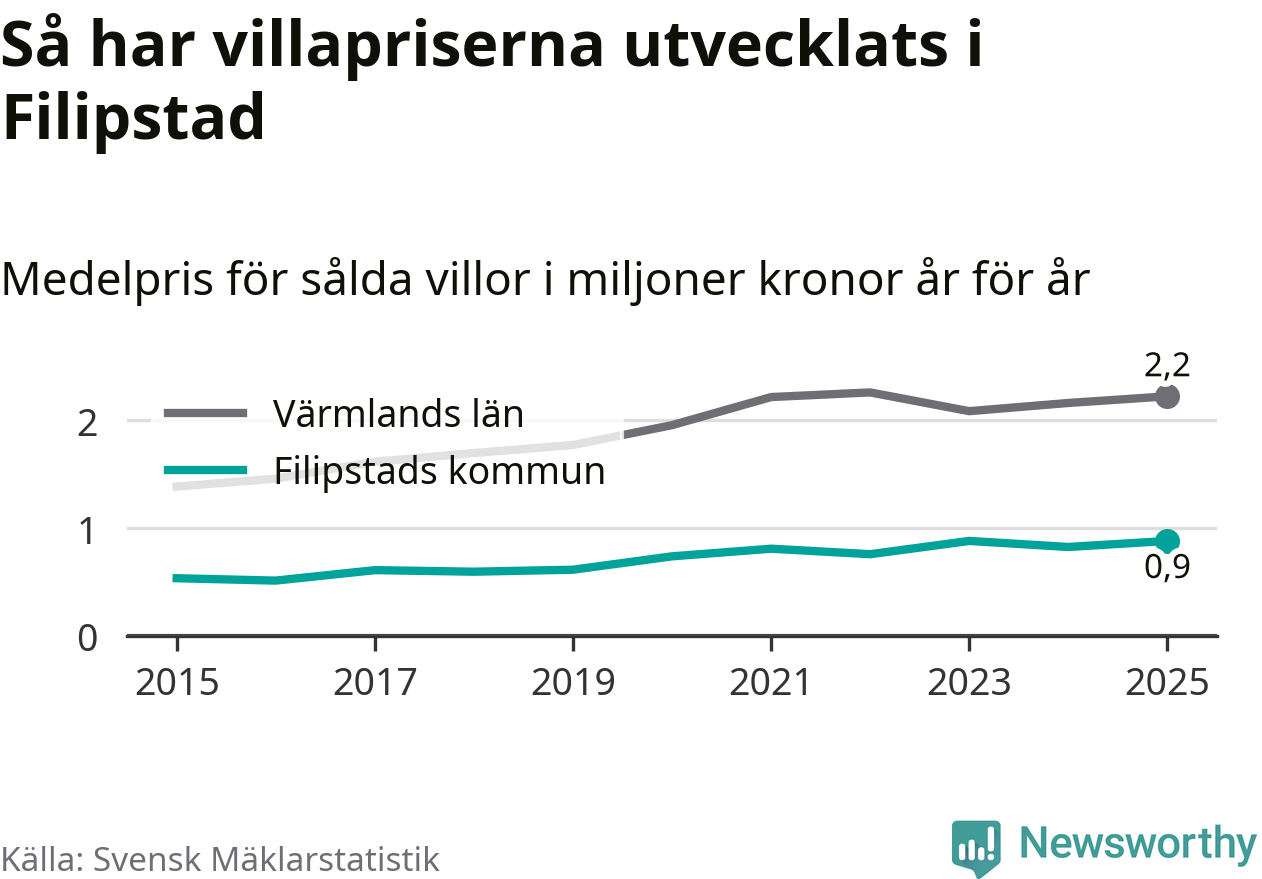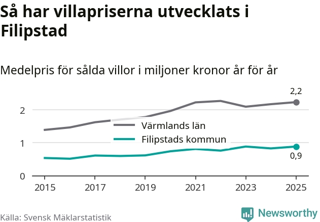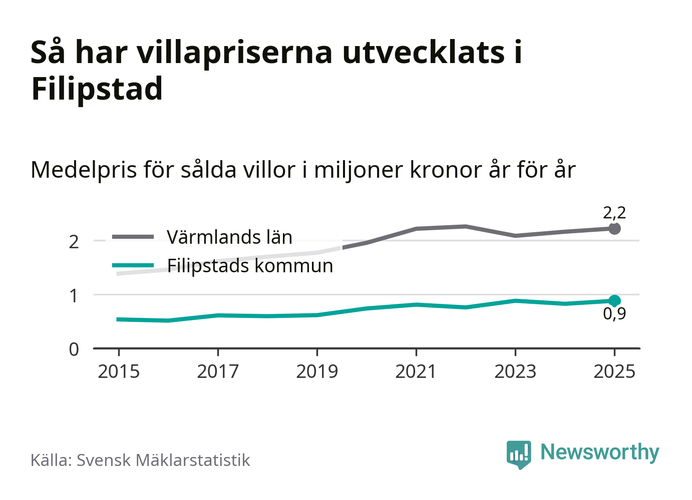 882 000 kronor är medelpriset för de villor som såldes i Filipstads kommun under året, eller 7 009 kronor per kvadratmeter. Det innebär en prisökning med sju procent på ett år.