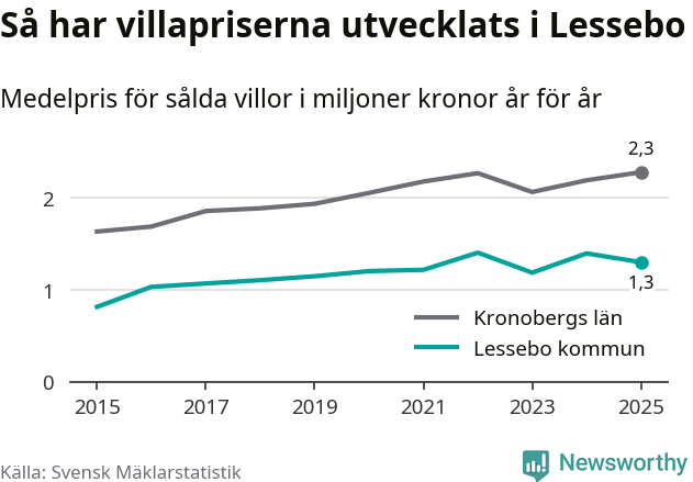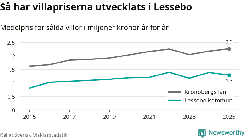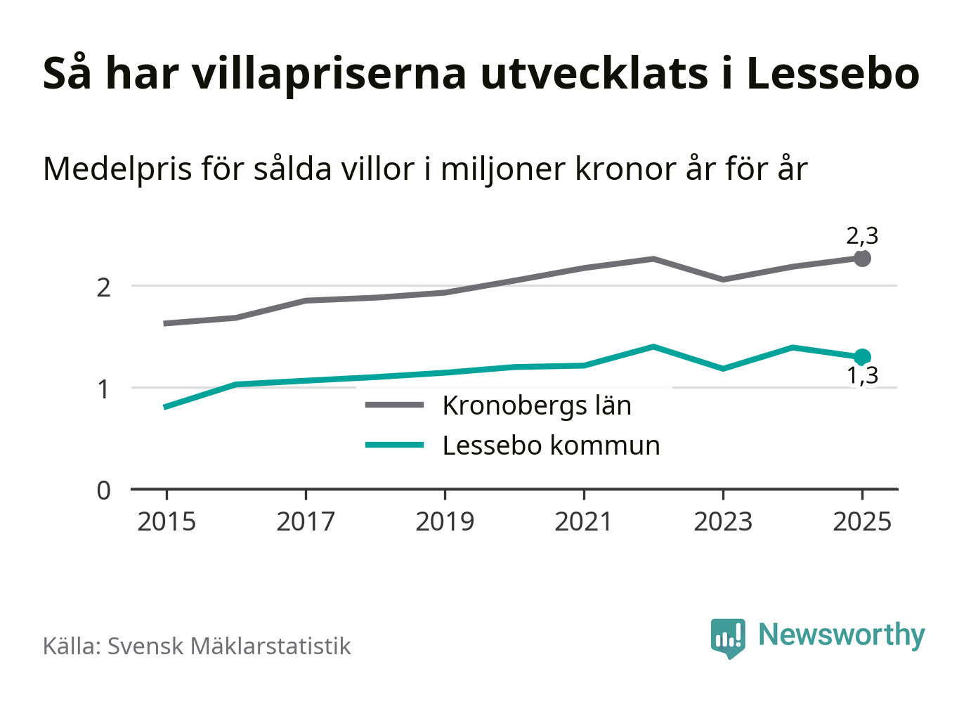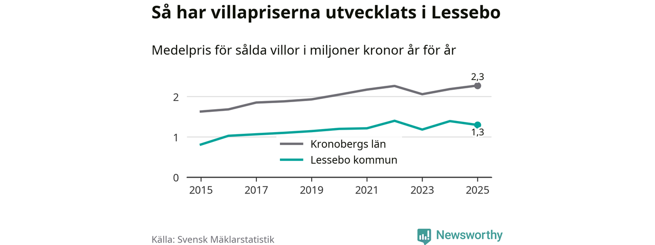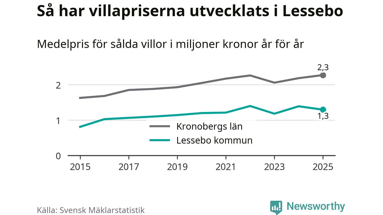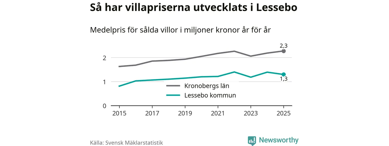 1,3 miljoner kronor är medelpriset för de villor som såldes i Lessebo kommun under året, eller 10 602 kronor per kvadratmeter. Det innebär en prisminskning med sju procent på ett år.