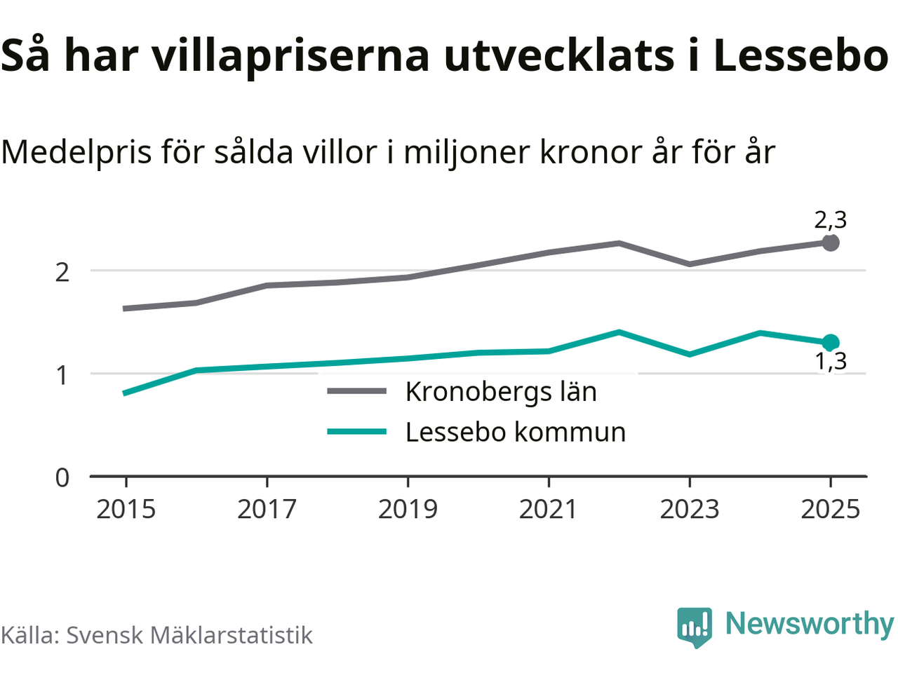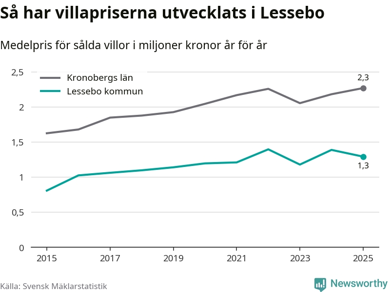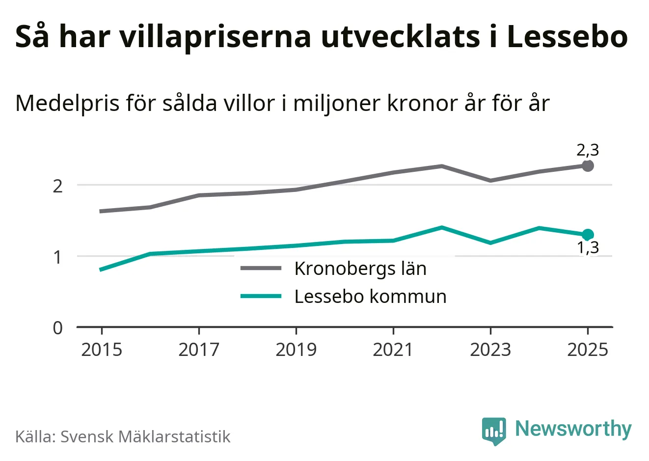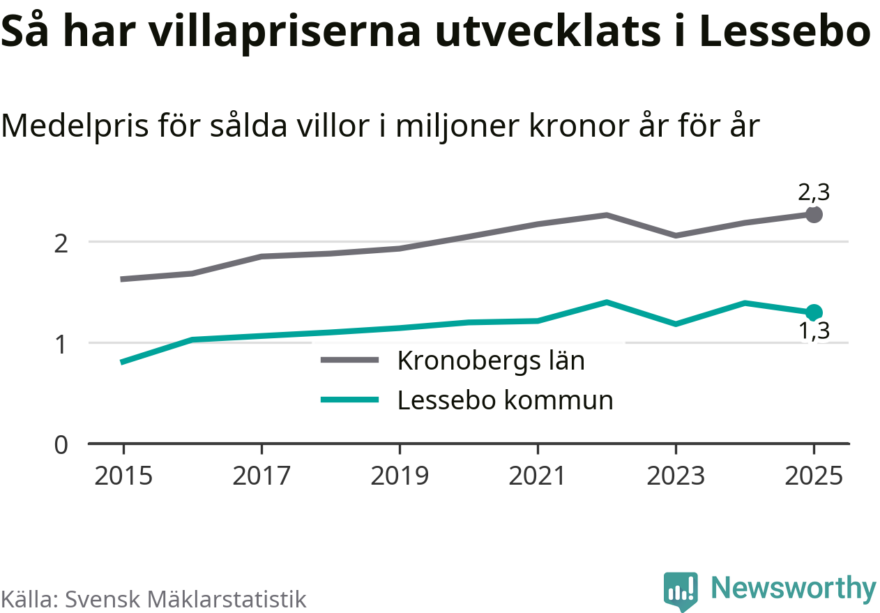 1,3 miljoner kronor är medelpriset för de villor som såldes i Lessebo kommun under året, eller 10 602 kronor per kvadratmeter. Det innebär en prisminskning med sju procent på ett år.