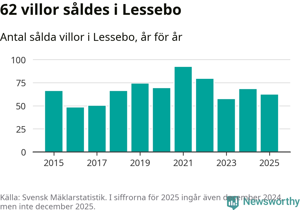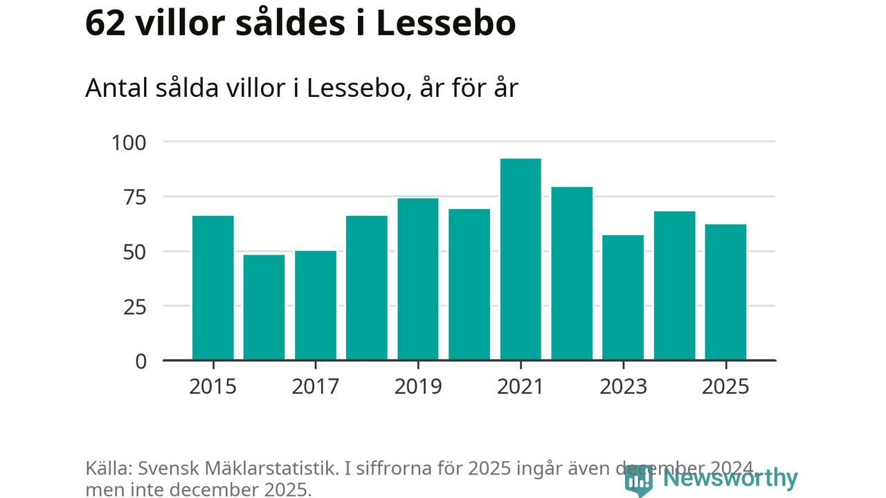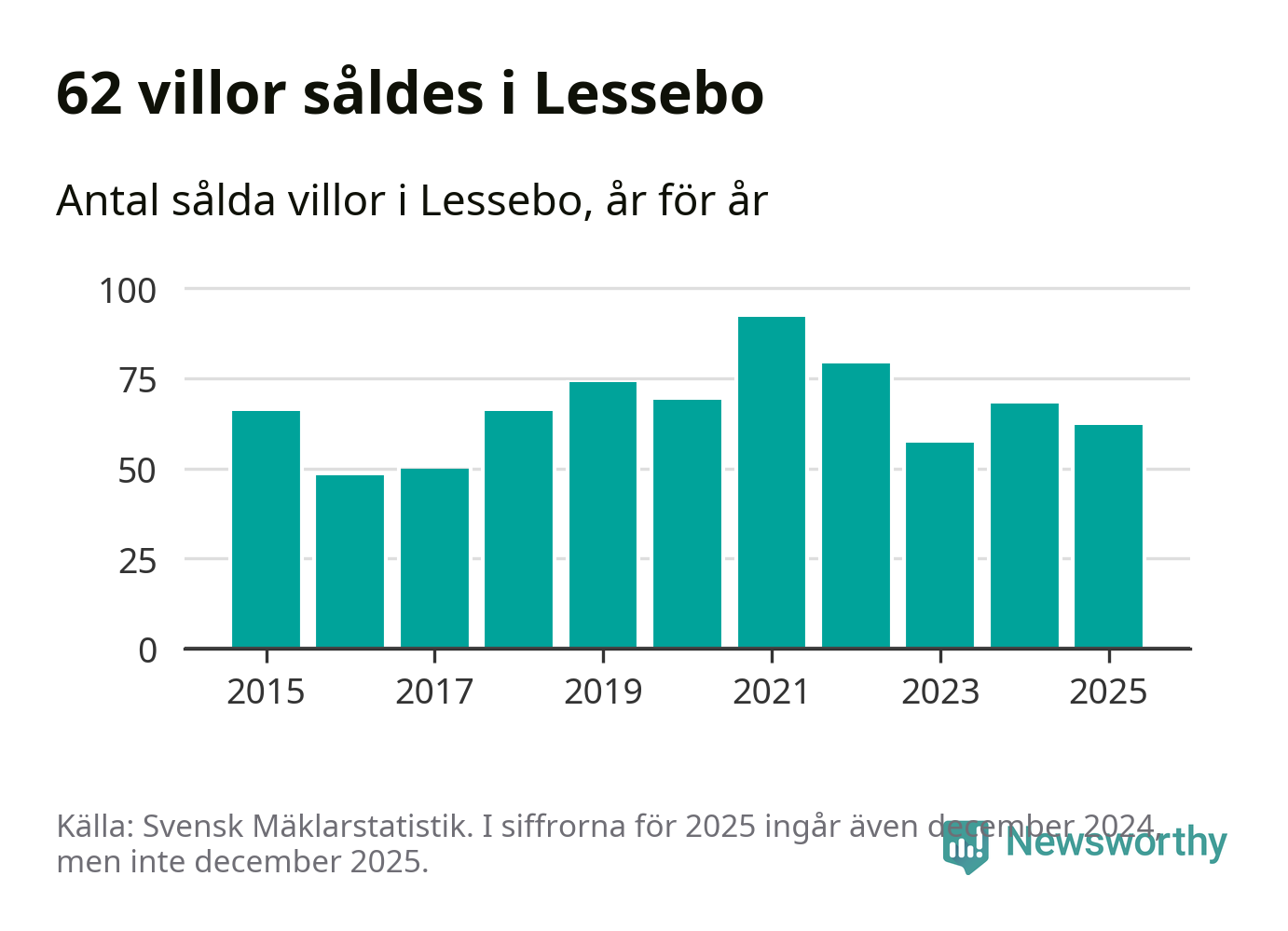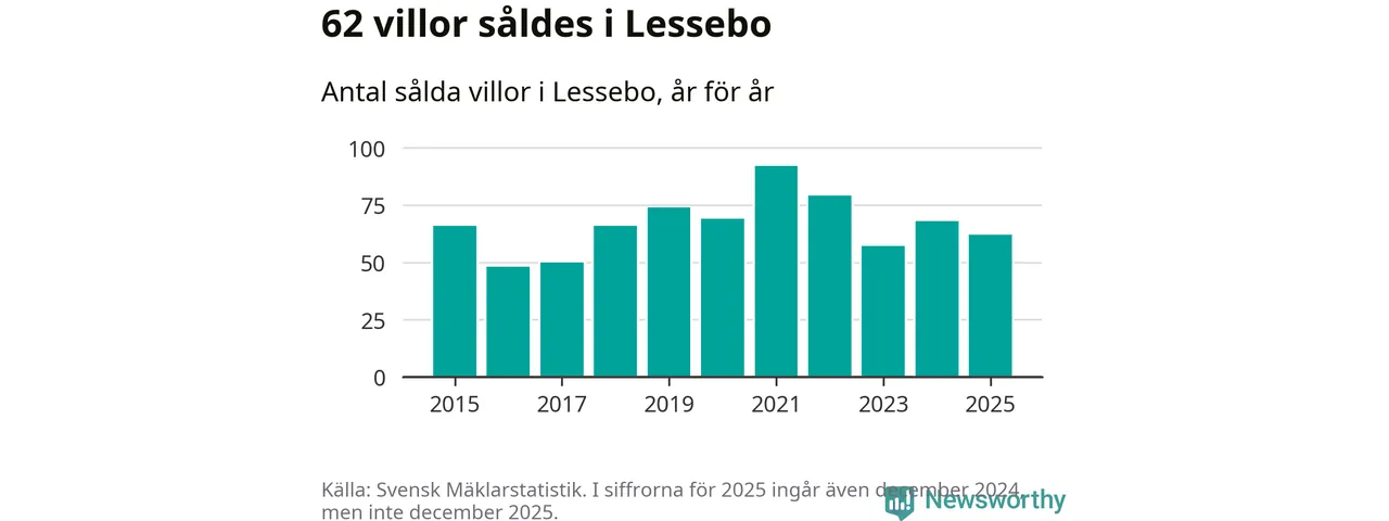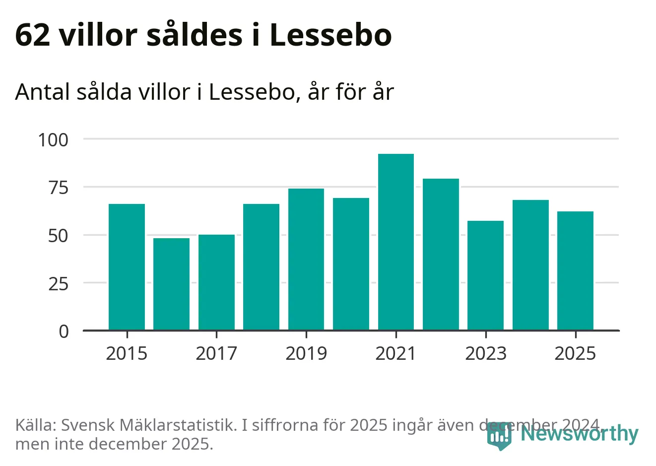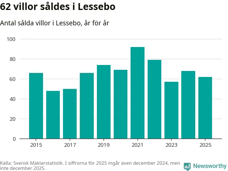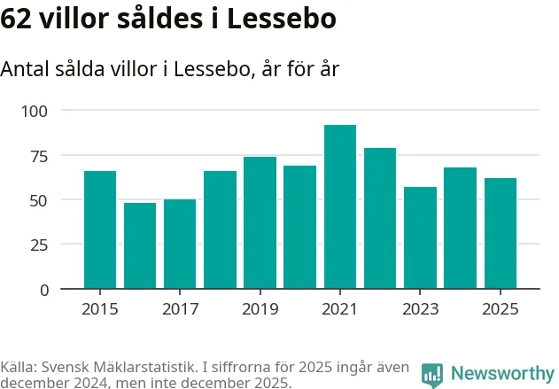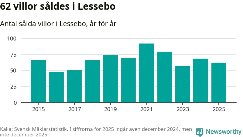 Antalet sålda villor minskade också. Totalt såldes 62 villor, att jämföra med 68 under 2024.