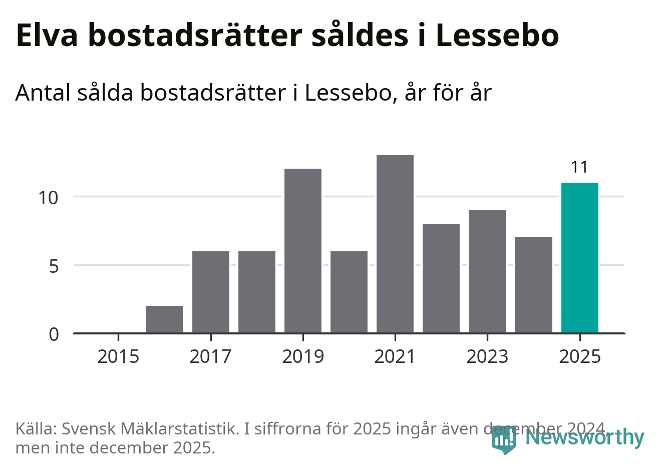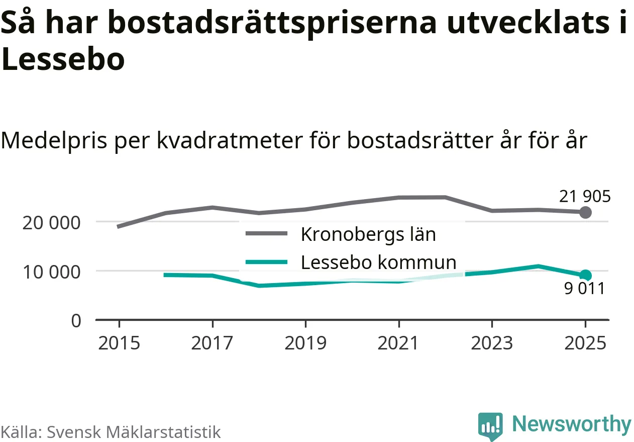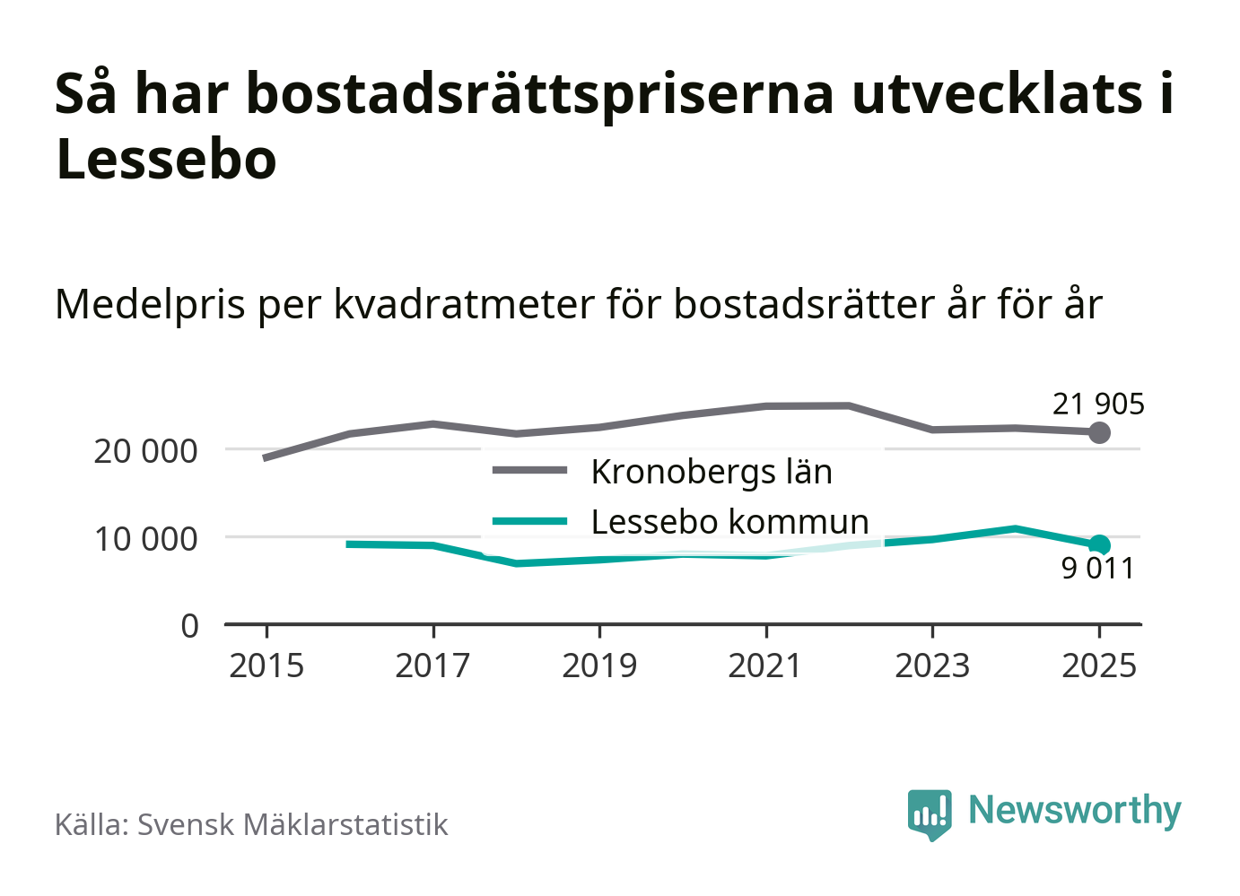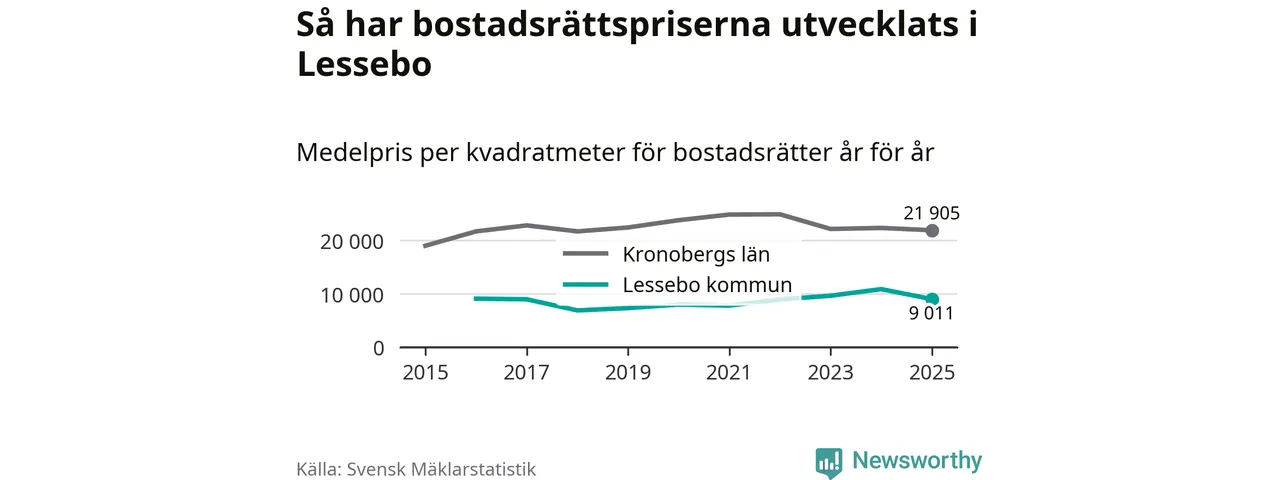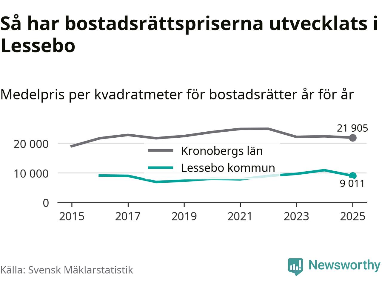 När det gäller bostadsrätter i Lessebo kommun såldes elva under året. Snittet per kvadratmeter landade på omkring 9 000 kronor. Det är en minskning jämfört med förra året.