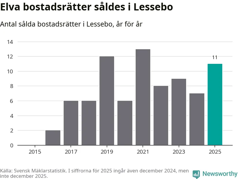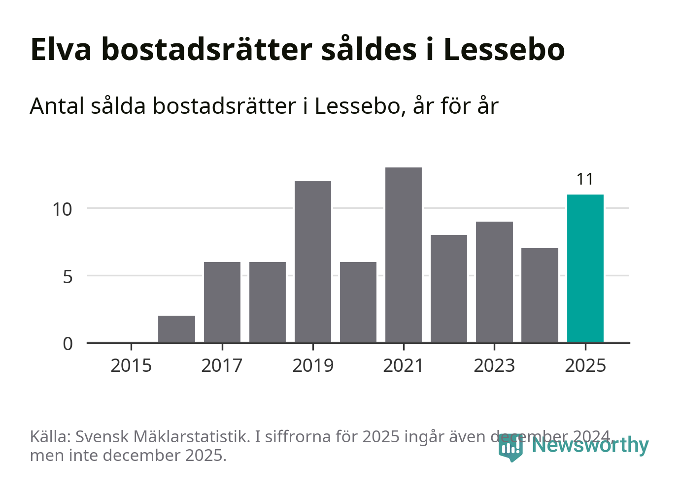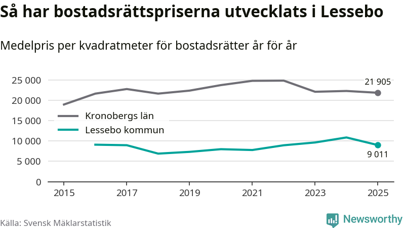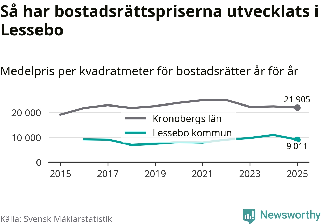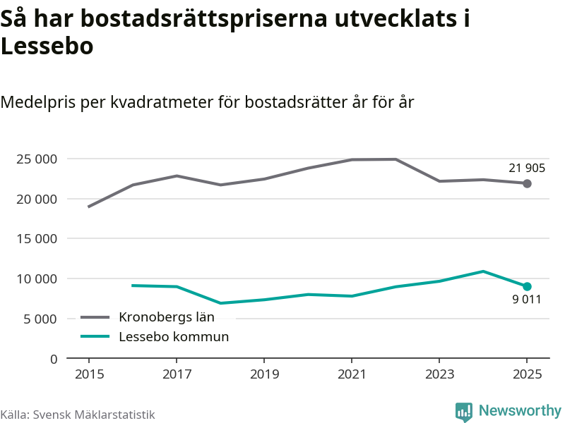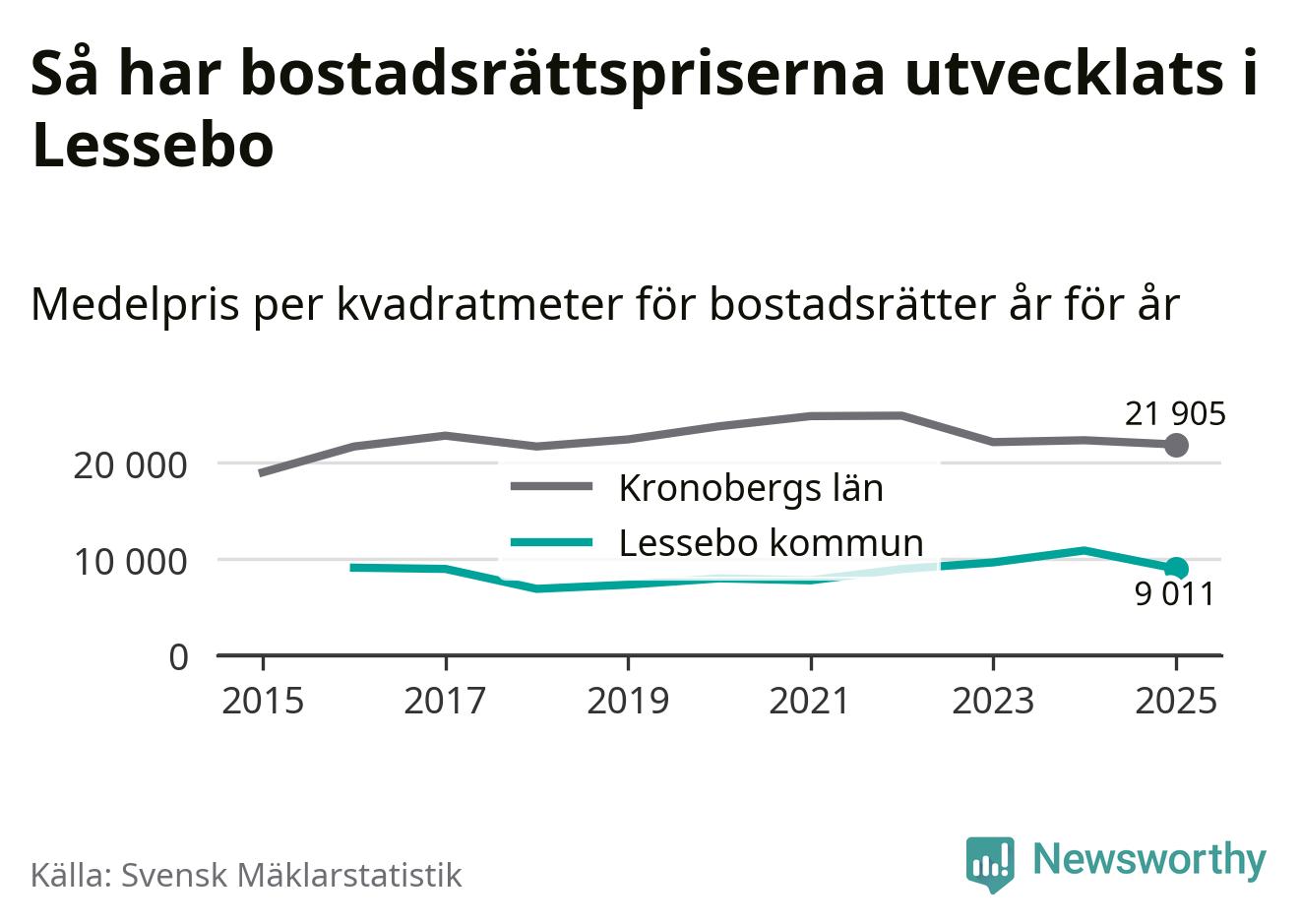 När det gäller bostadsrätter i Lessebo kommun såldes elva under året. Snittet per kvadratmeter landade på omkring 9 000 kronor. Det är en minskning jämfört med förra året.