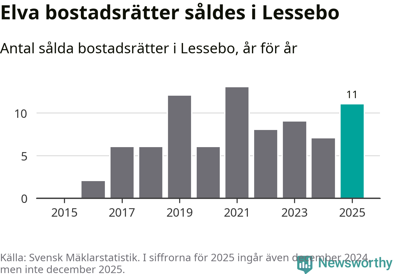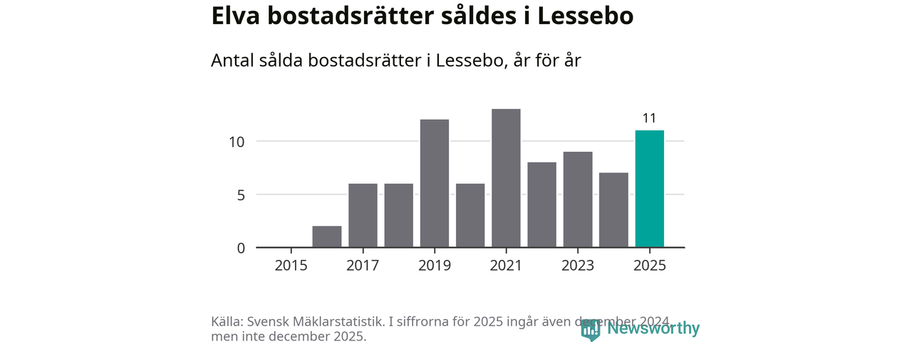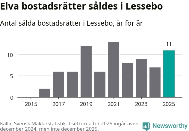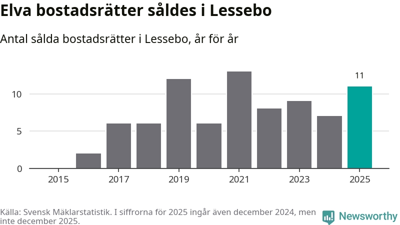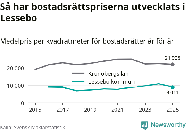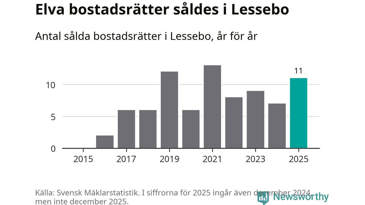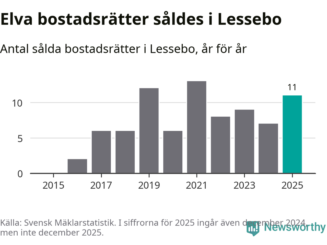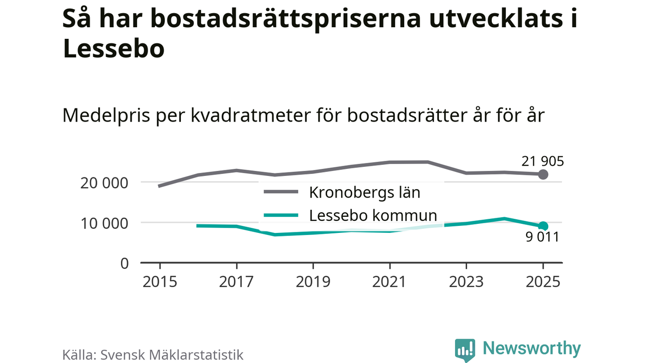 När det gäller bostadsrätter i Lessebo kommun såldes elva under året. Snittet per kvadratmeter landade på omkring 9 000 kronor. Det är en minskning jämfört med förra året.