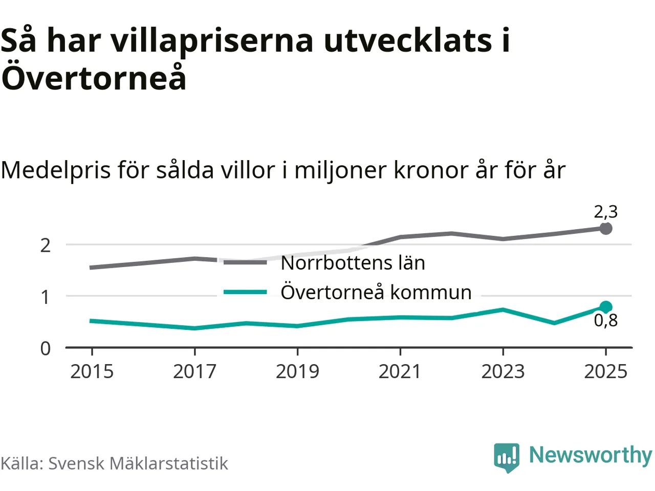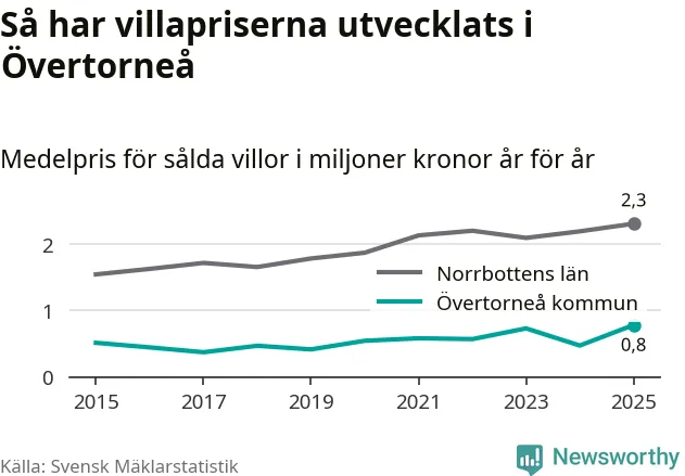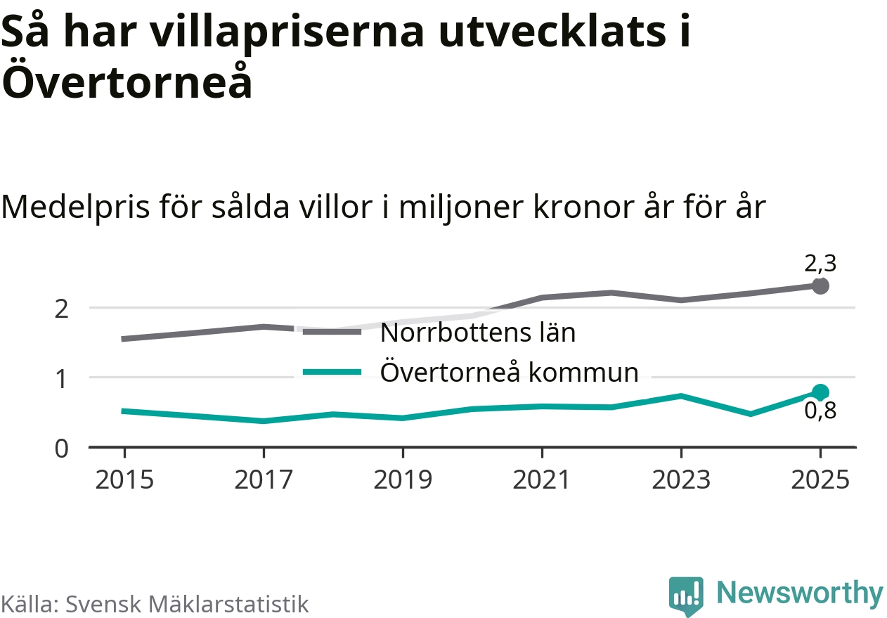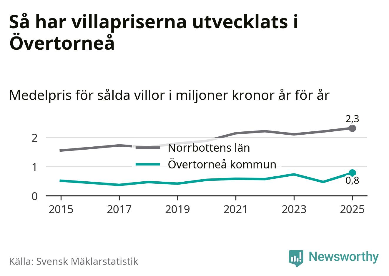 783 000 kronor är medelpriset för de villor som såldes i Övertorneå kommun under året, eller 6 188 kronor per kvadratmeter. Det innebär en prisökning med 66 procent på ett år. Det är det högsta årssnittet på åtminstone tio år.