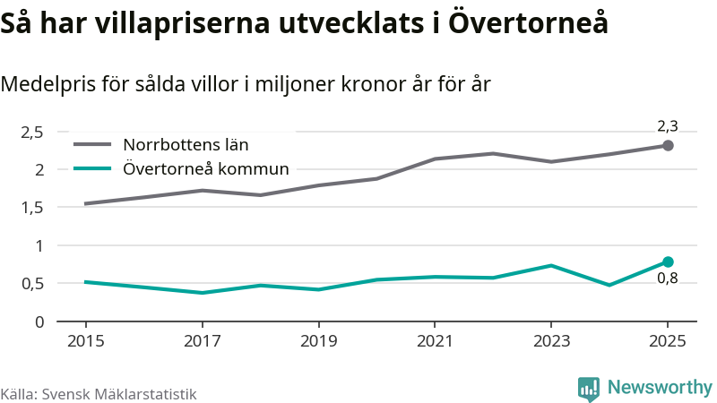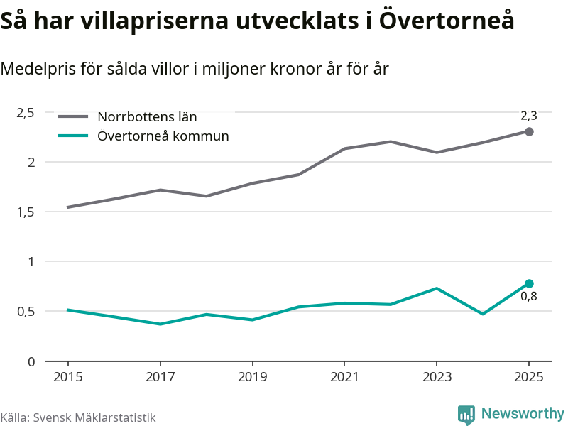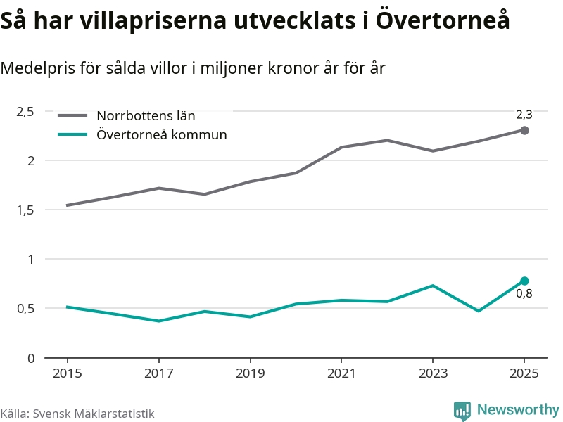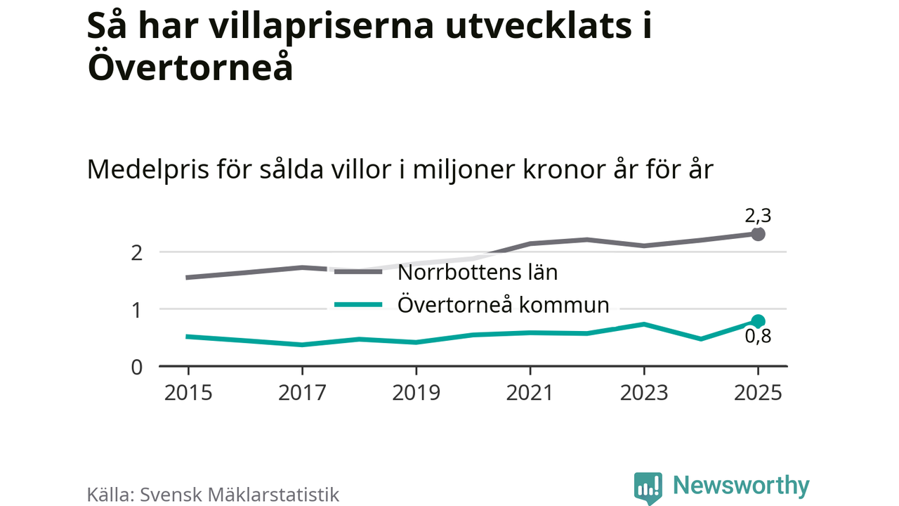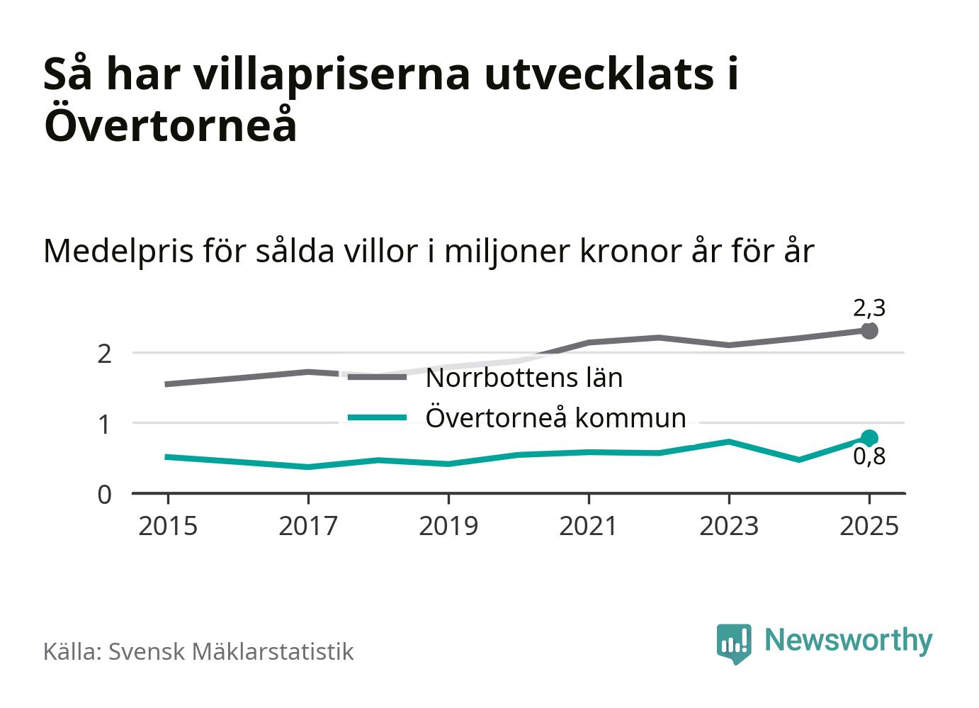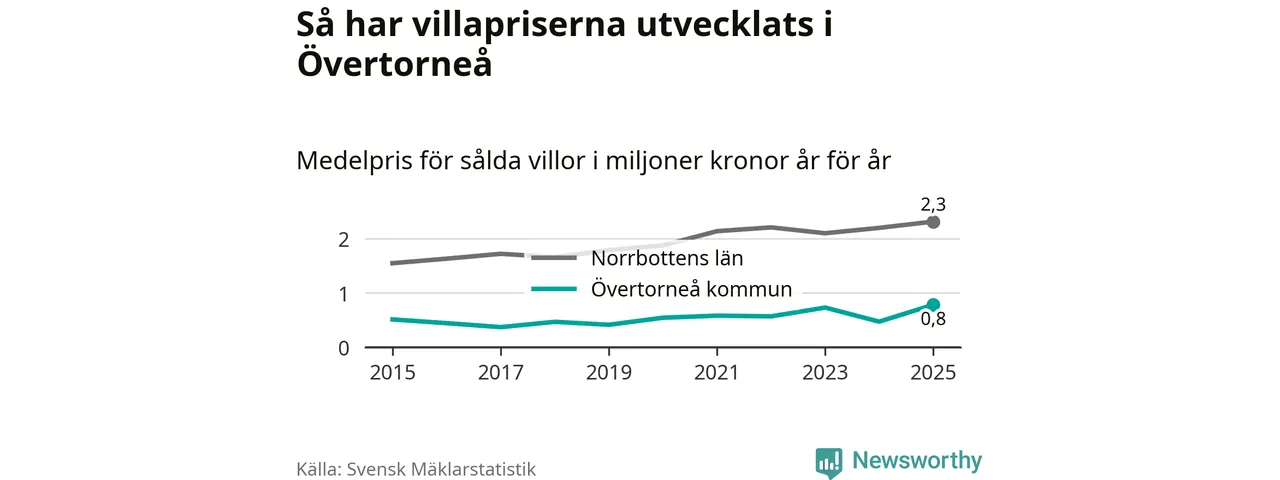 783 000 kronor är medelpriset för de villor som såldes i Övertorneå kommun under året, eller 6 188 kronor per kvadratmeter. Det innebär en prisökning med 66 procent på ett år. Det är det högsta årssnittet på åtminstone tio år.