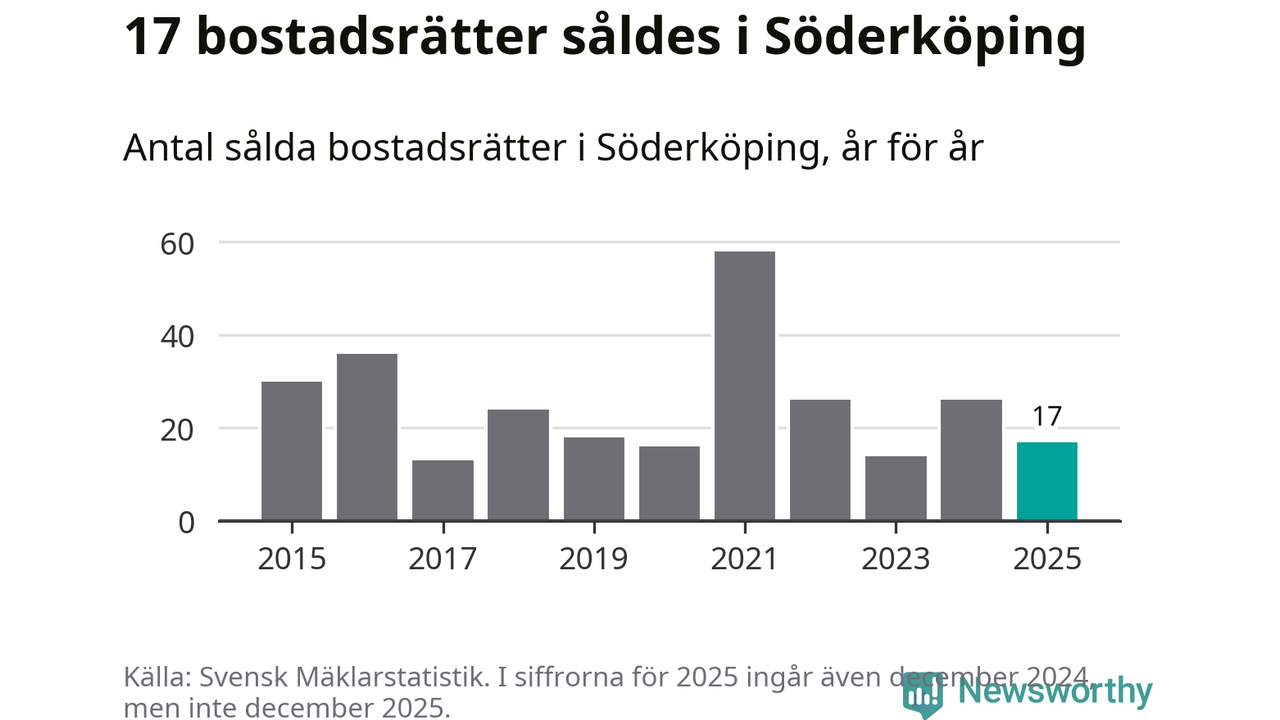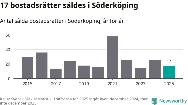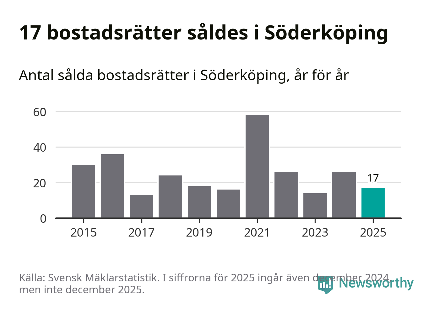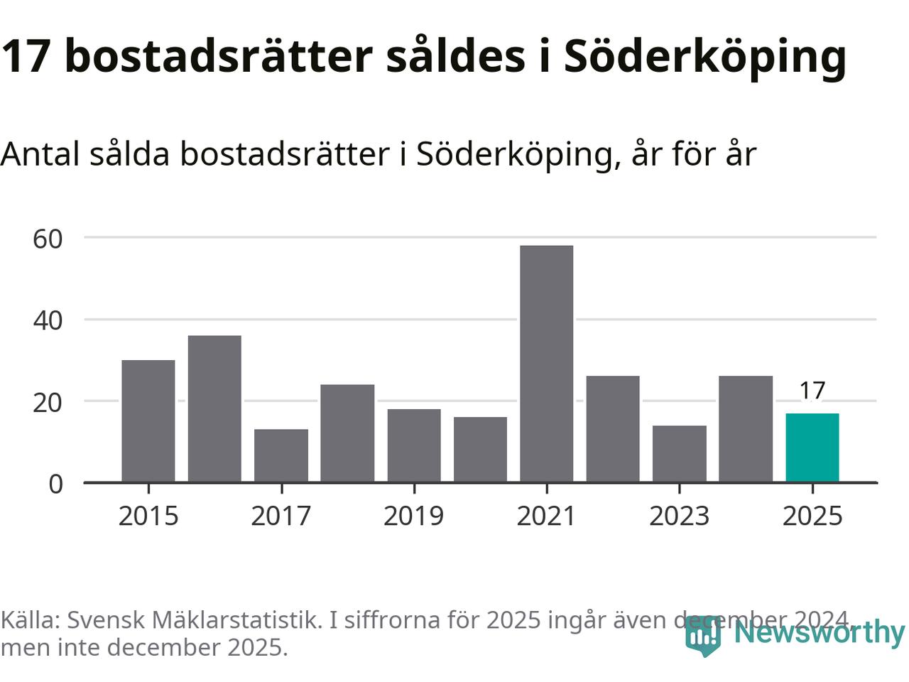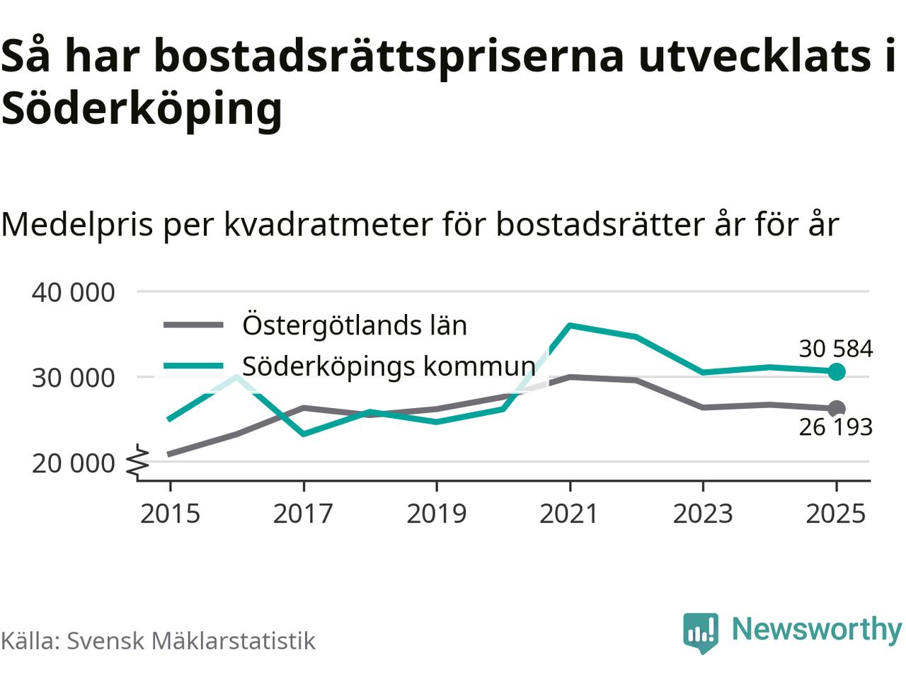 När det gäller bostadsrätter i Söderköpings kommun såldes 17 under året. Snittet per kvadratmeter landade på omkring 30 600 kronor. Det är en minskning jämfört med förra året.