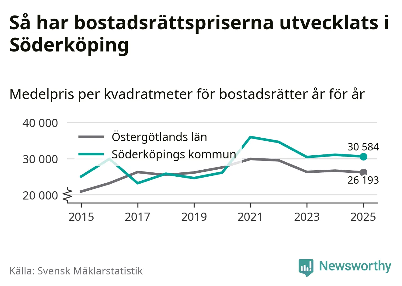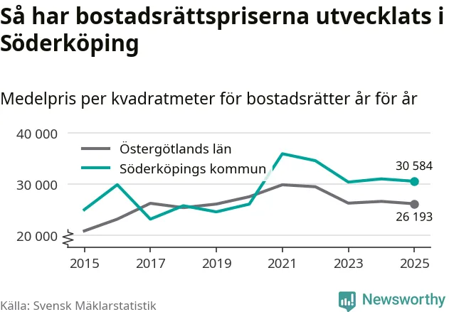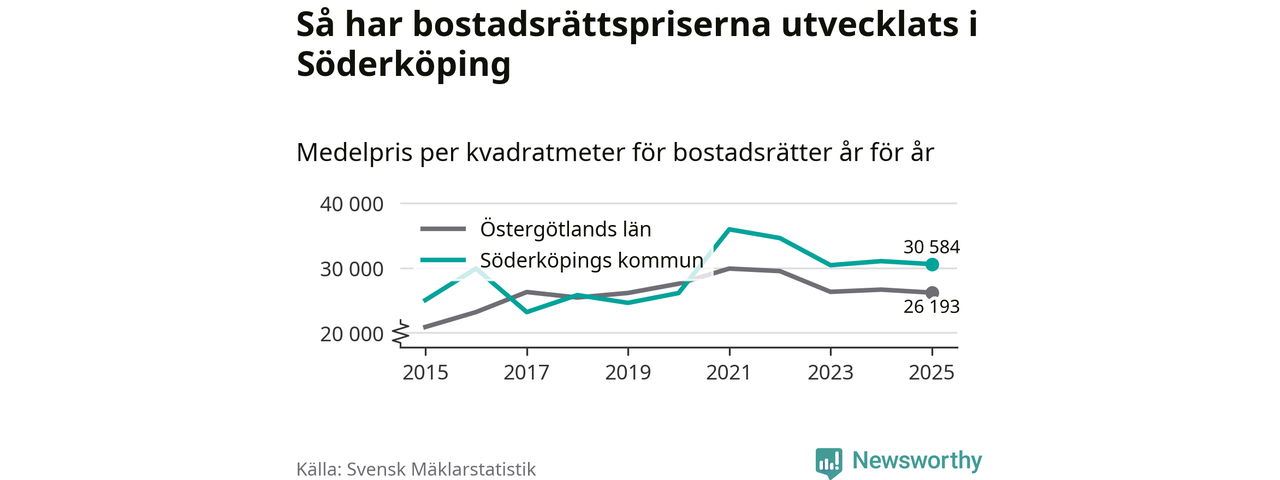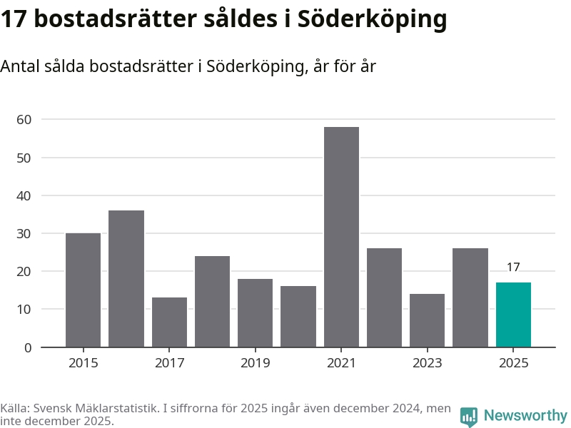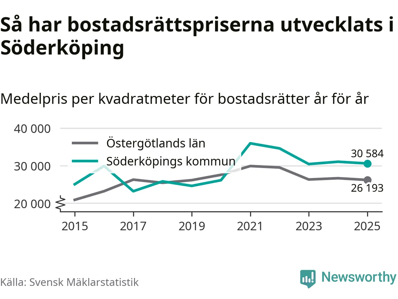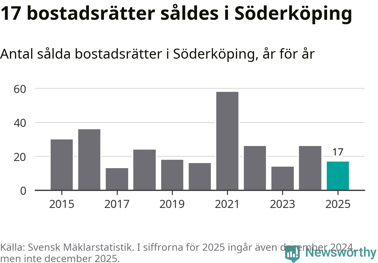 När det gäller bostadsrätter i Söderköpings kommun såldes 17 under året. Snittet per kvadratmeter landade på omkring 30 600 kronor. Det är en minskning jämfört med förra året.