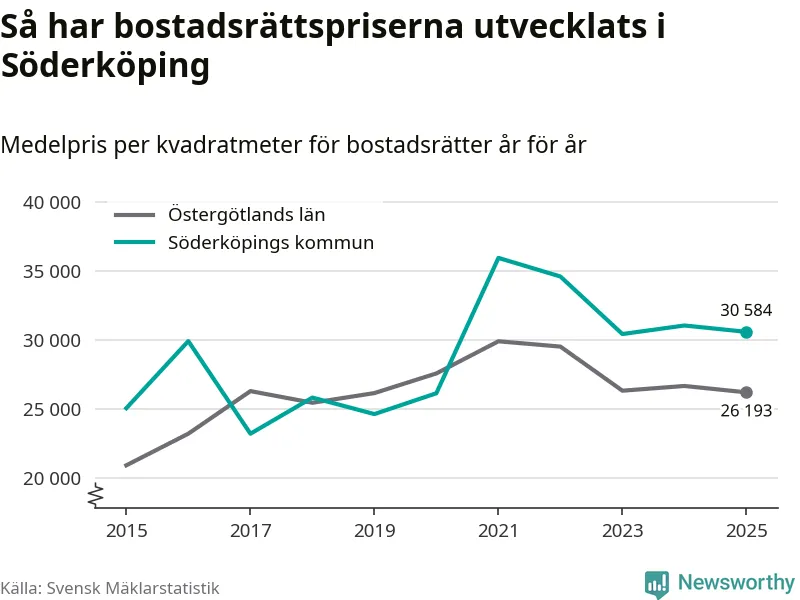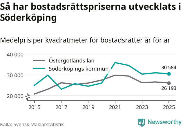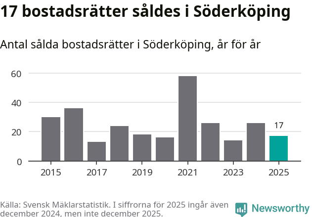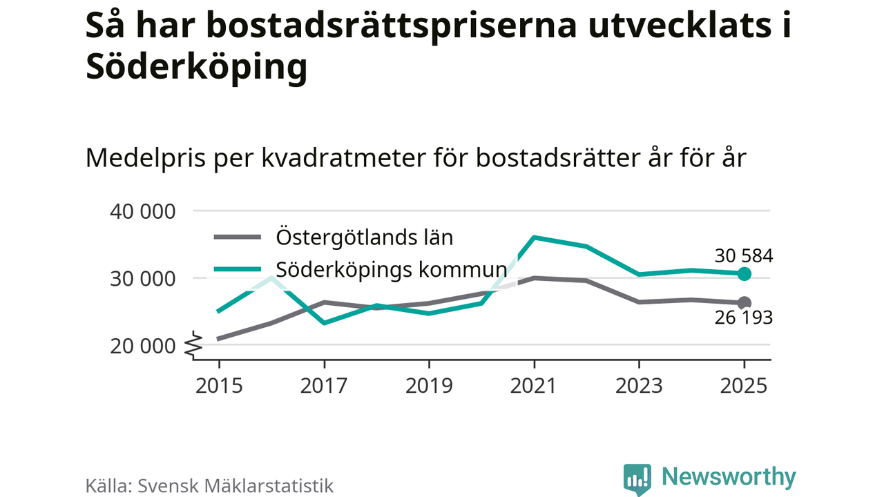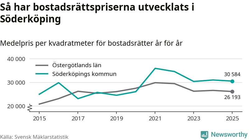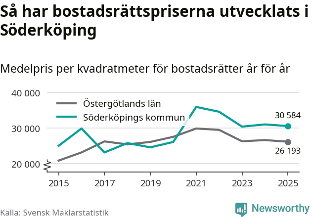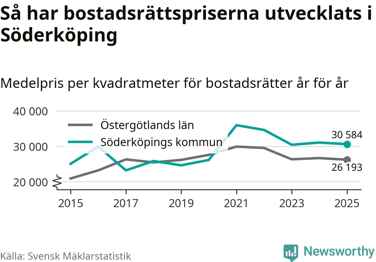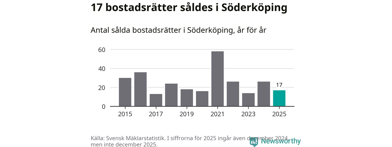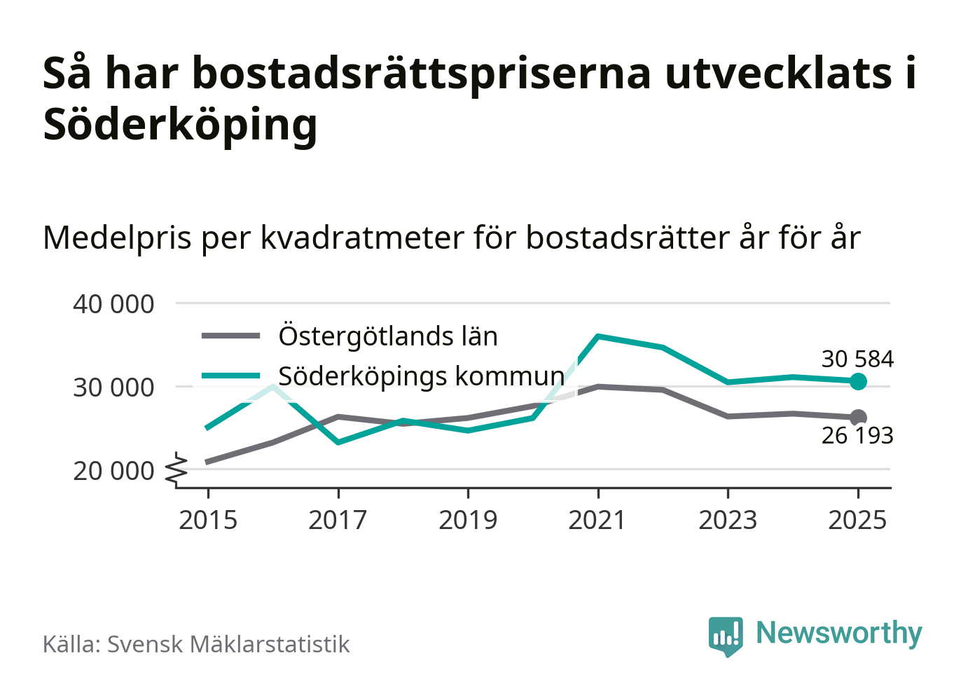 När det gäller bostadsrätter i Söderköpings kommun såldes 17 under året. Snittet per kvadratmeter landade på omkring 30 600 kronor. Det är en minskning jämfört med förra året.
