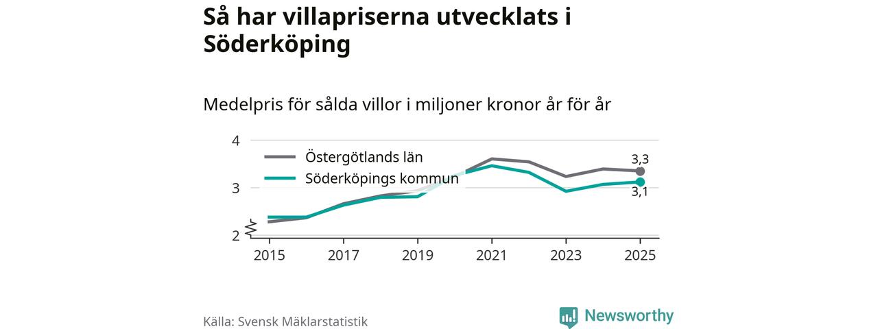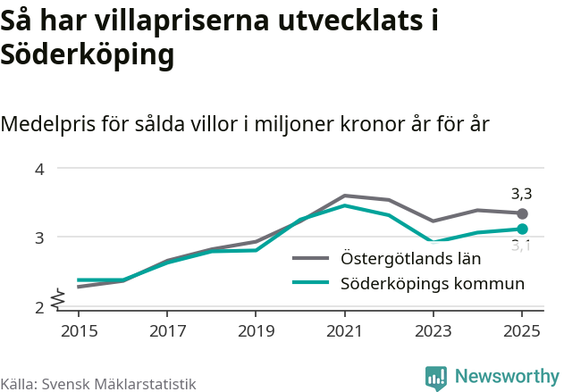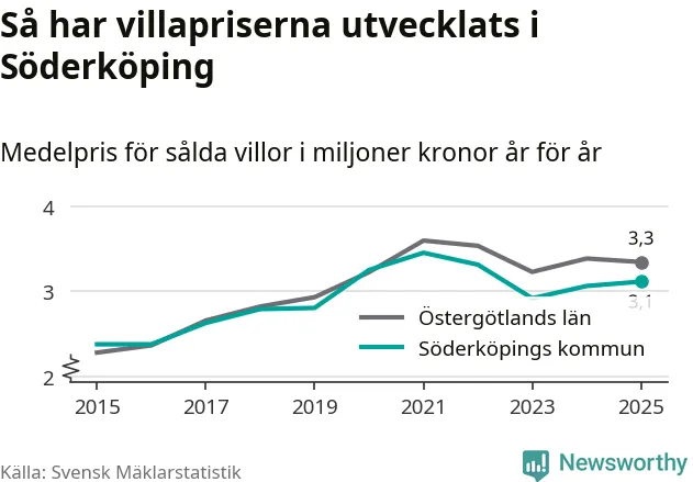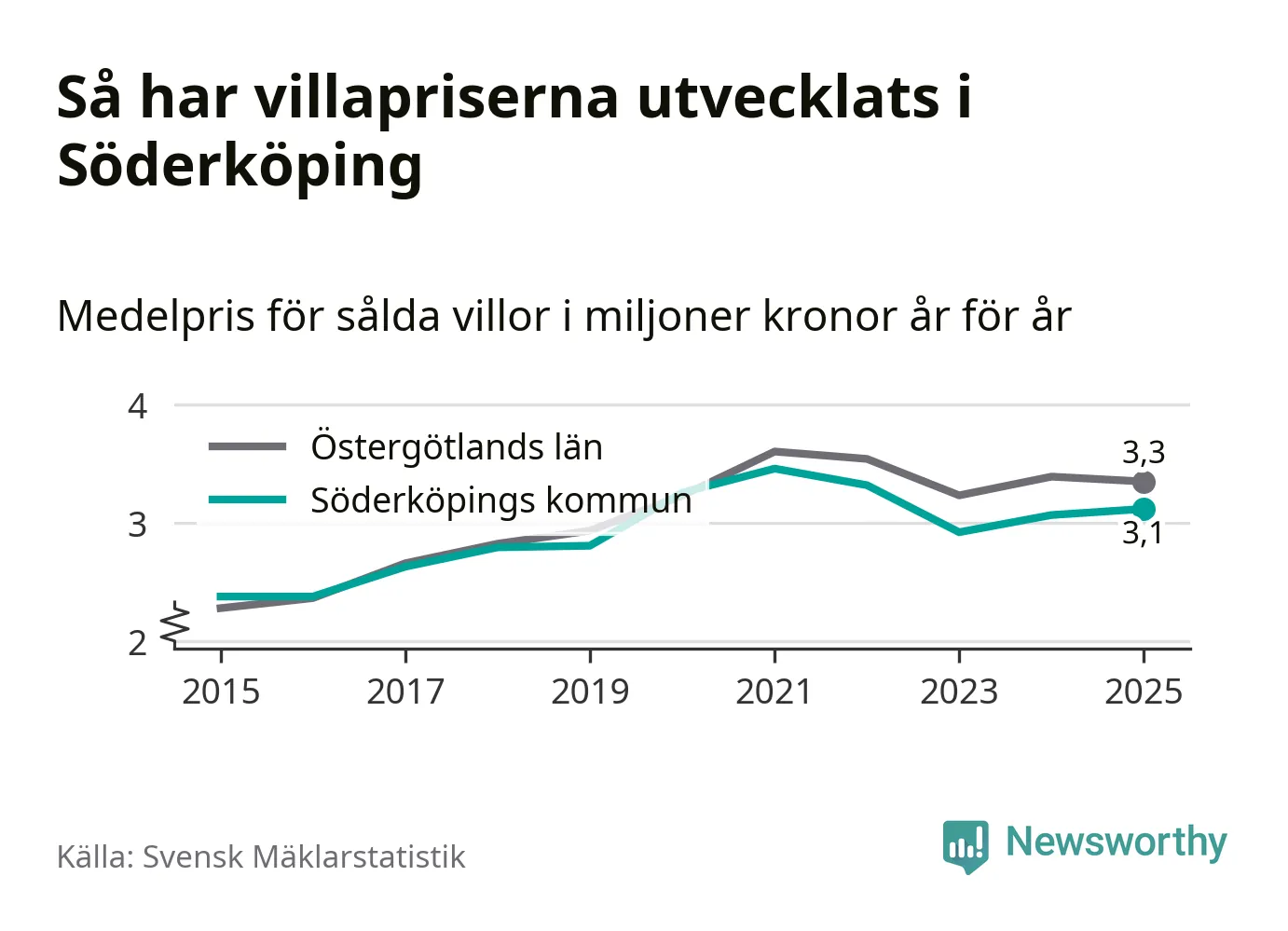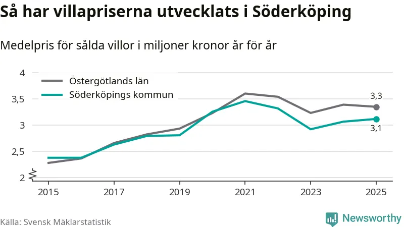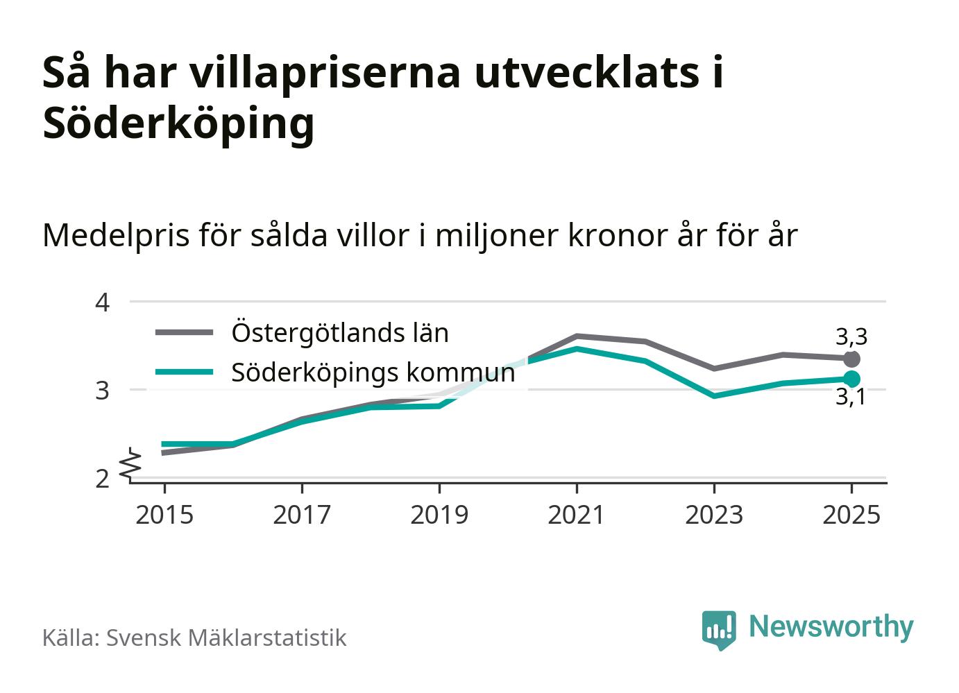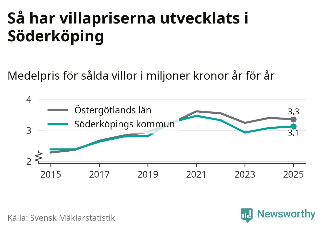3,1 miljoner kronor är medelpriset för de villor som såldes i Söderköpings kommun under året, eller 29 173 kronor per kvadratmeter. Det innebär en prisökning med två procent på ett år och är andra året i rad som priserna ökar i kommunen.