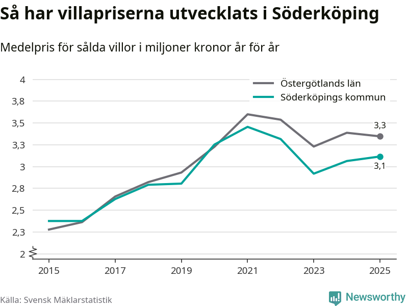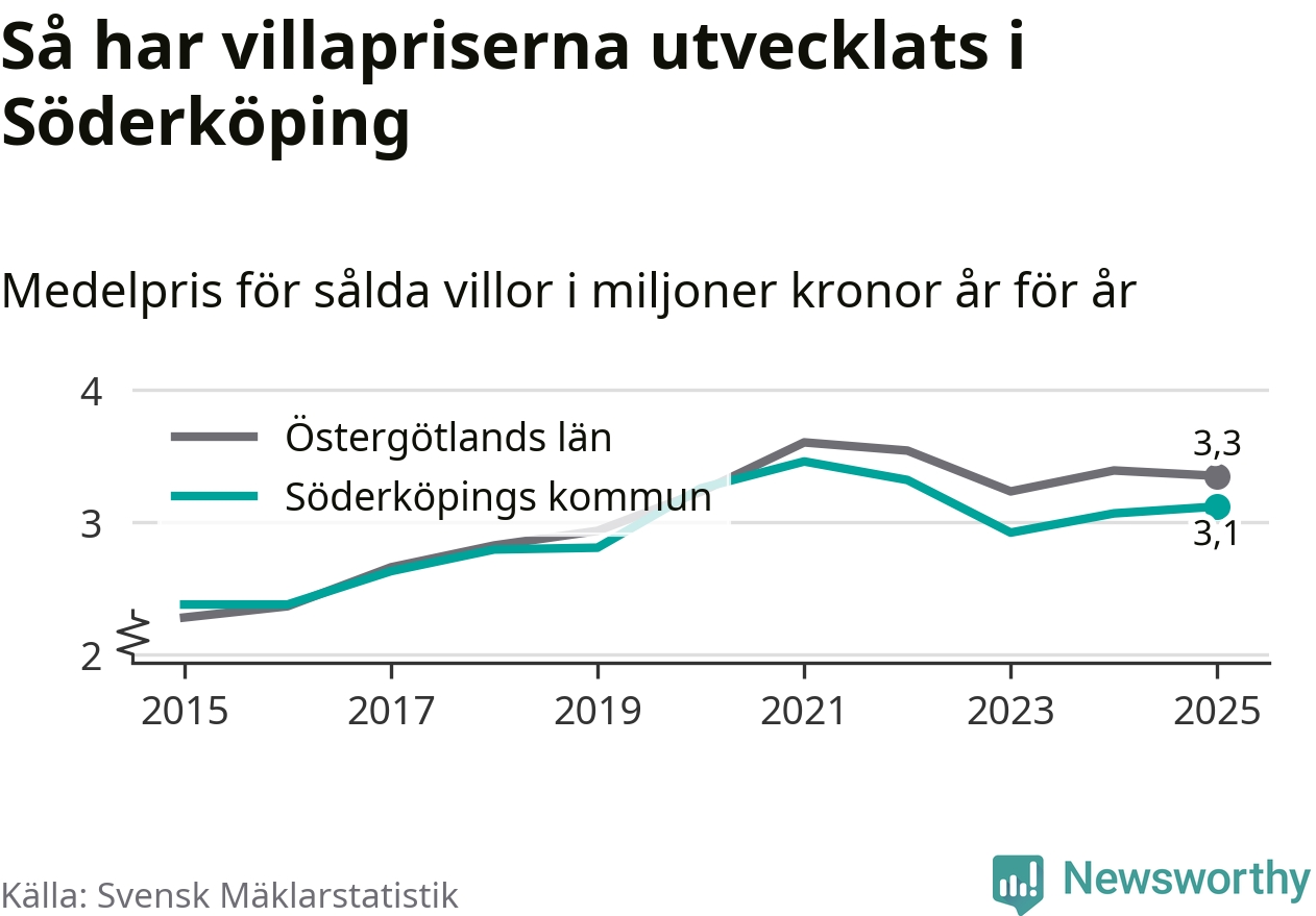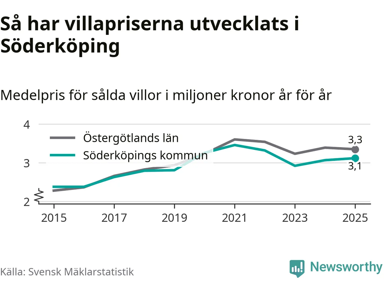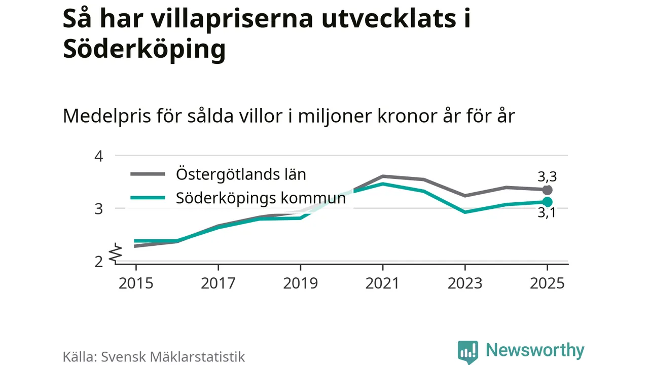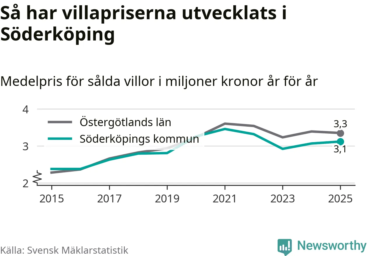3,1 miljoner kronor är medelpriset för de villor som såldes i Söderköpings kommun under året, eller 29 173 kronor per kvadratmeter. Det innebär en prisökning med två procent på ett år och är andra året i rad som priserna ökar i kommunen.