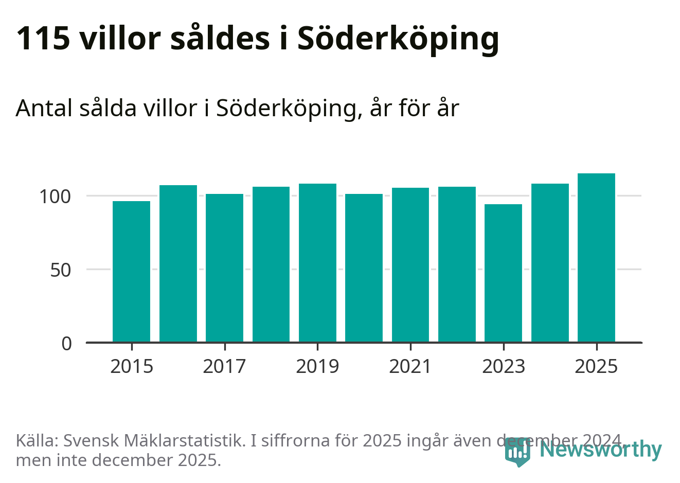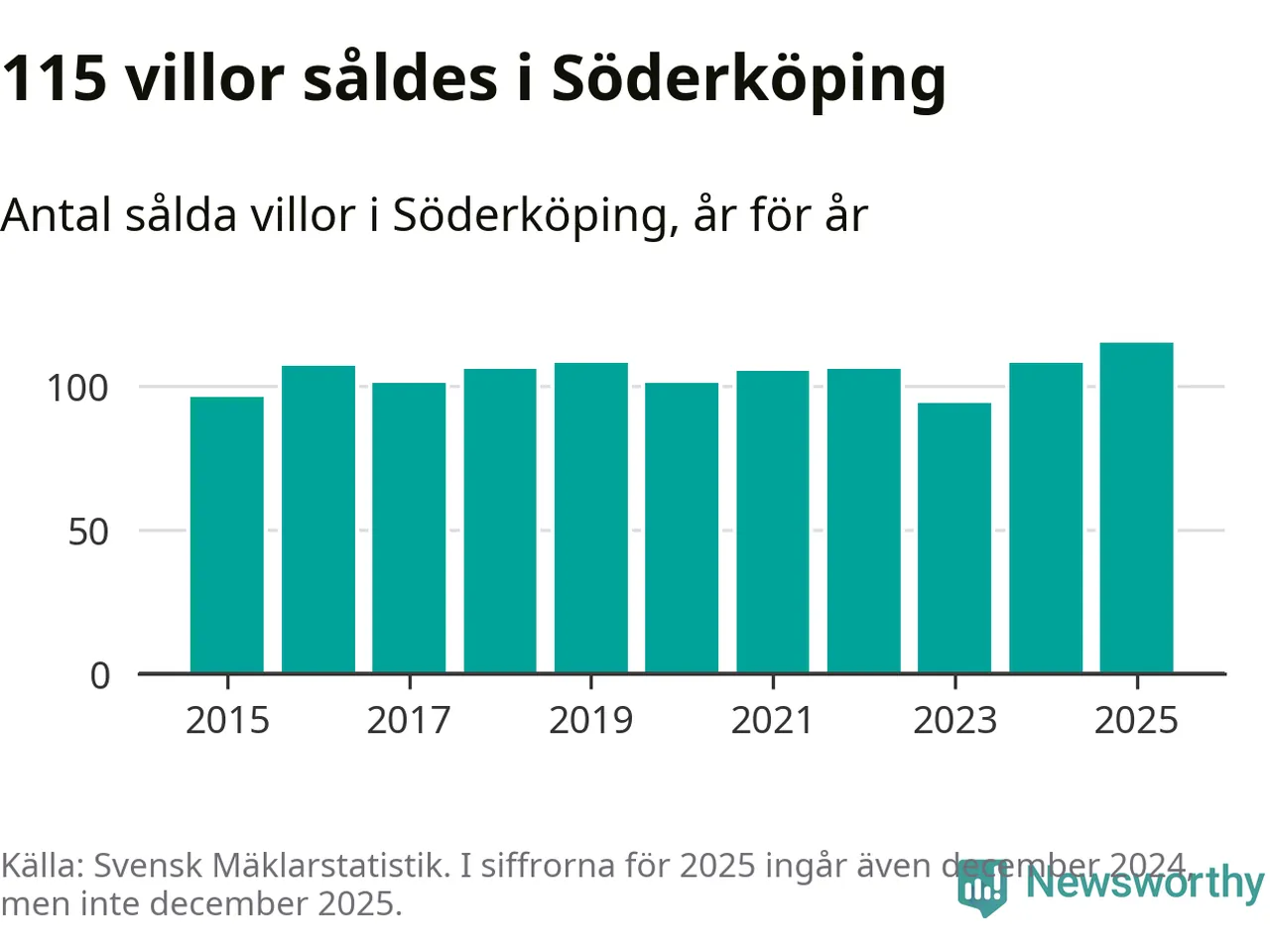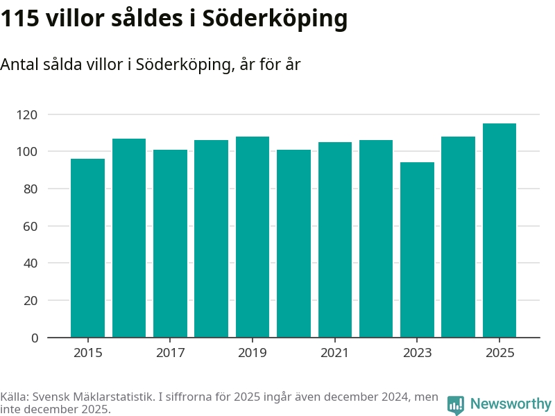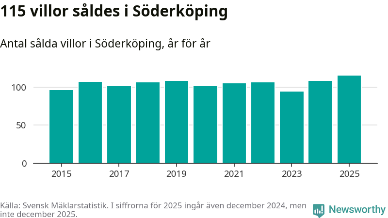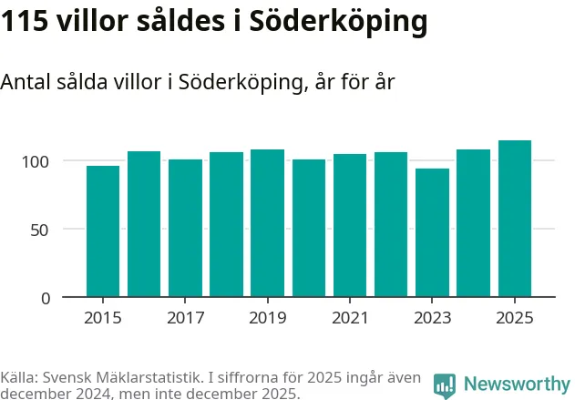 Antalet sålda villor ökade också. Totalt såldes 115 villor, att jämföra med 108 under 2024. Det är fler än något annat år sedan 2015.