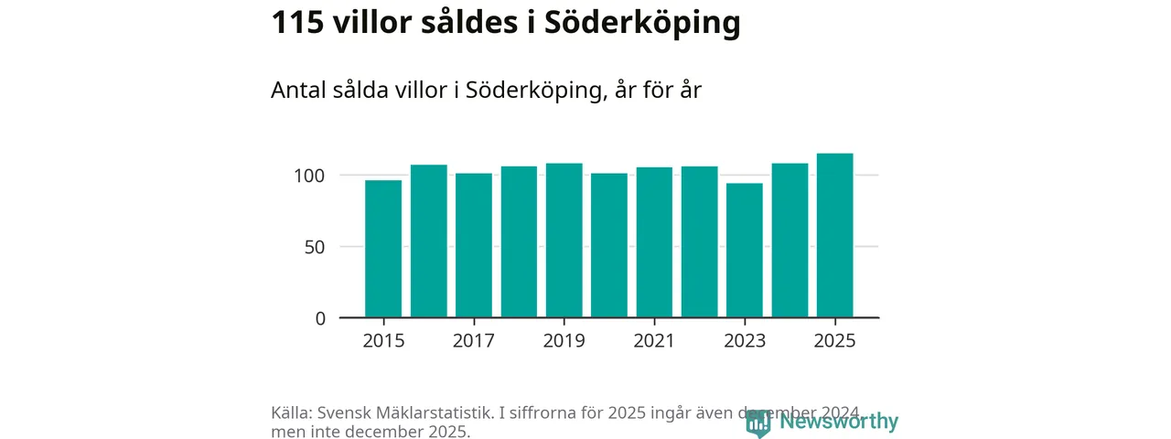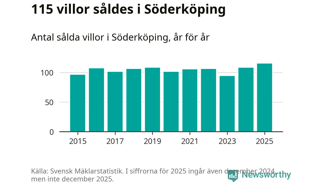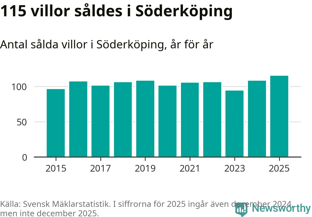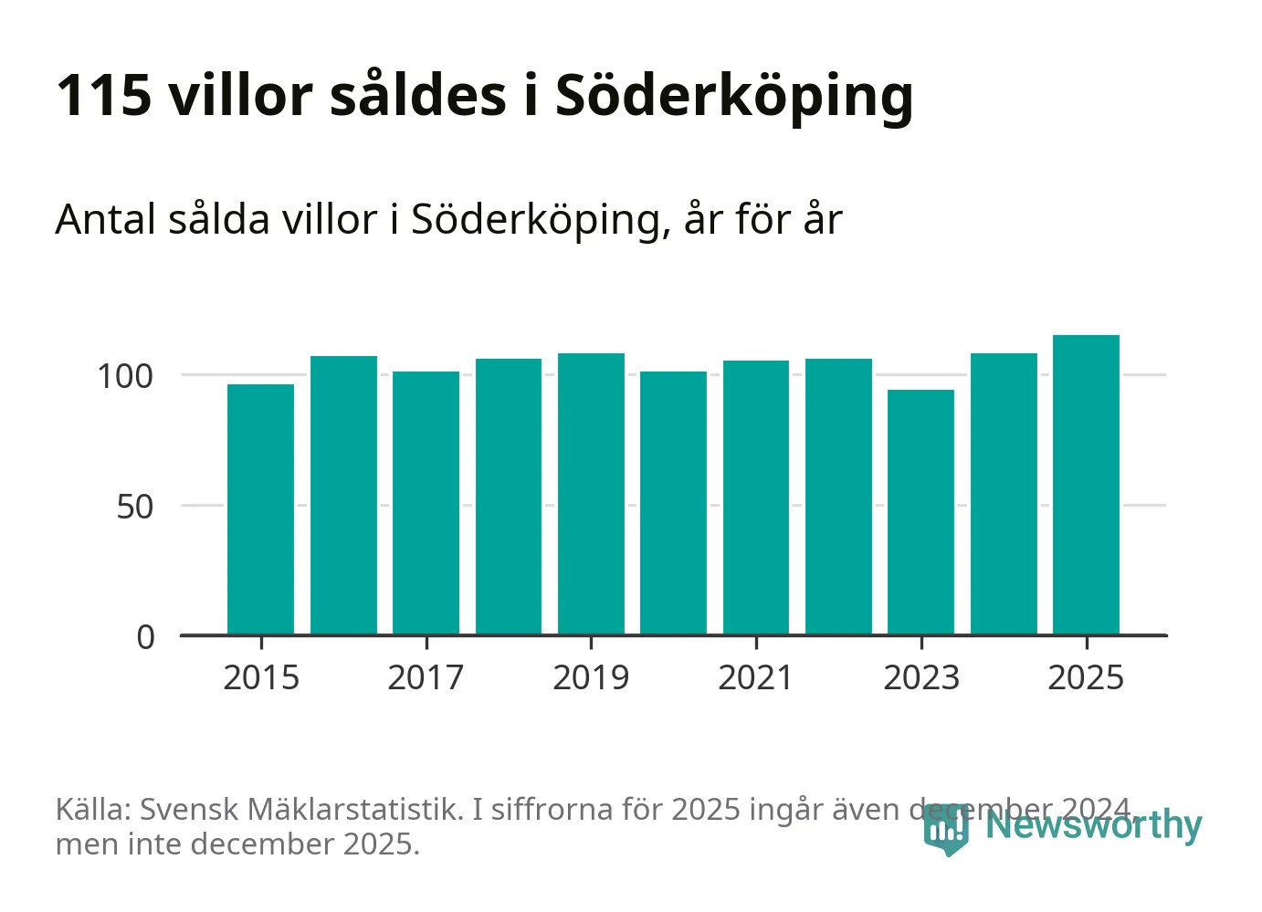 Antalet sålda villor ökade också. Totalt såldes 115 villor, att jämföra med 108 under 2024. Det är fler än något annat år sedan 2015.