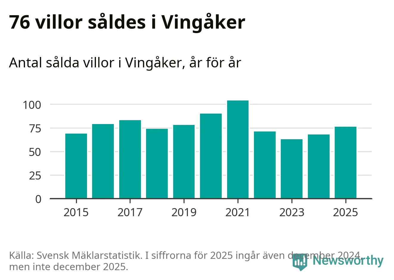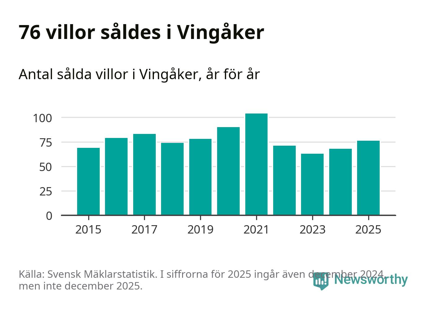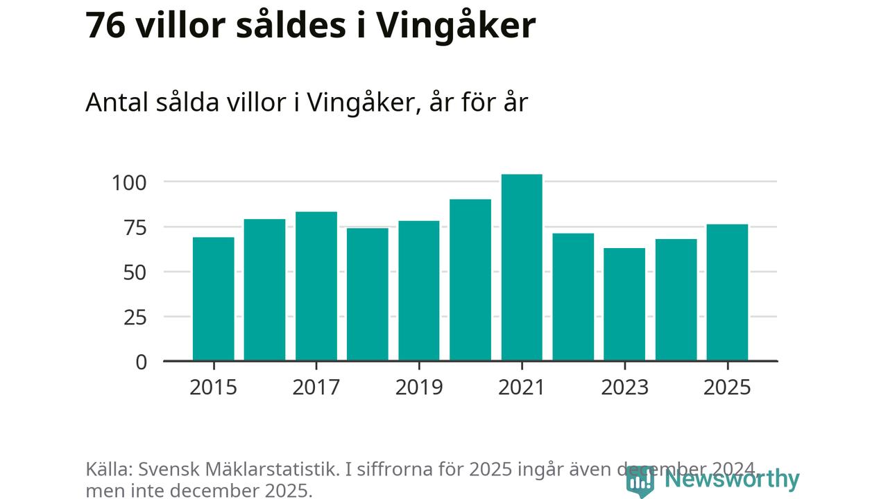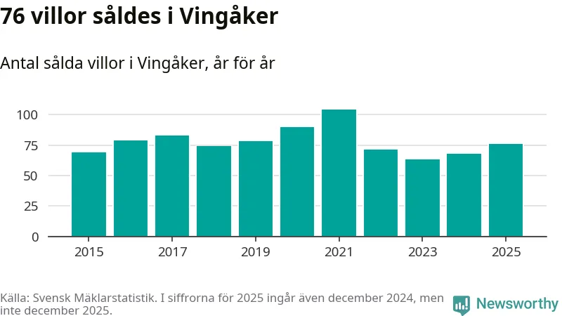 Antalet sålda villor ökade också. Totalt såldes 76 villor, att jämföra med 68 under 2024. Det är andra året i rad som antalet sålda villor ökar i kommunen.