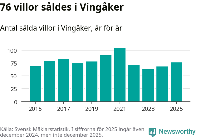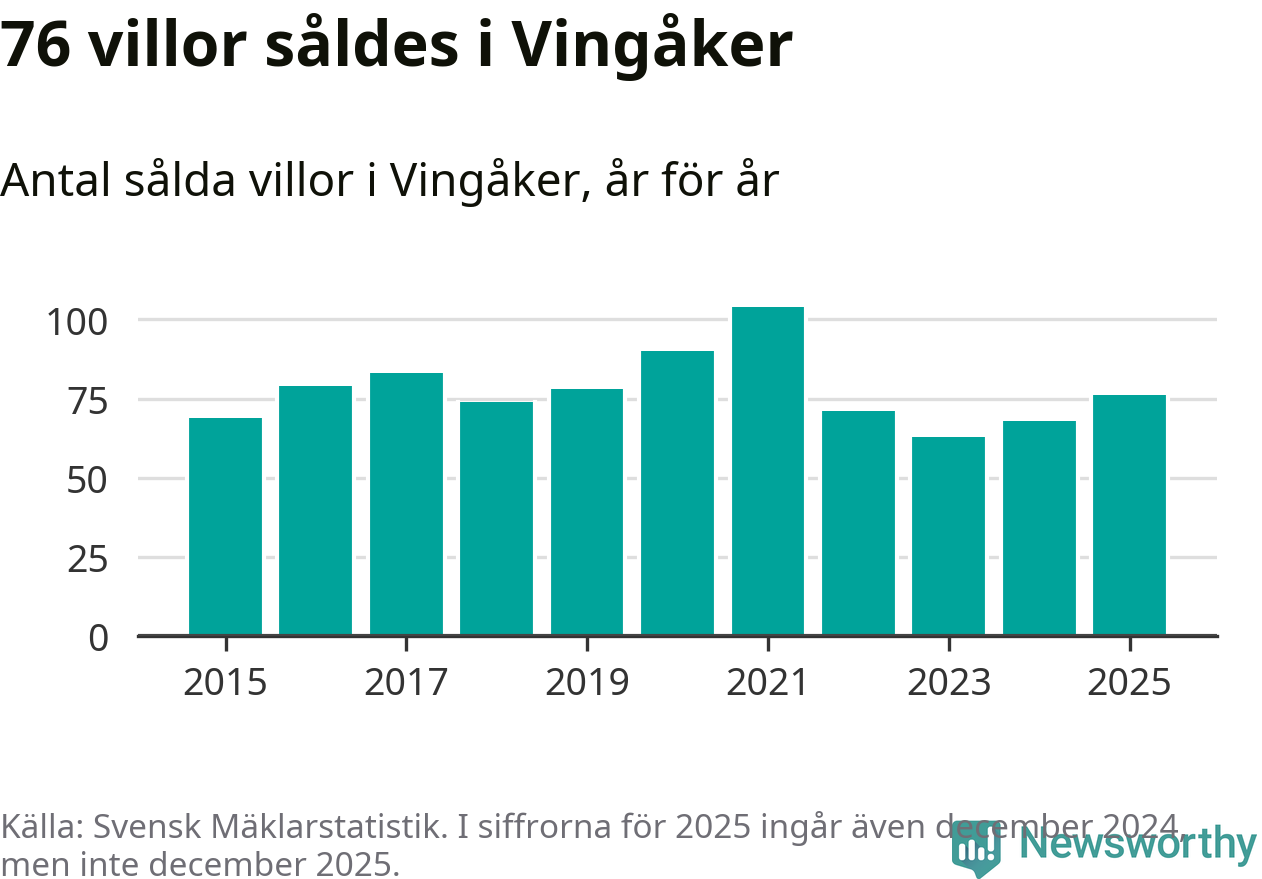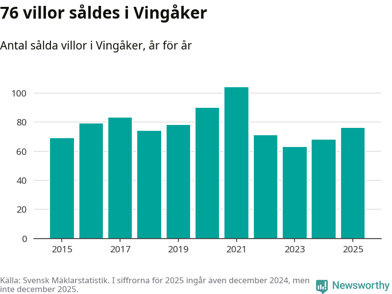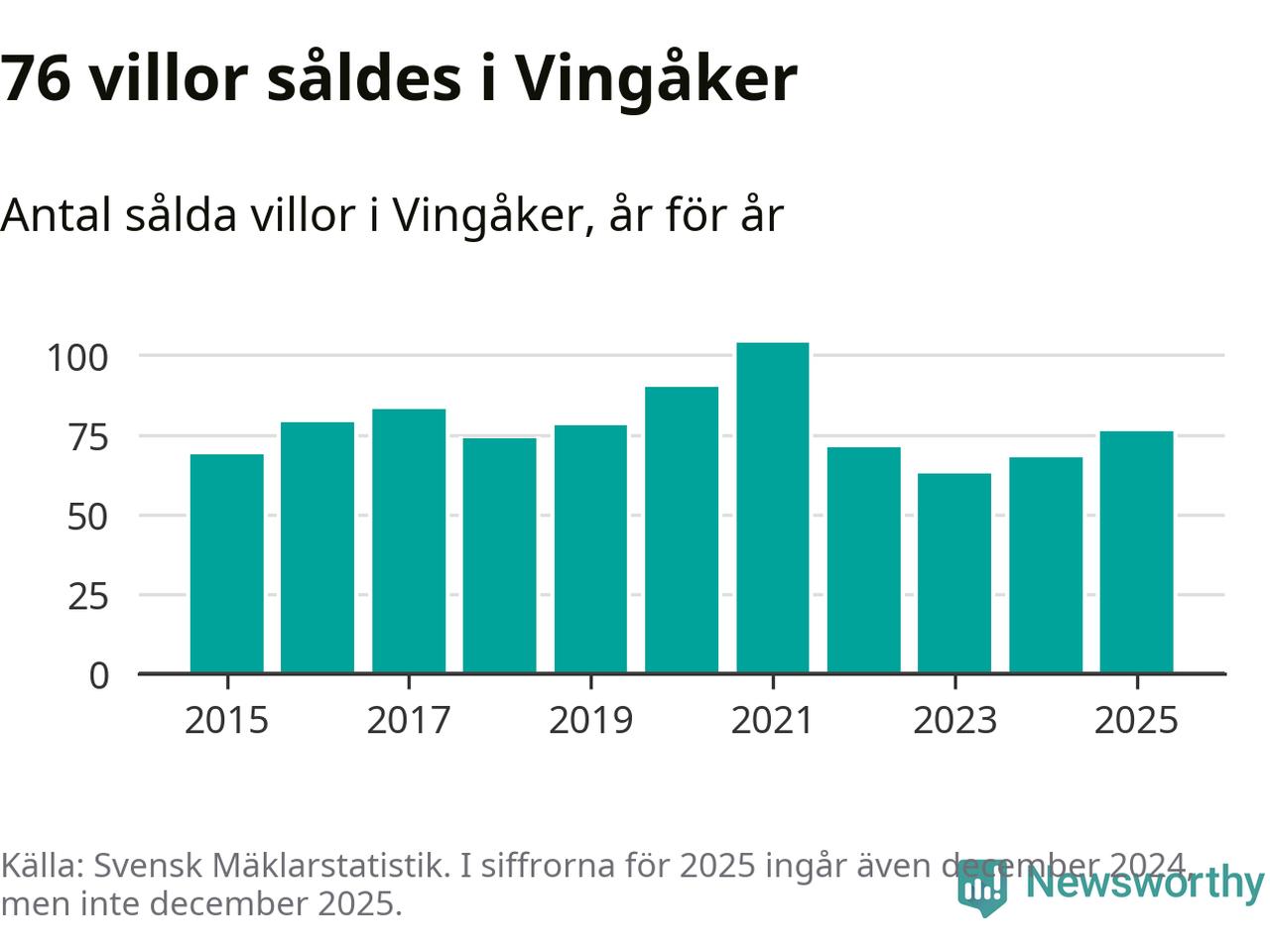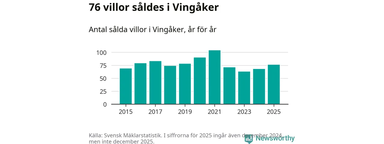 Antalet sålda villor ökade också. Totalt såldes 76 villor, att jämföra med 68 under 2024. Det är andra året i rad som antalet sålda villor ökar i kommunen.