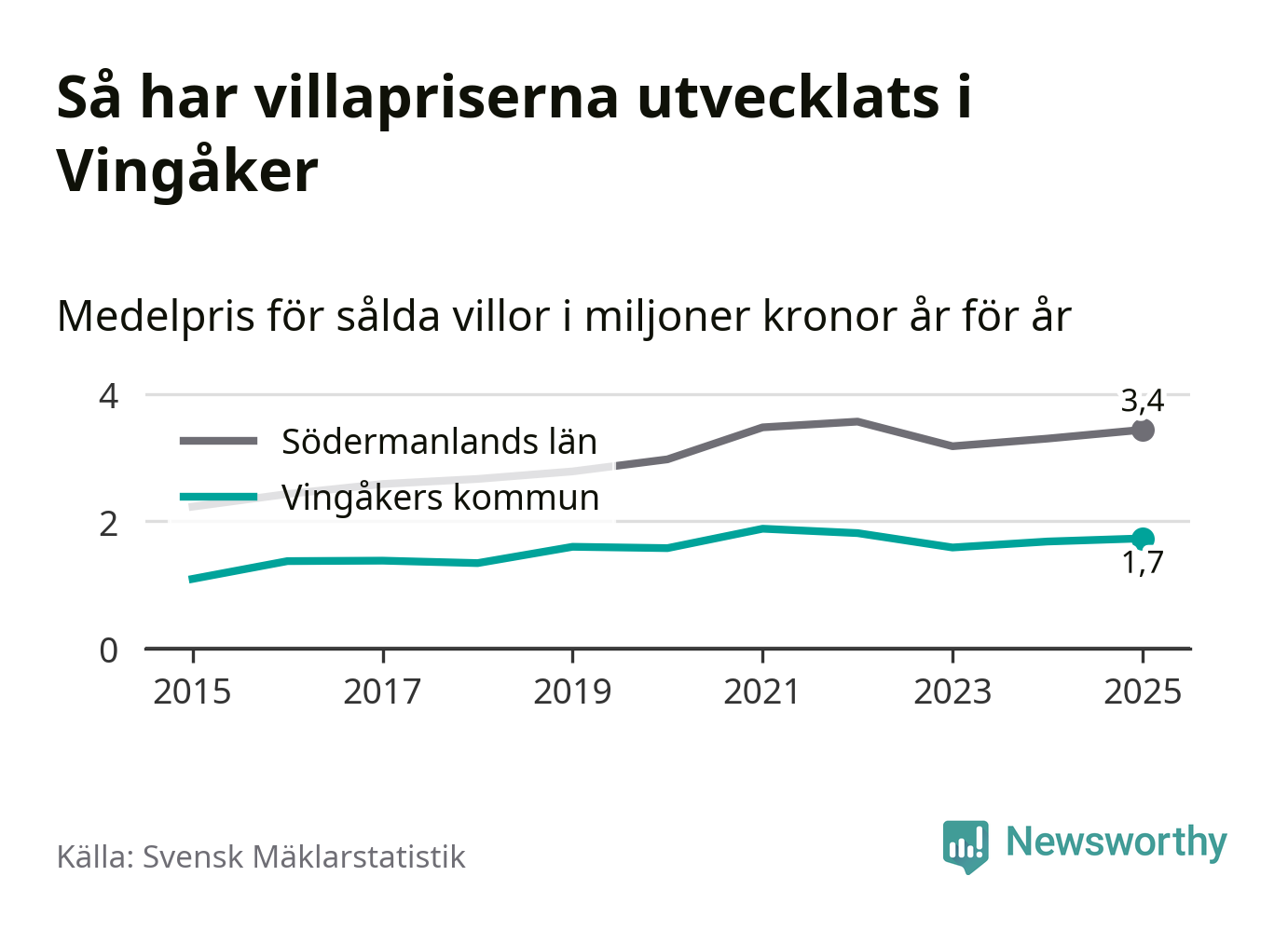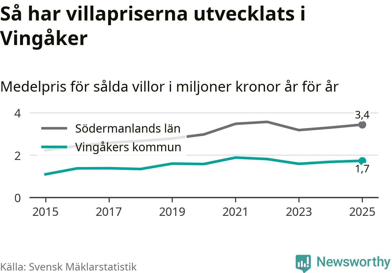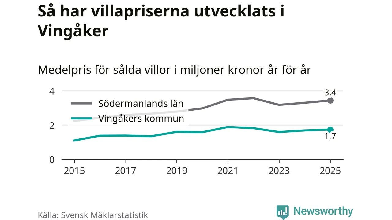 1,7 miljoner kronor är medelpriset för de villor som såldes i Vingåkers kommun under året, eller 14 996 kronor per kvadratmeter. Det innebär en prisökning med tre procent på ett år och är andra året i rad som priserna ökar i kommunen.