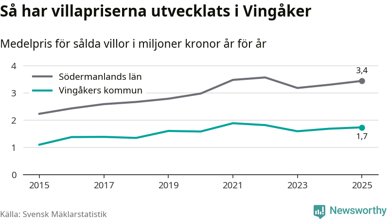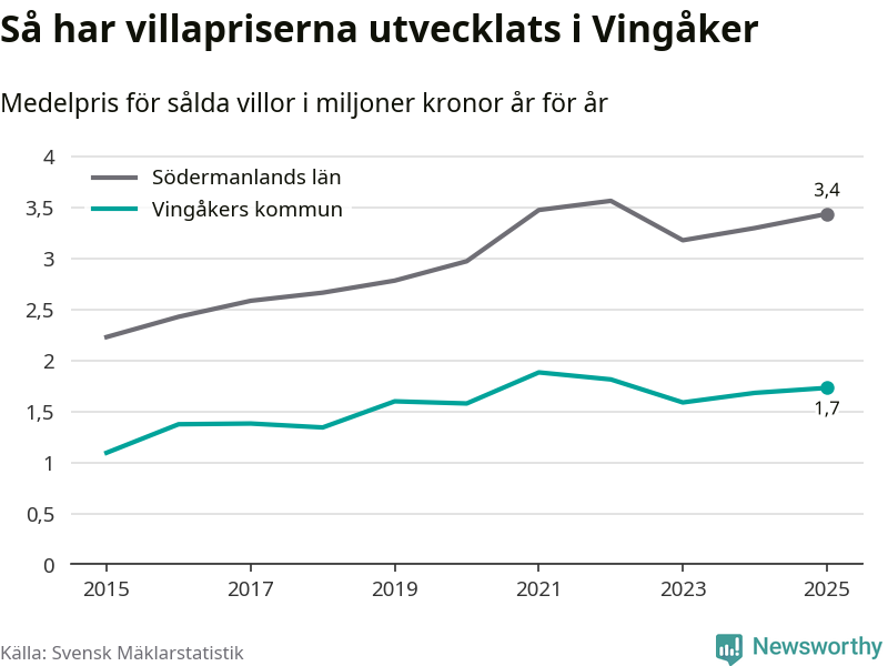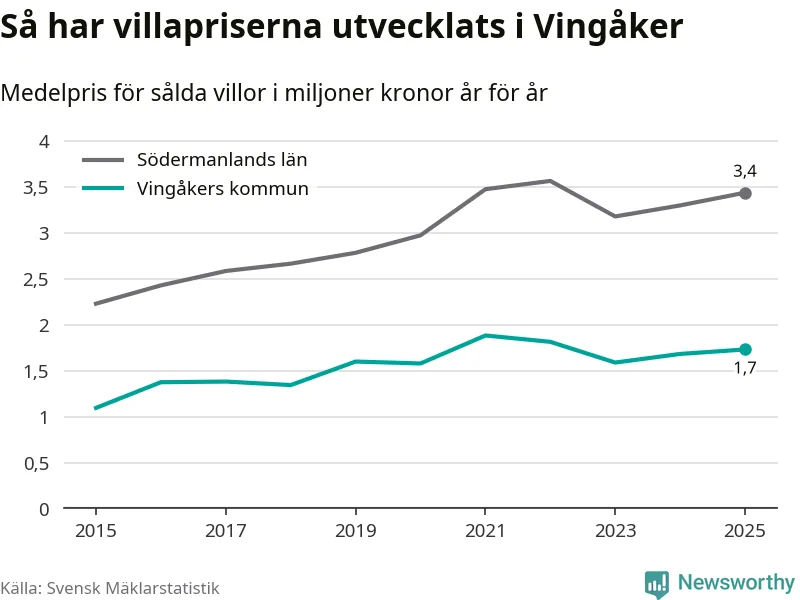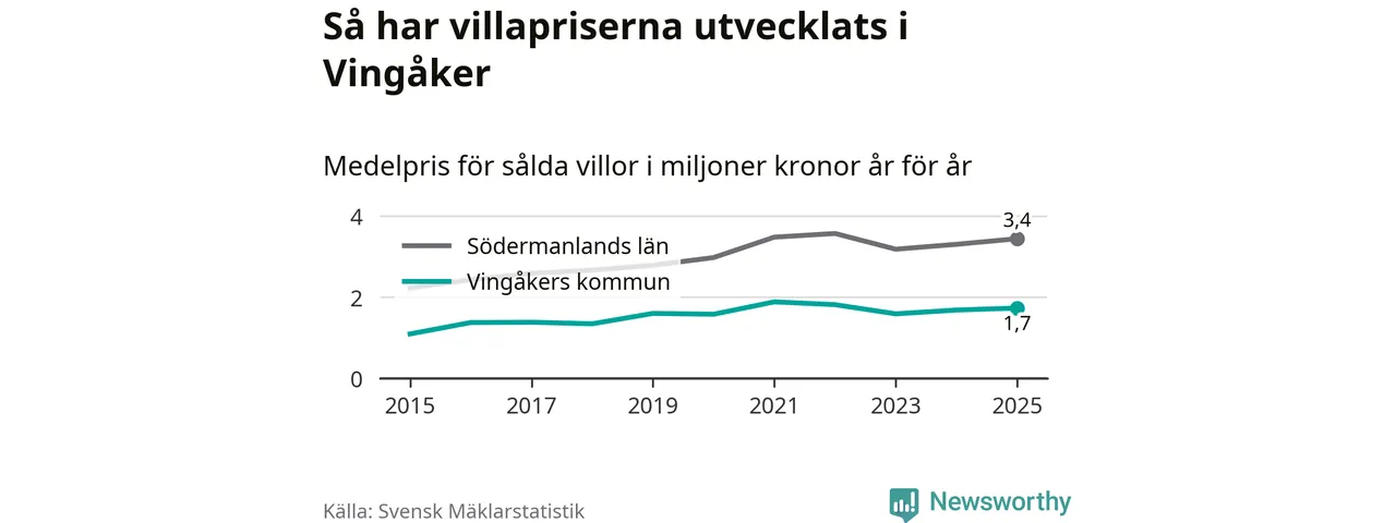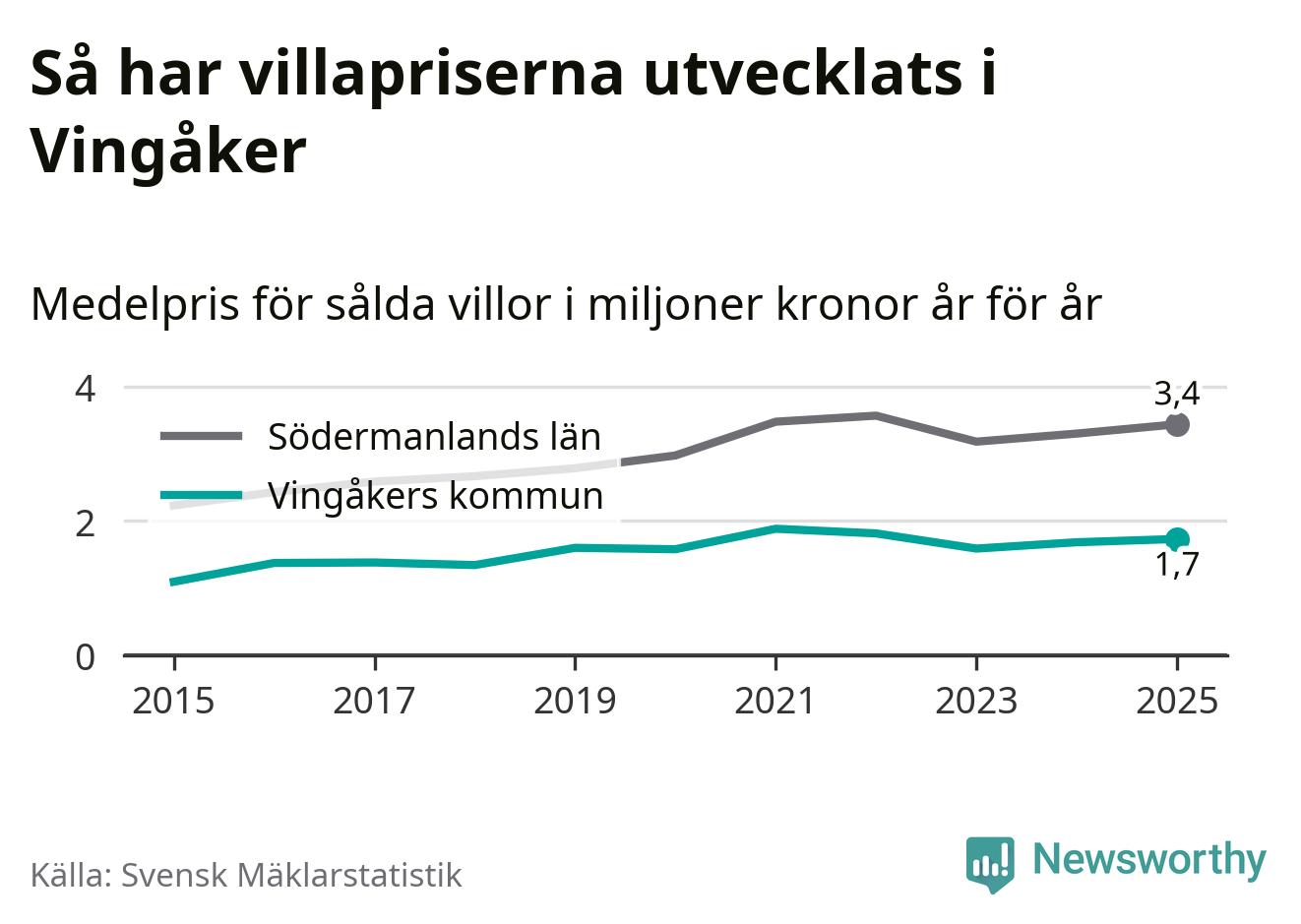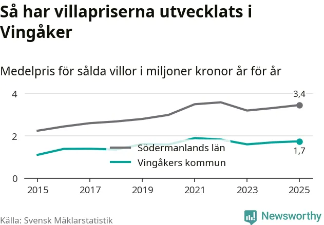 1,7 miljoner kronor är medelpriset för de villor som såldes i Vingåkers kommun under året, eller 14 996 kronor per kvadratmeter. Det innebär en prisökning med tre procent på ett år och är andra året i rad som priserna ökar i kommunen.