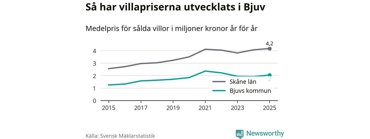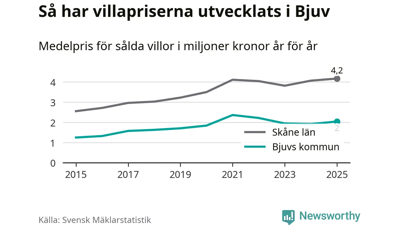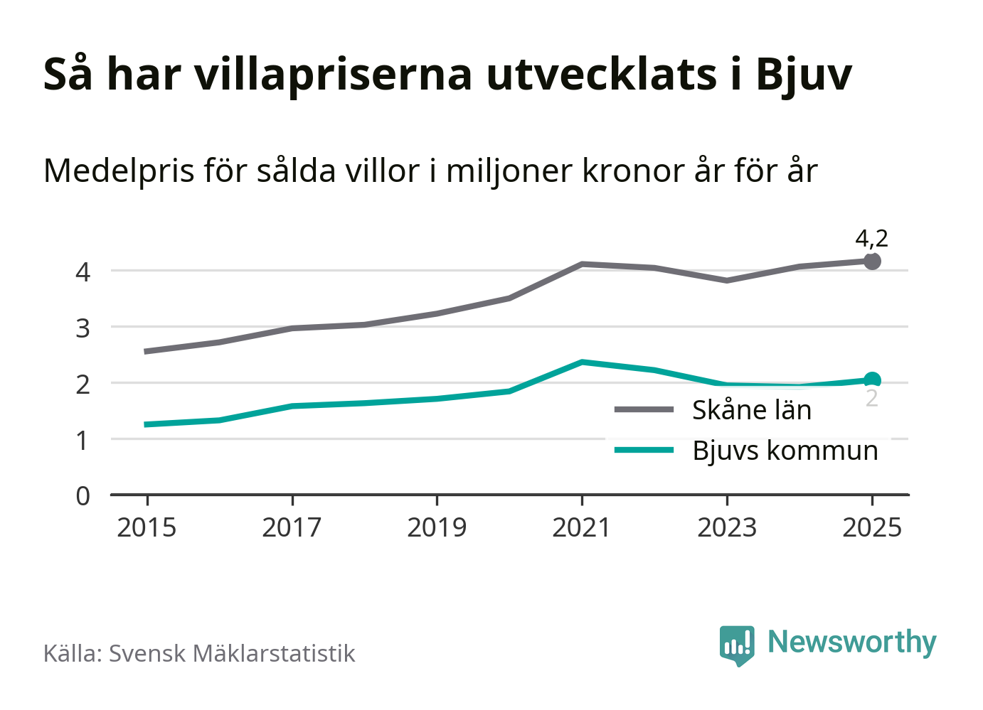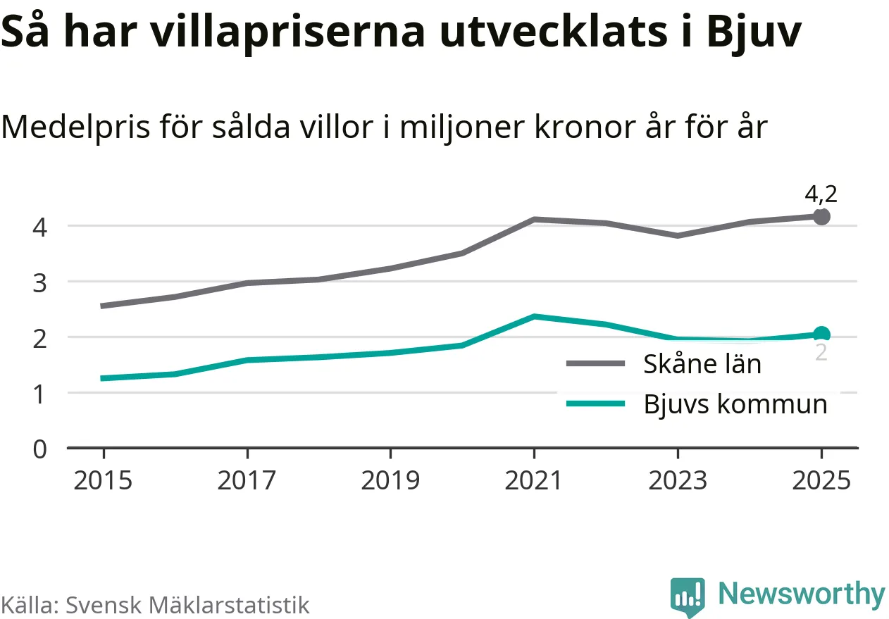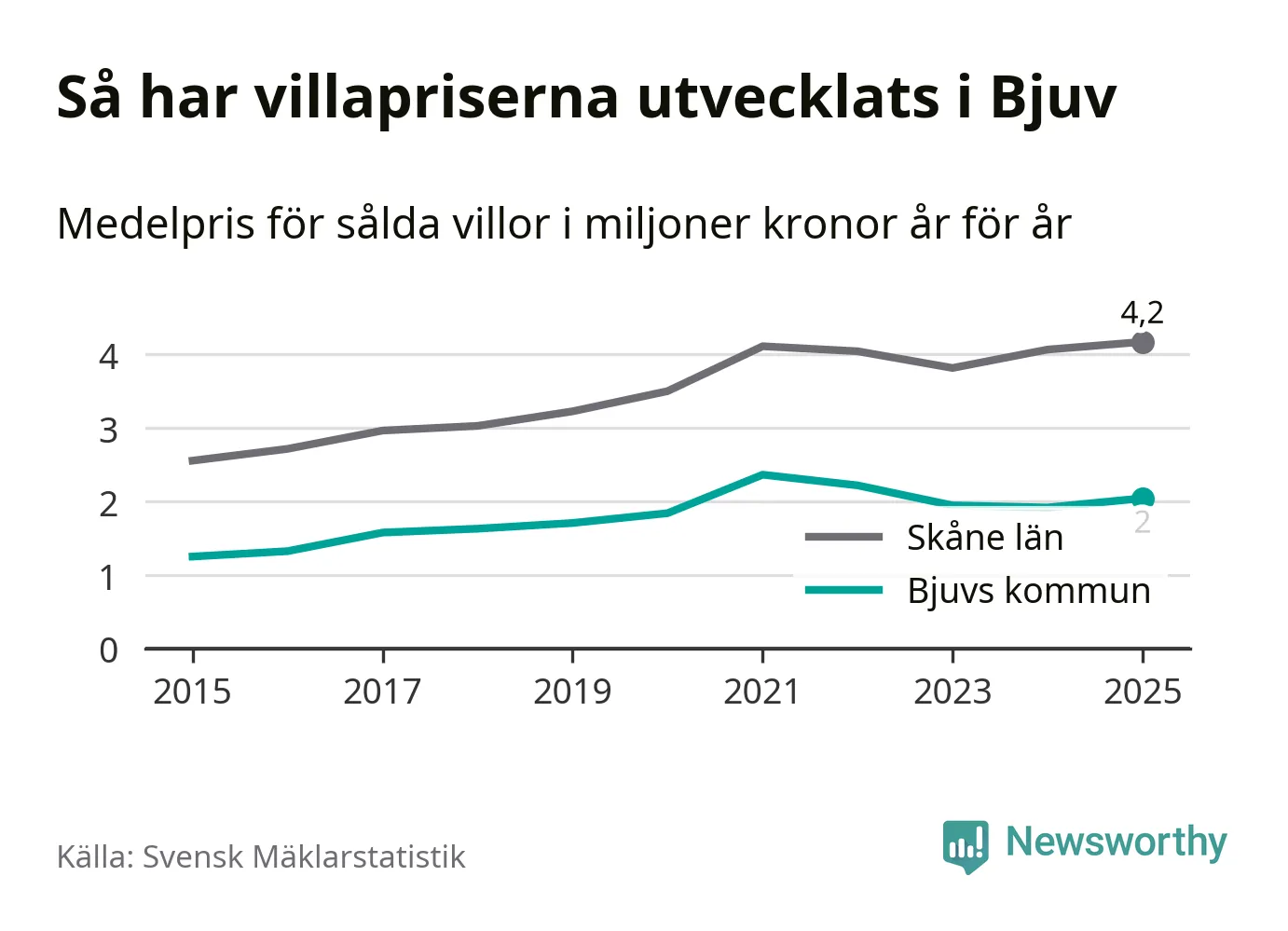 Två miljoner kronor är medelpriset för de villor som såldes i Bjuvs kommun under året, eller 16 580 kronor per kvadratmeter. Det innebär en prisökning med sju procent på ett år.