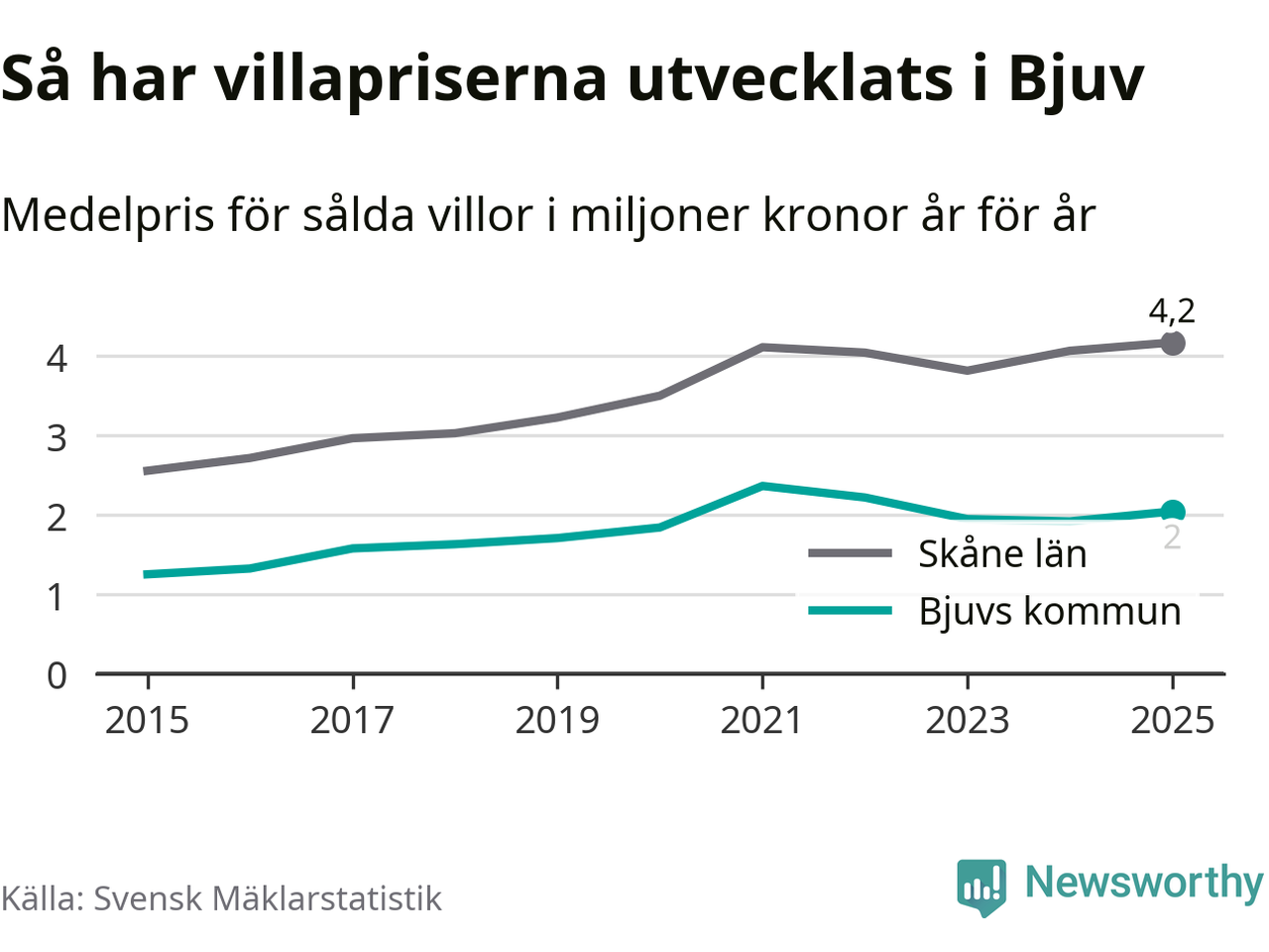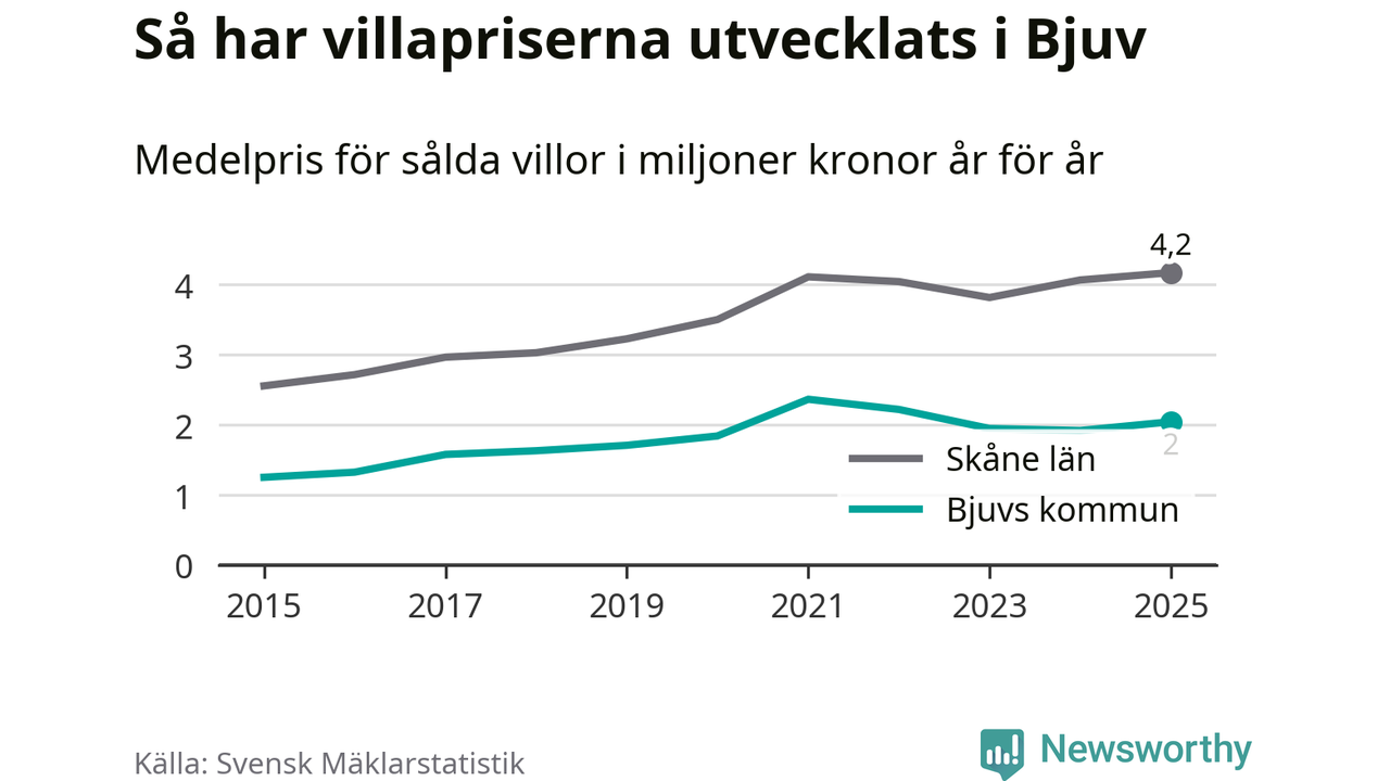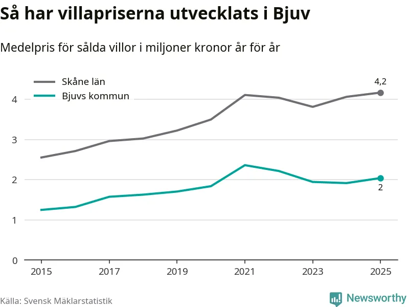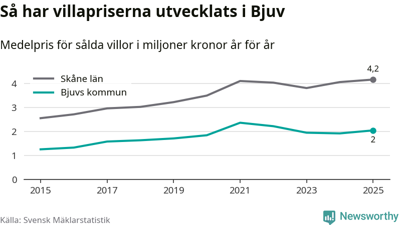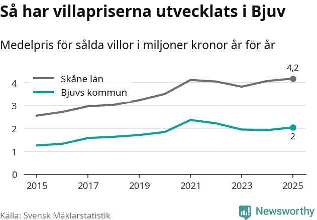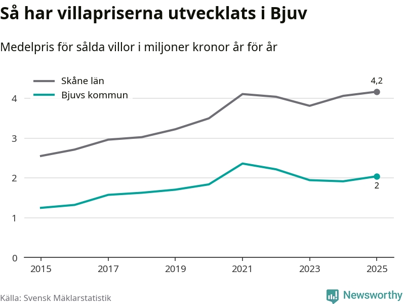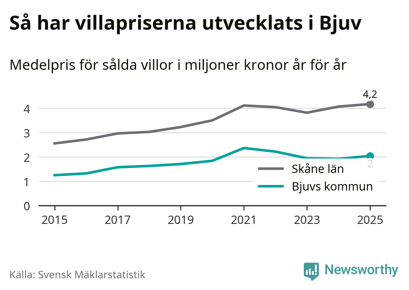 Två miljoner kronor är medelpriset för de villor som såldes i Bjuvs kommun under året, eller 16 580 kronor per kvadratmeter. Det innebär en prisökning med sju procent på ett år.