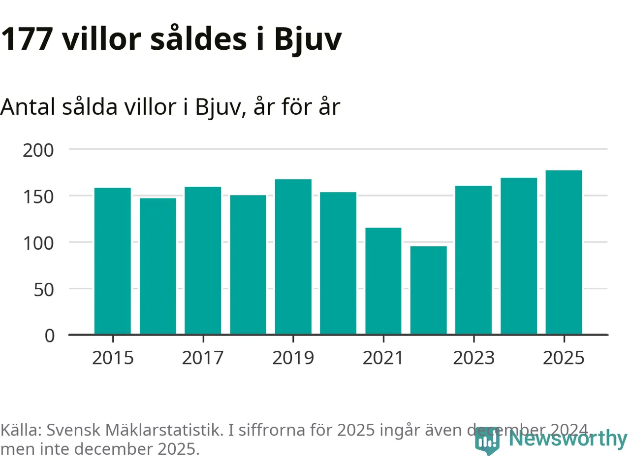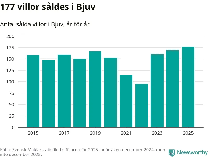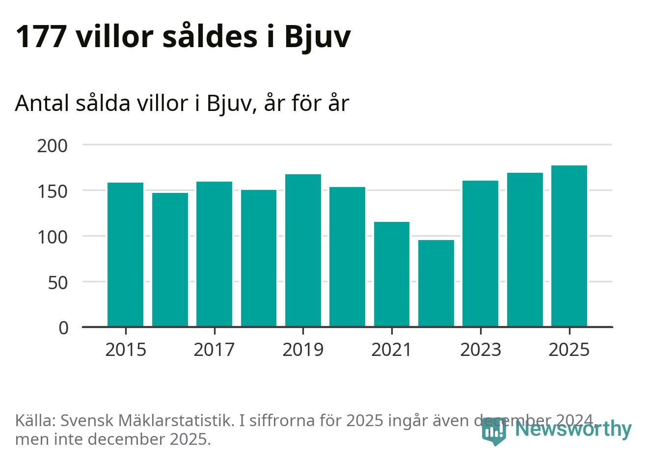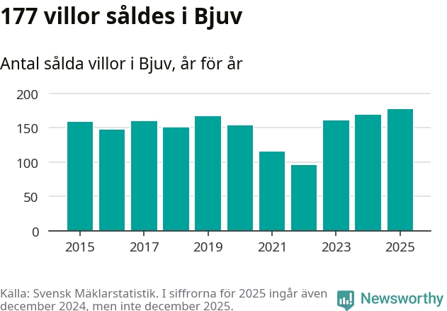 Antalet sålda villor ökade också. Totalt såldes 177 villor, att jämföra med 169 under 2024. Det är fler än något annat år sedan 2015.
