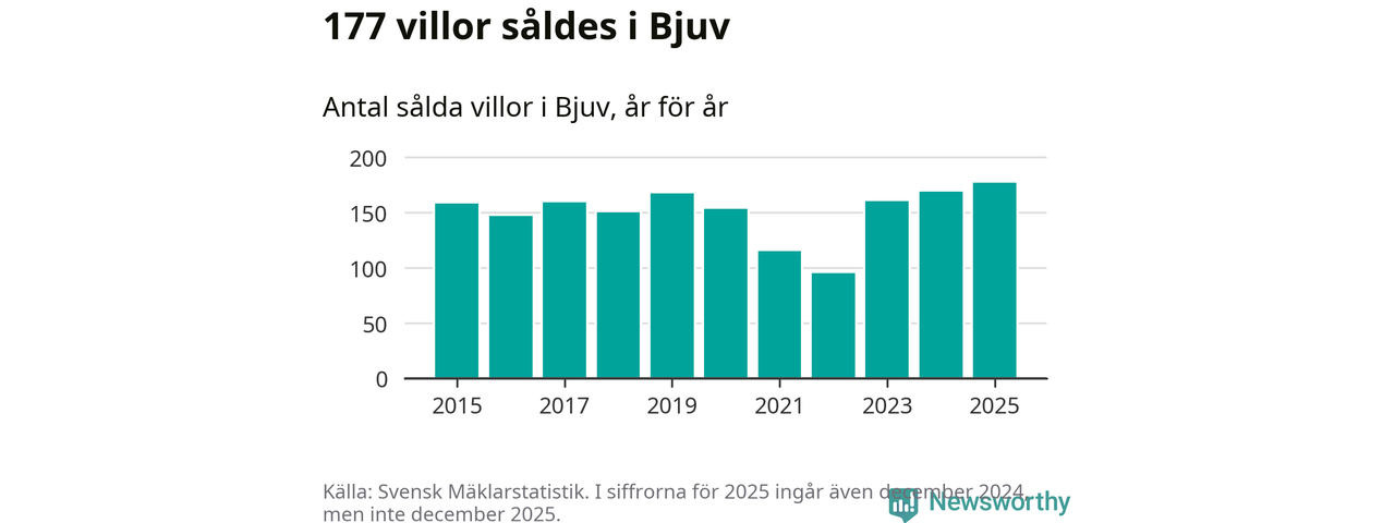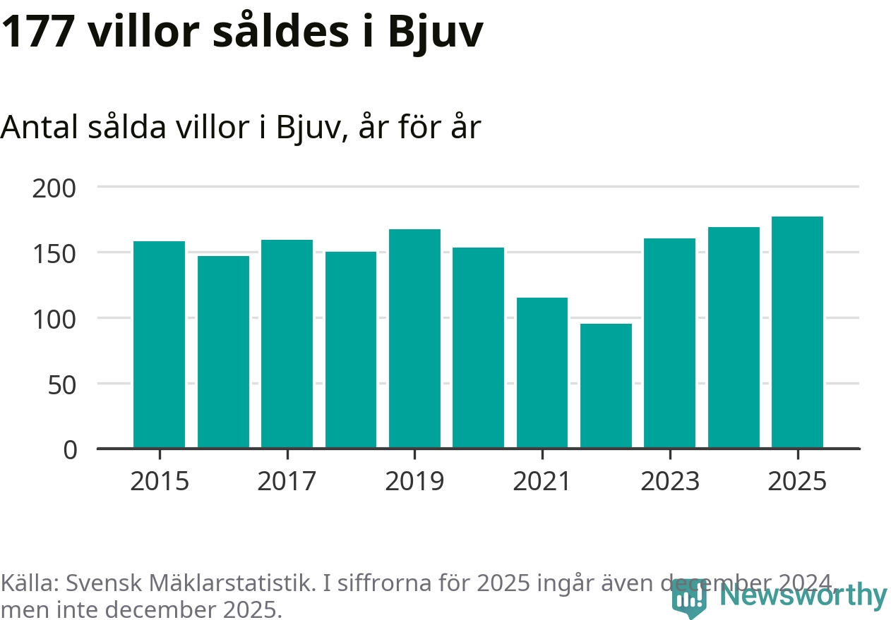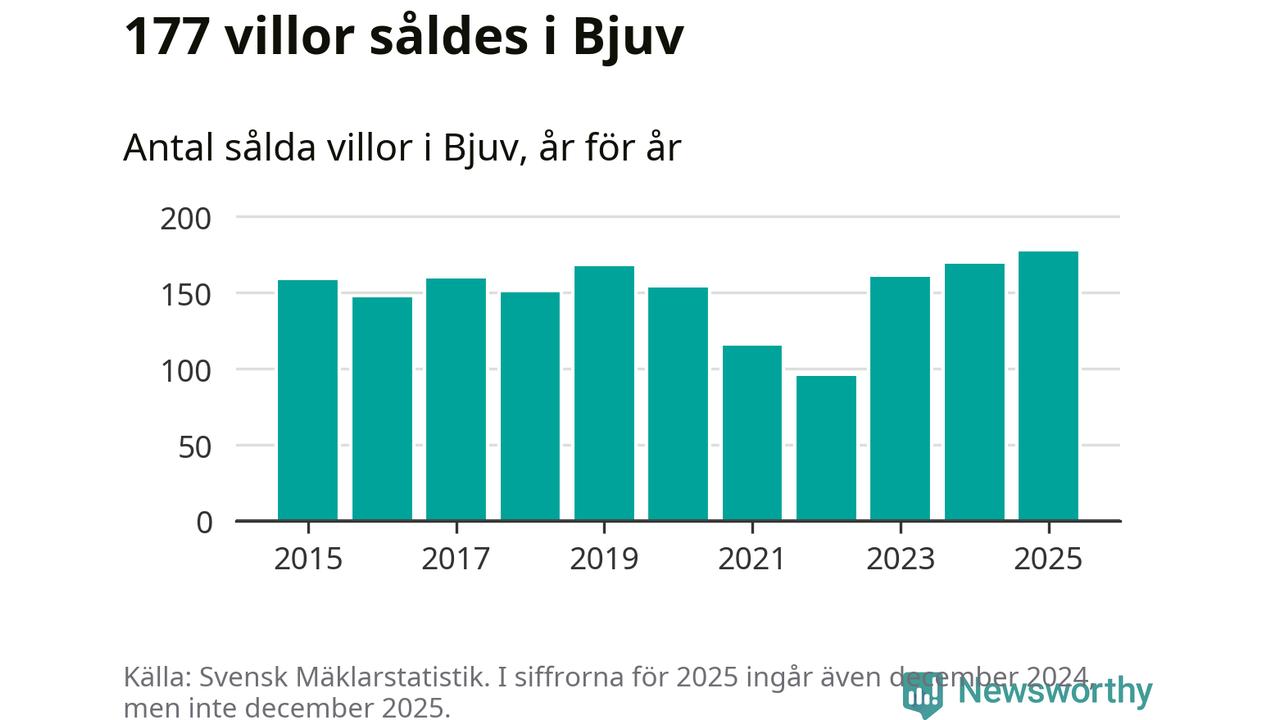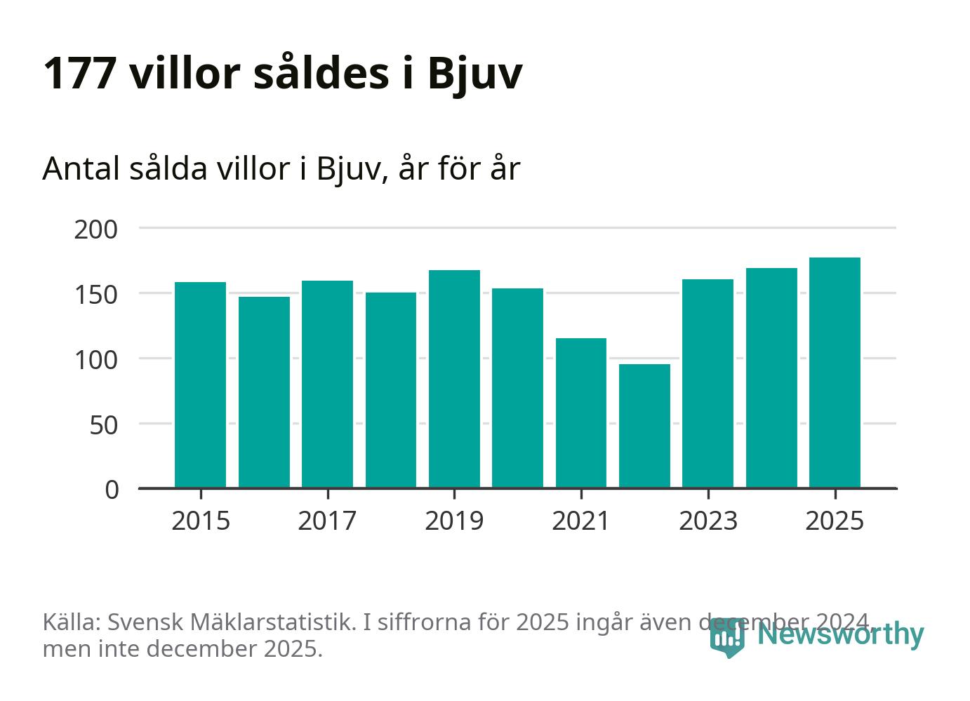 Antalet sålda villor ökade också. Totalt såldes 177 villor, att jämföra med 169 under 2024. Det är fler än något annat år sedan 2015.
