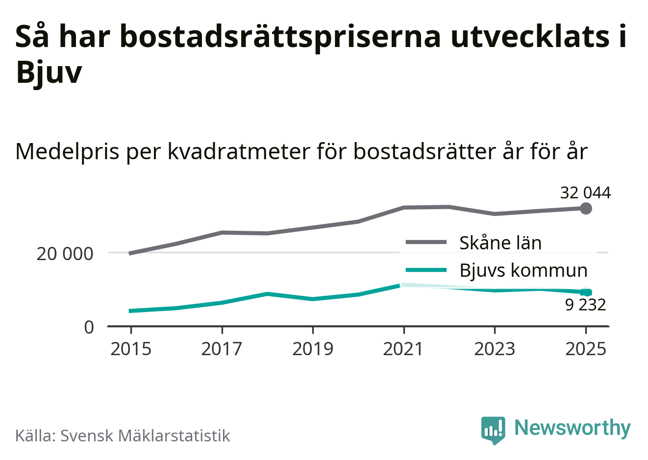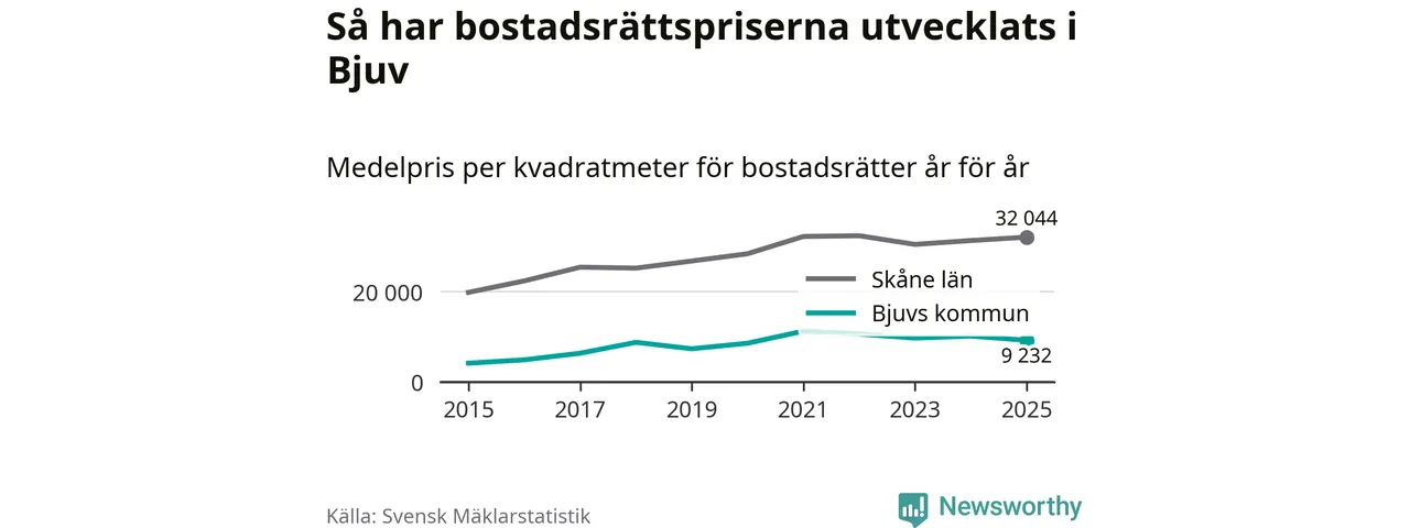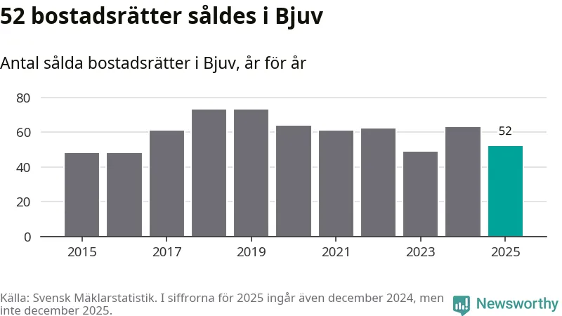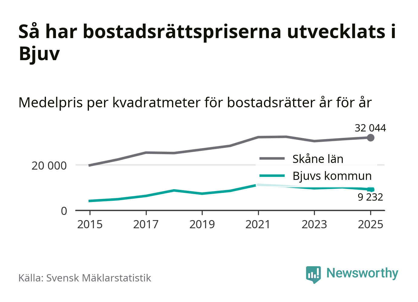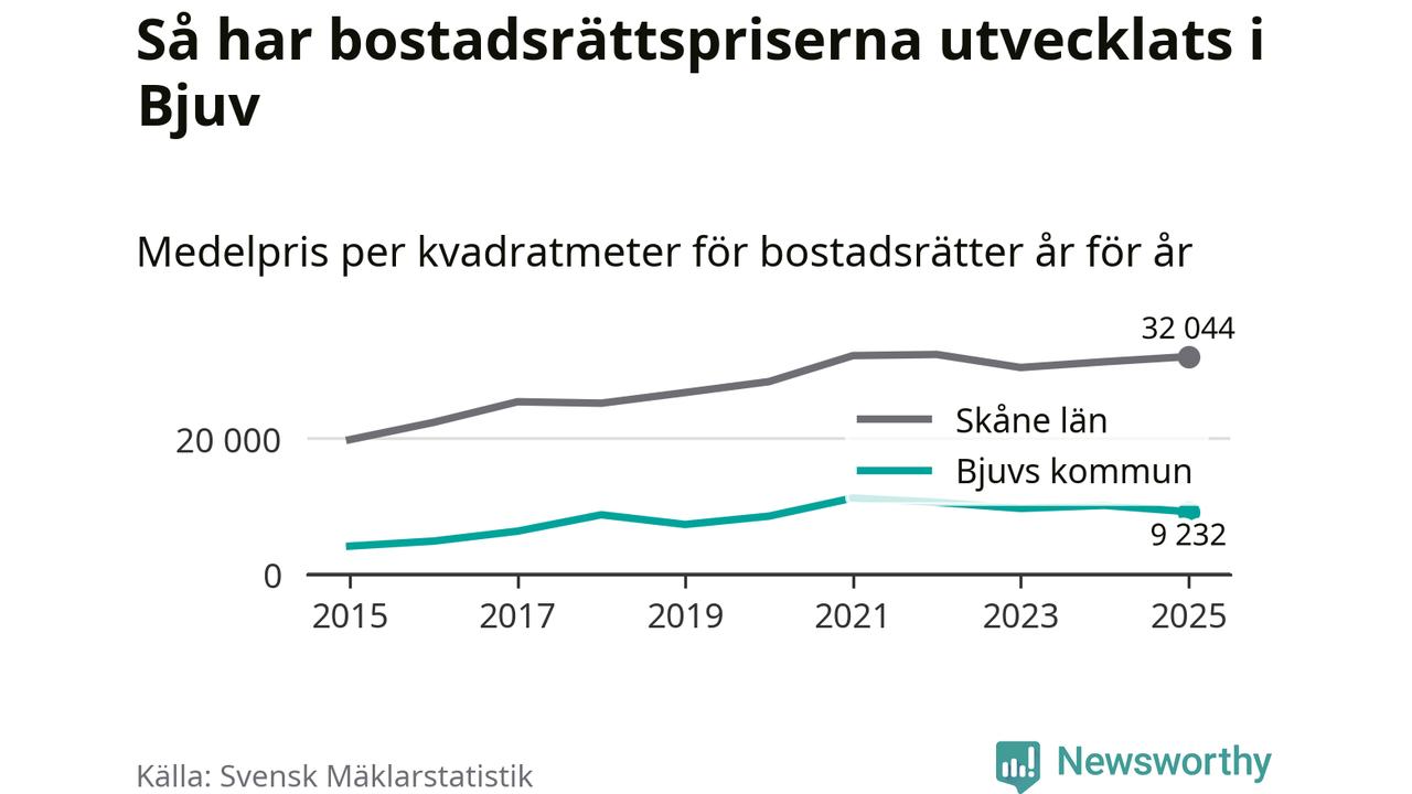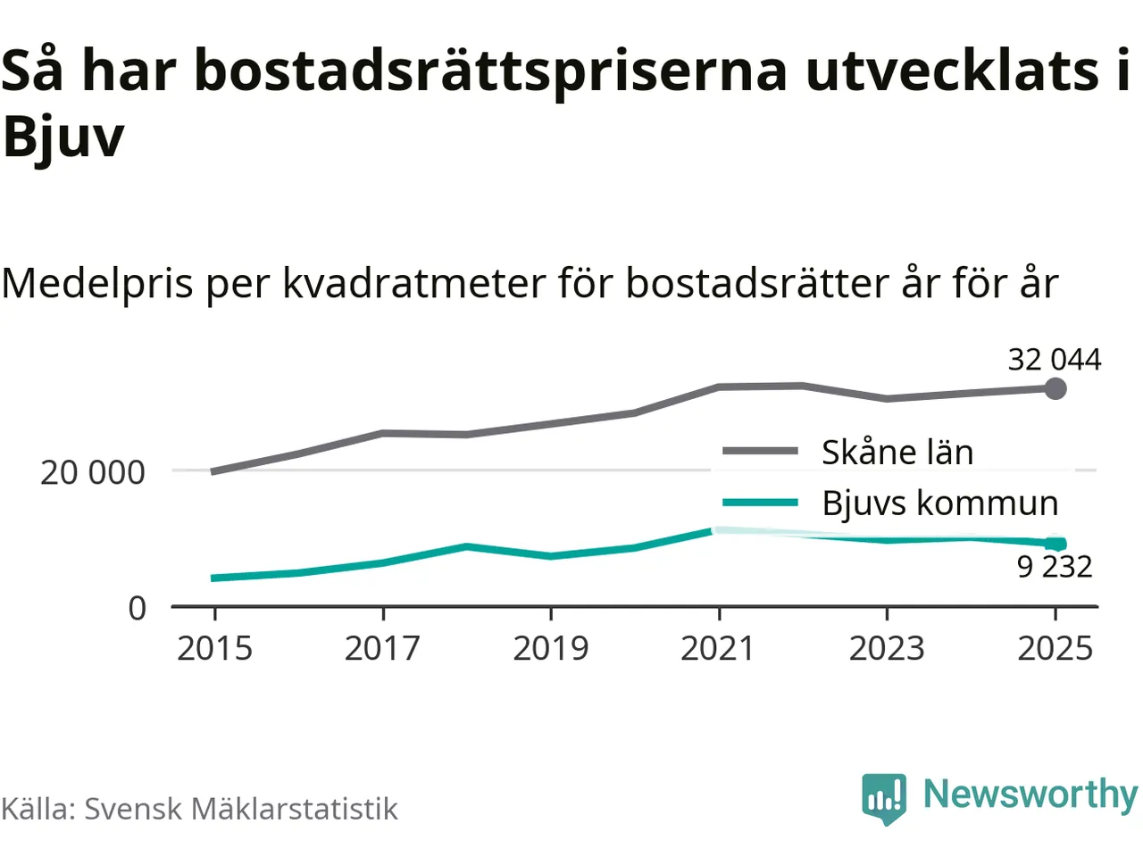 Det såldes totalt 52 bostadsrätter i Bjuvs kommun under året. Genomsnittspriset per kvadratmeter landade på 9 232 kronor. Det är en minskning med nio procent i kommunen på ett år.